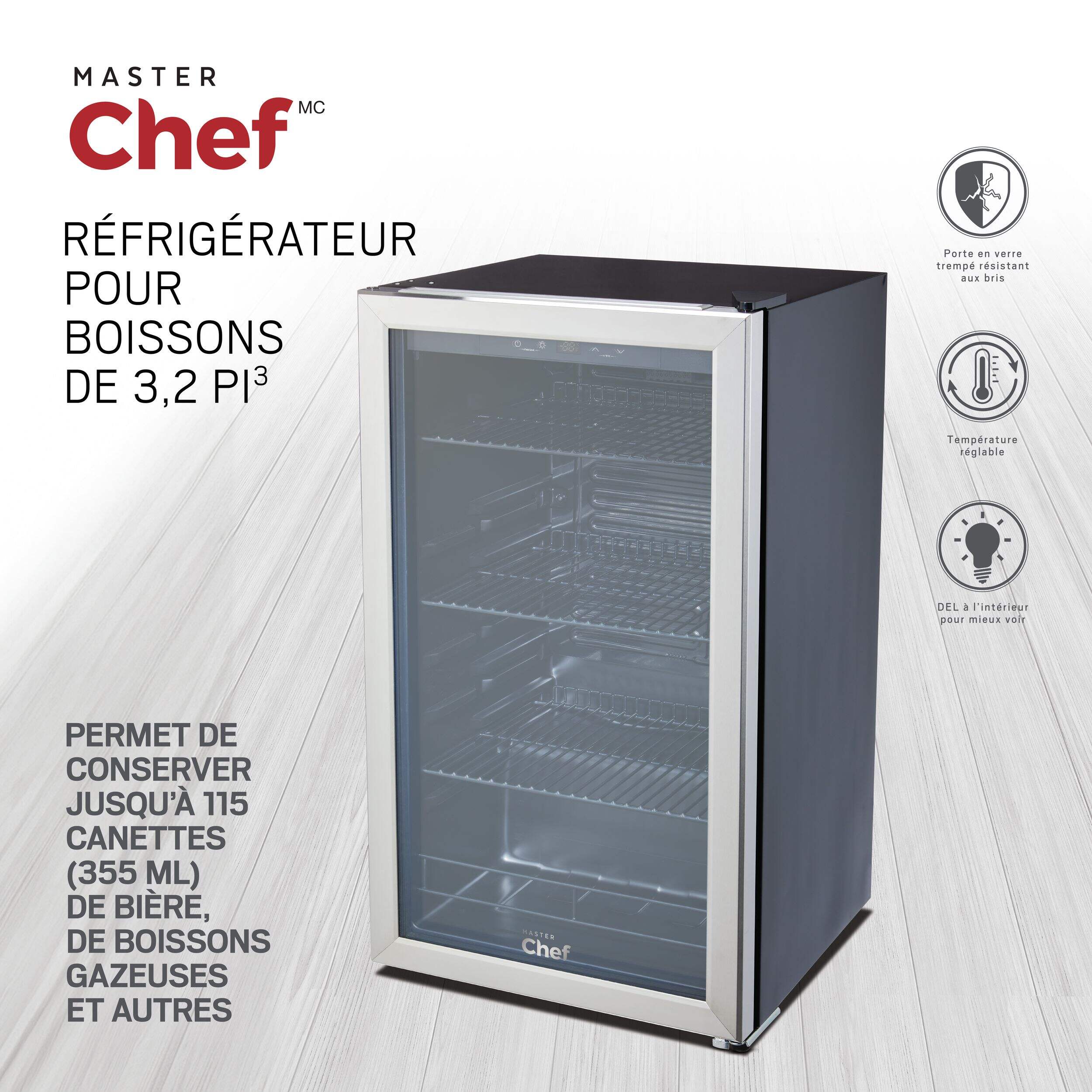 • Réfrigérateur à boissons Master Chef, 115 canettes, offrant un espace de 3,2 pi3 pour stocker 115 canettes ou bouteilles de bières, de boissons gazeuses, de vin et plus encore