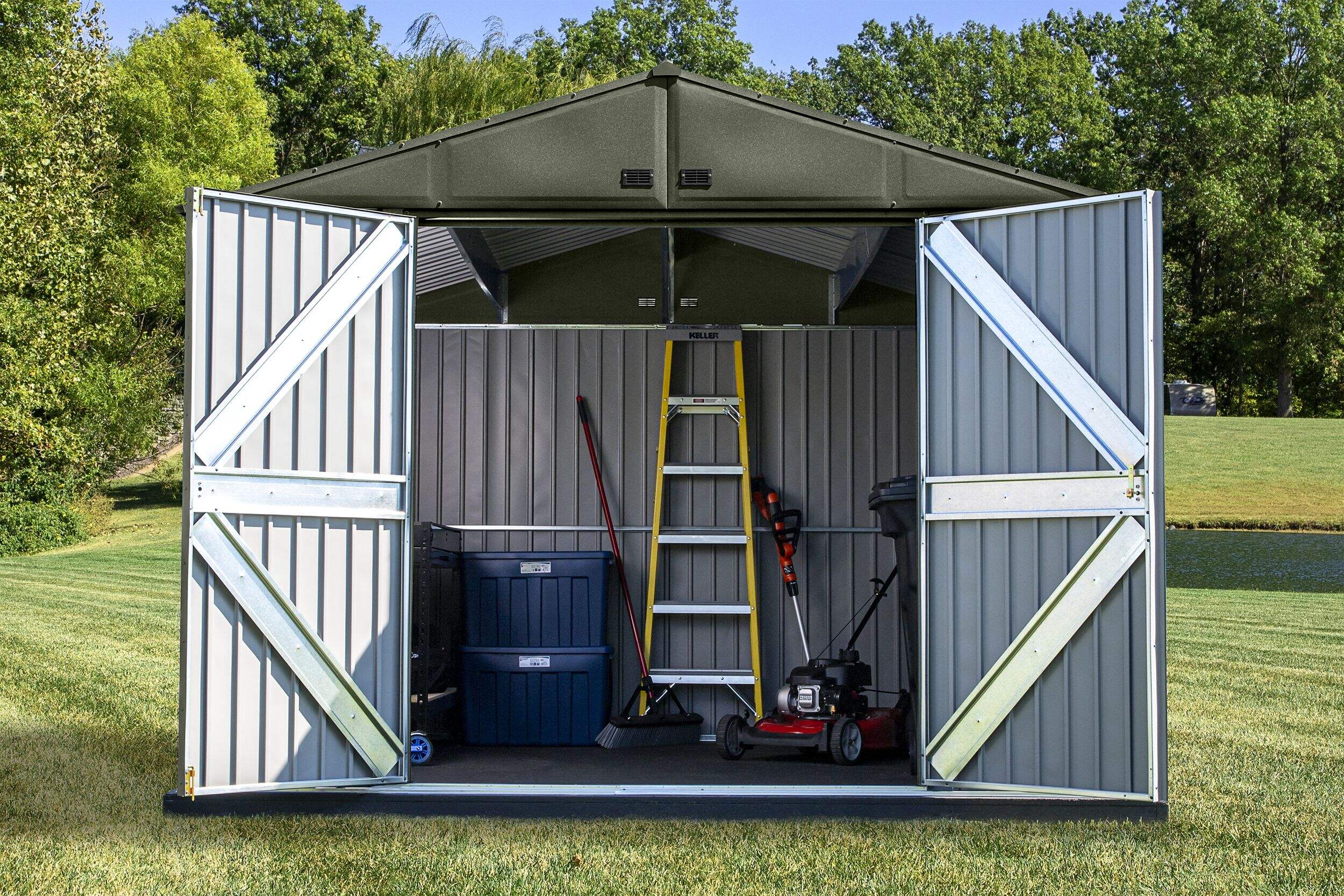 Portes battantes renforcées et robustes dotées d'une poignée carrée en nickel brossé avec un cadenas à clé pour protéger vos articles lorsque vous n'en avez pas besoin