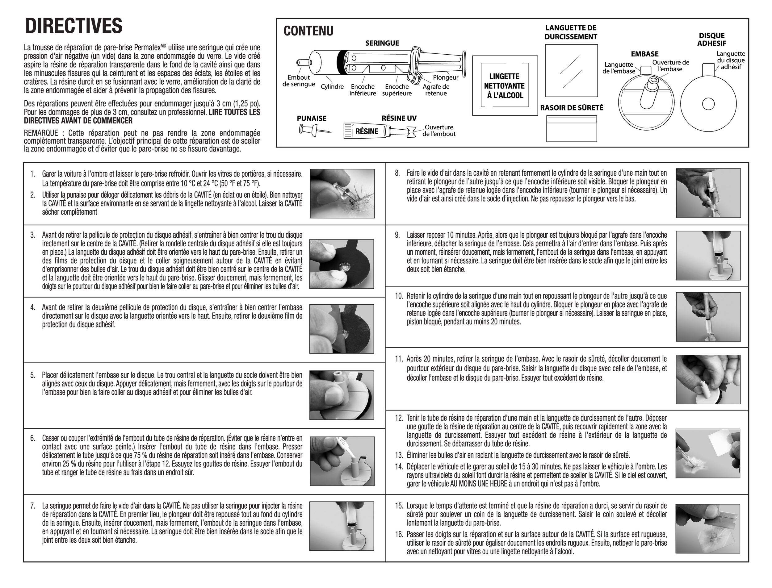 Le réparateur de pare-brise Permatex Bullseye est le premier système de réparation de pare-brise à un composant conçu pour le propriétaire de la voiture. Peut être utilisé pour réparer les trous d'un diamètre allant jusqu'à 1 1/4 po sur la plupart des pare-brise en verre feuilleté. Trousse tout-en-un sécuritaire et facile à utiliser qui ne nécessite aucun mélange ni chaleur.