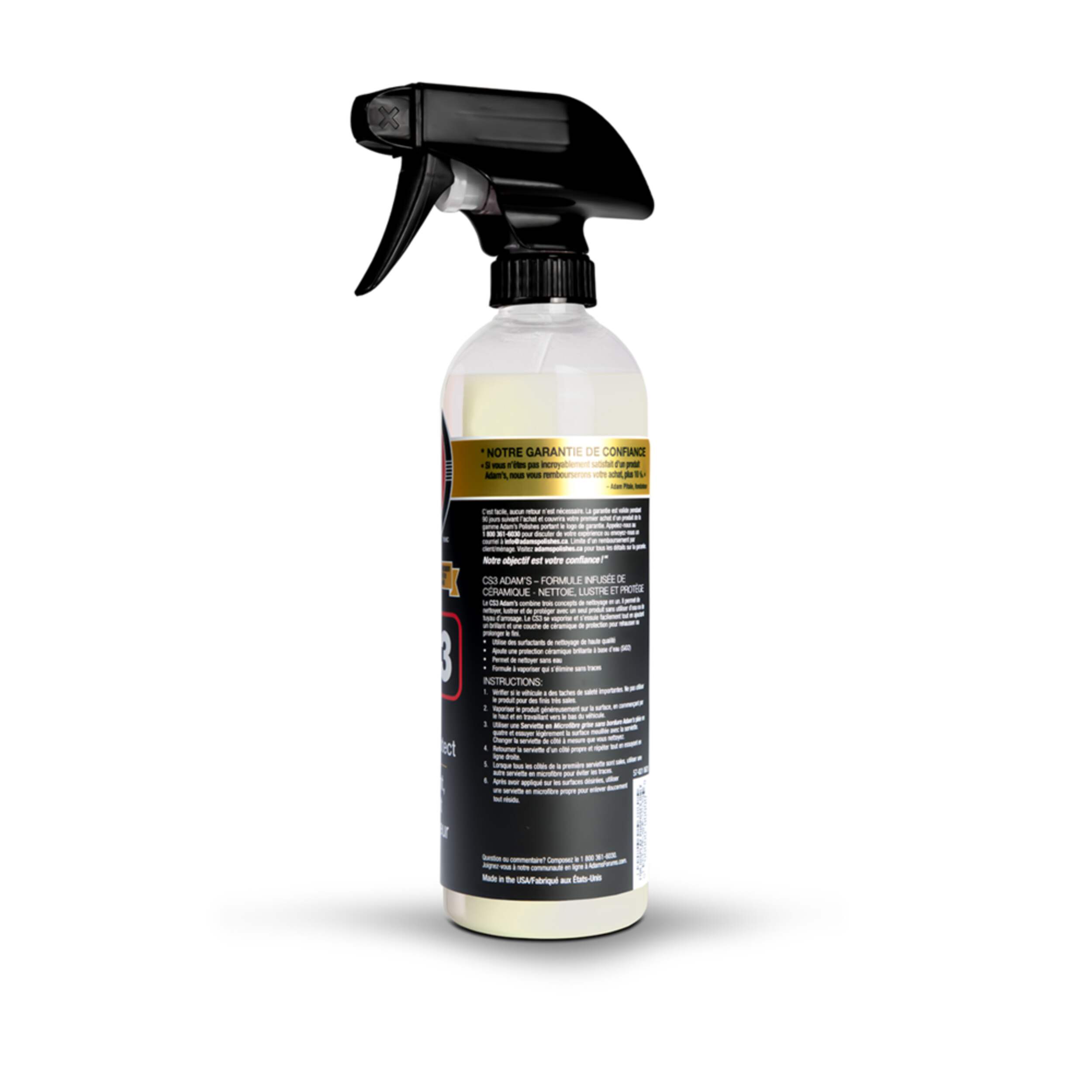 Adam's Polishes CS3 offre une solution complète d'entretien automobile avec son vaporisateur de lavage et de cire sans eau, son polissage et sa brillance, et son vaporisateur hydrophobe à base d'eau pour les revêtements céramiques, tous combinés dans un seul vaporisateur d'entretien facile à utiliser. La formule de pointe infusée de silice produit efficacement une surface propre et polie tout en éliminant la saleté, la poussière, la graisse, la crasse et d'autres contaminants, sans endommager la peinture ou les jantes de votre voiture. Notre formule novatrice de tensioactifs et de lubrifiants nettoie, fait briller et protège en une seule étape. Il suffit de vaporiser et d'essuyer pour améliorer la profondeur, la brillance, la douceur et la clarté de votre couche de finition. Le vaporisateur polyvalent de lavage et d'entretien sans eau trois en un de CS3 laisse vos voitures, motos, bateaux ou véhicules de loisirs immaculés, brillants et protégés.