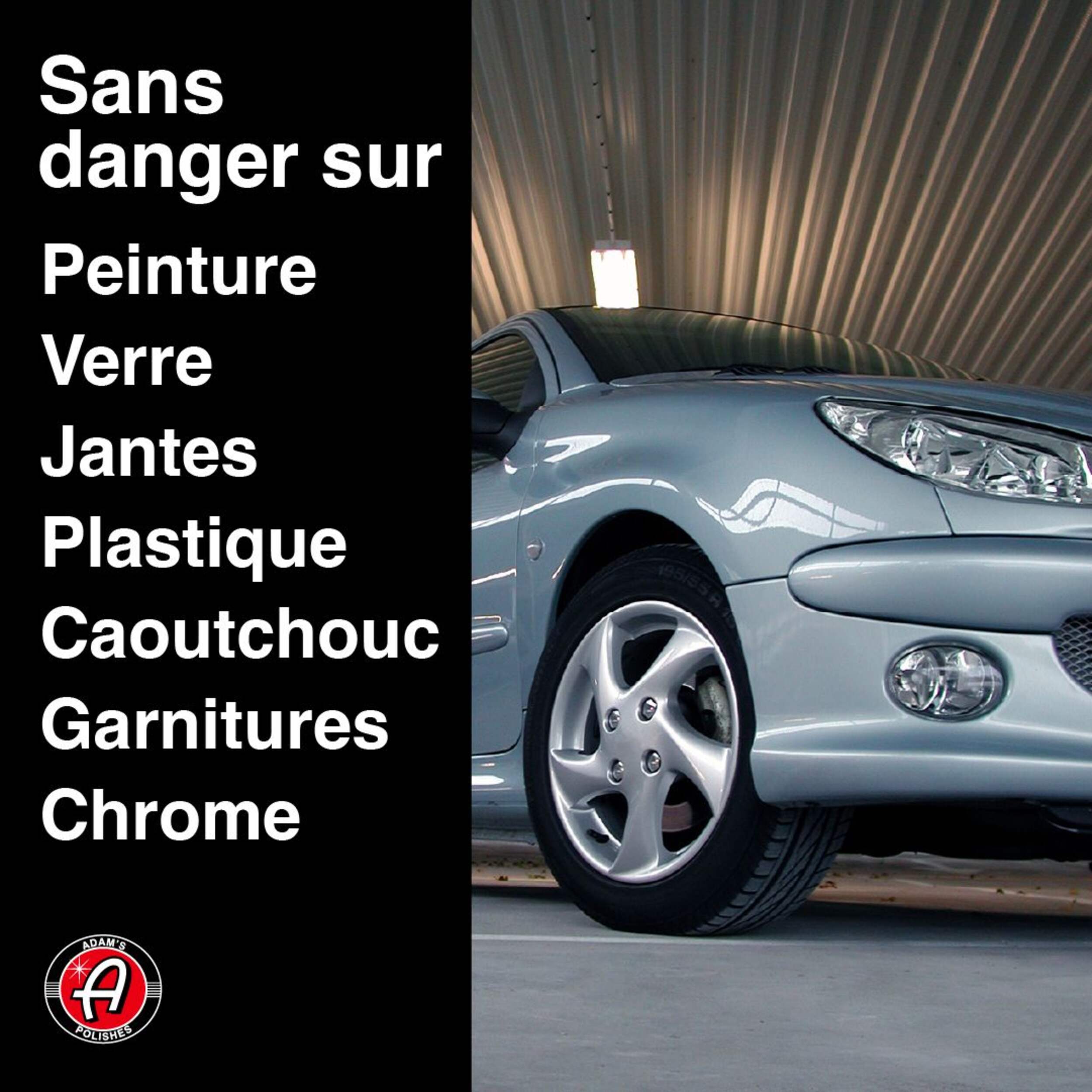 Peut être utilisé en toute sécurité sur toutes les surfaces extérieures des voitures, qu'elles soient revêtues ou non : peinture, jantes, verre, chrome, plastique, moulage en caoutchouc et métal.