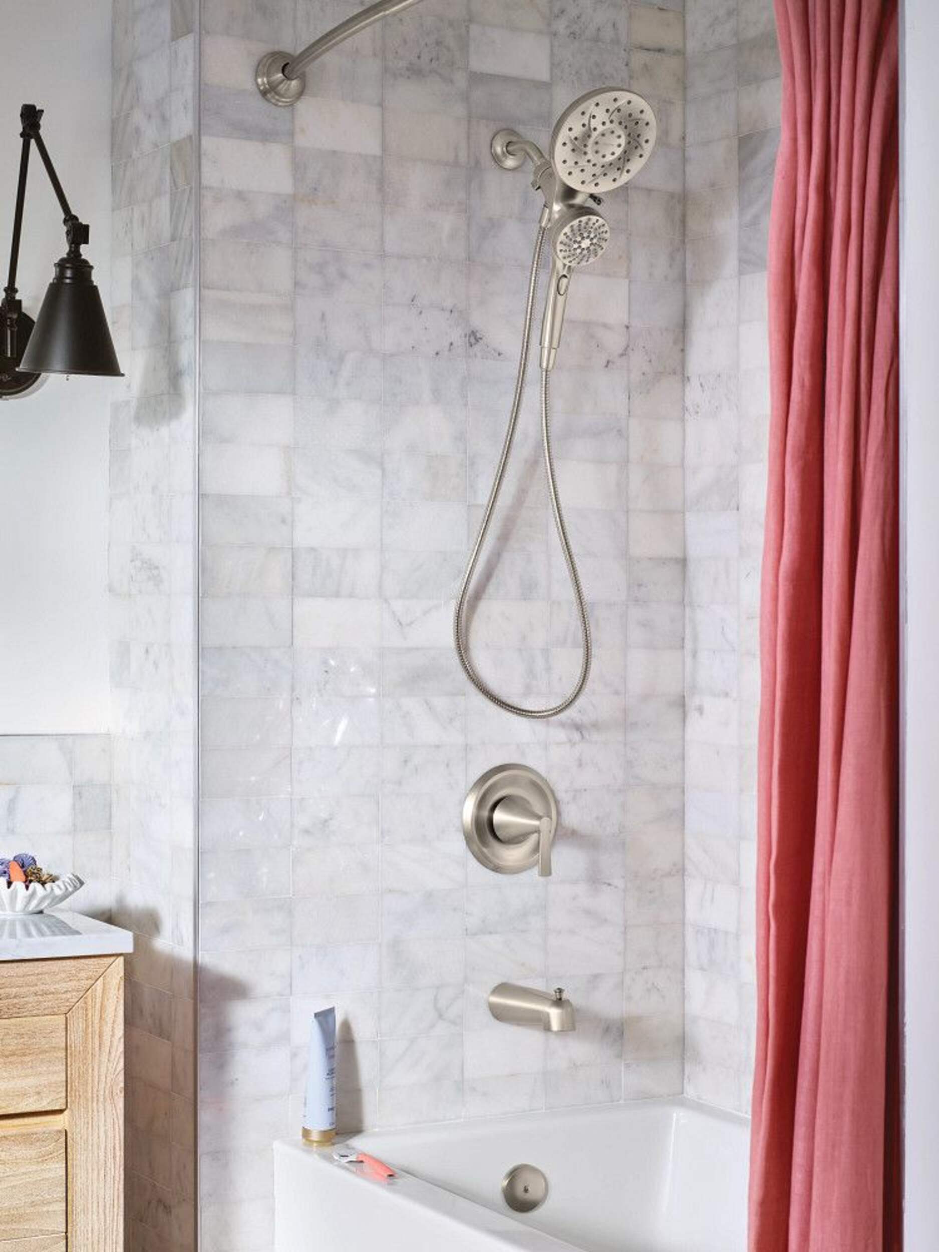 Robinet baignoire-douche Posi-Temp et Magnetix Moen qui est doté d'un fini de nickel brossé Spot Resist résistant aux marques de doigts et aux taches d'eau pour une allure plus propre