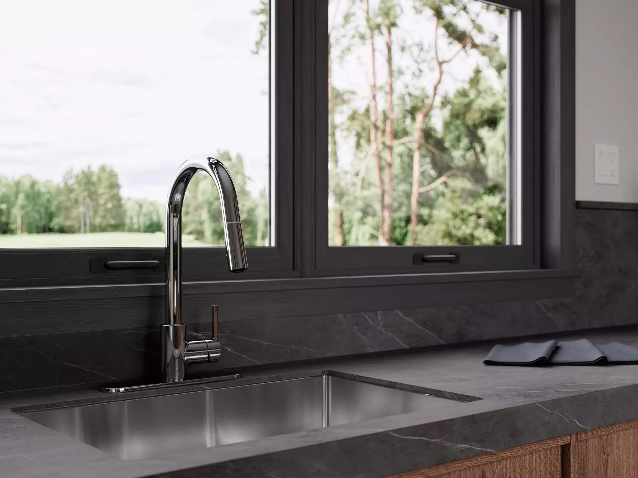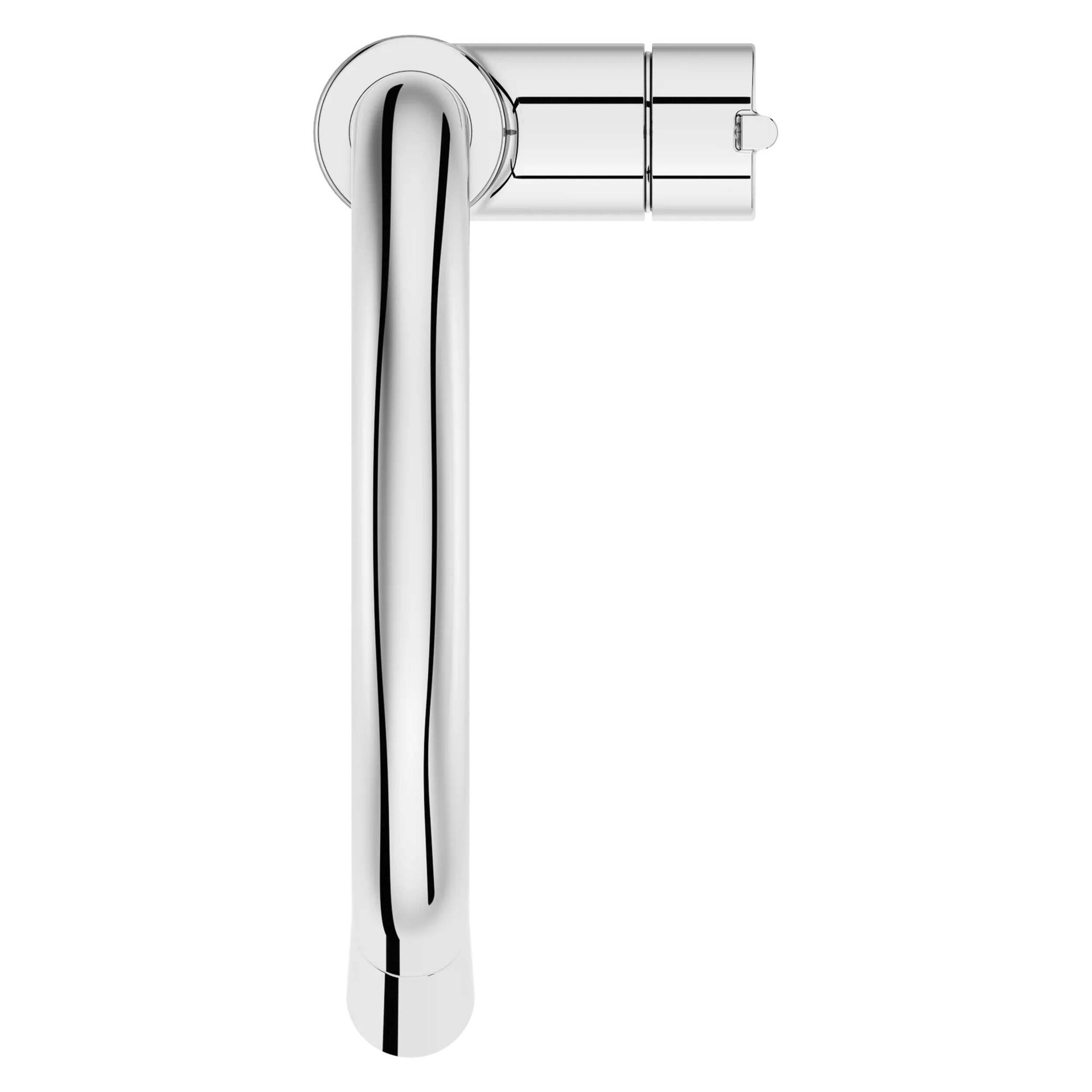 Conception élégante de la poignée avant qui souligne la fonction ergonomique et aide dans les endroits où l'espace derrière le robinet est limité