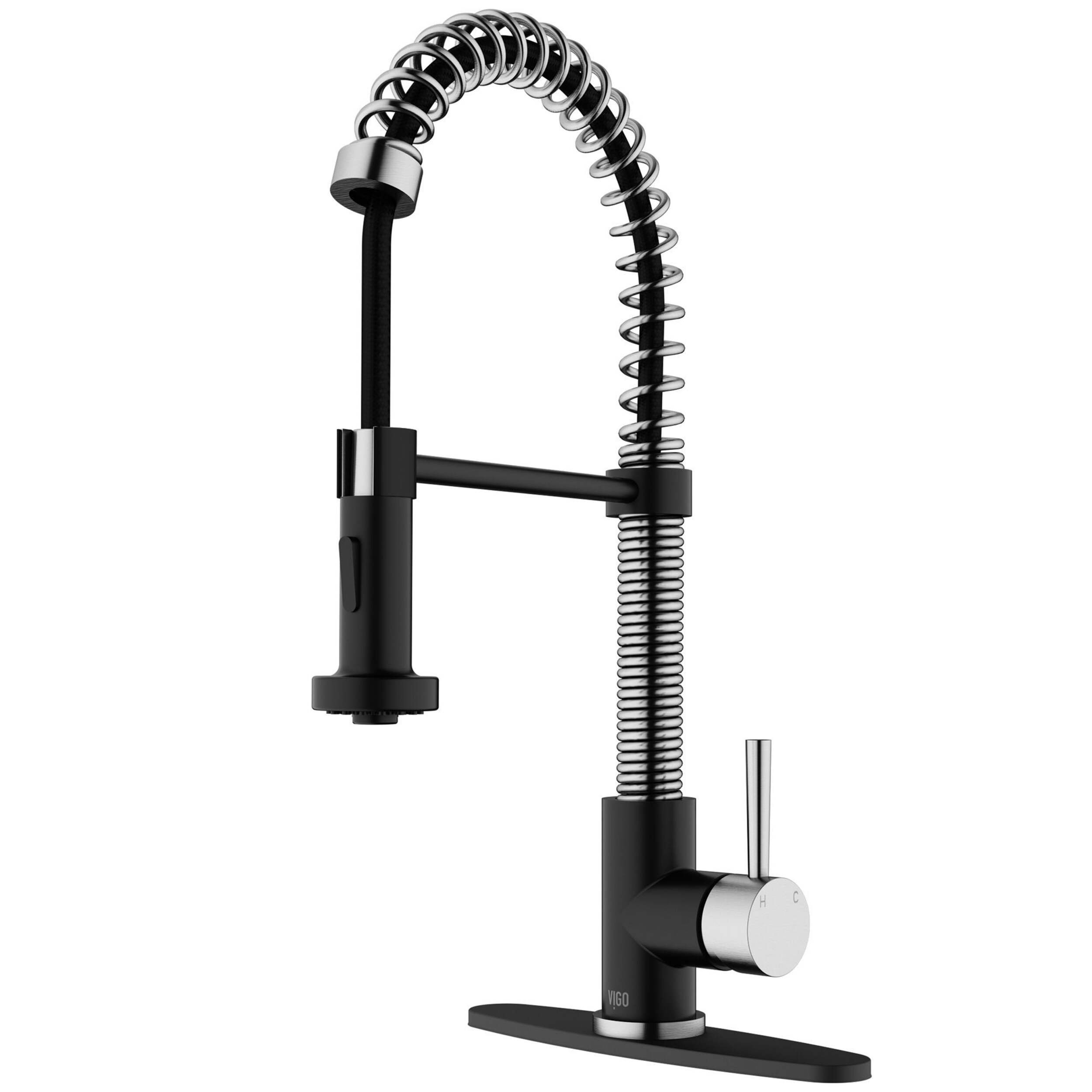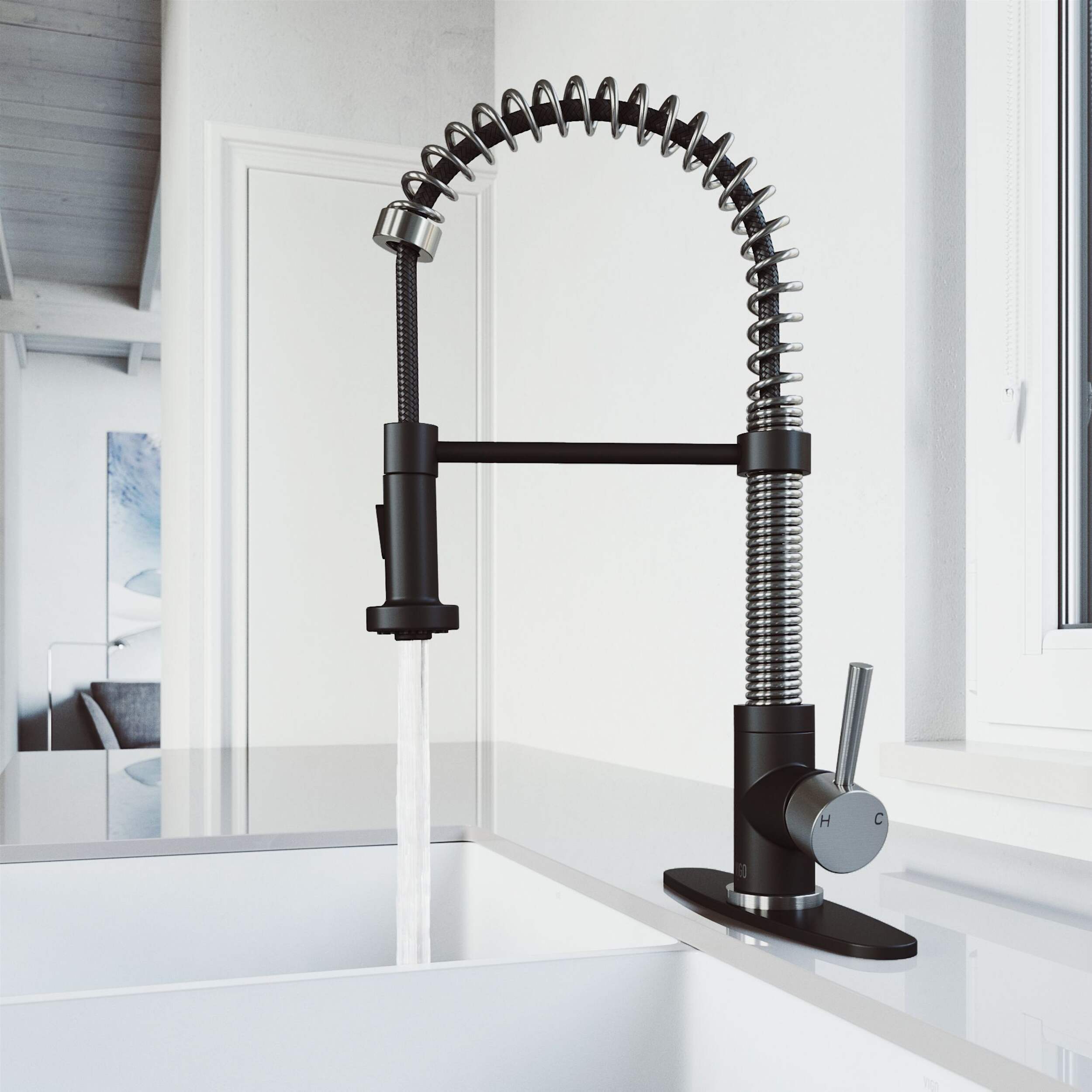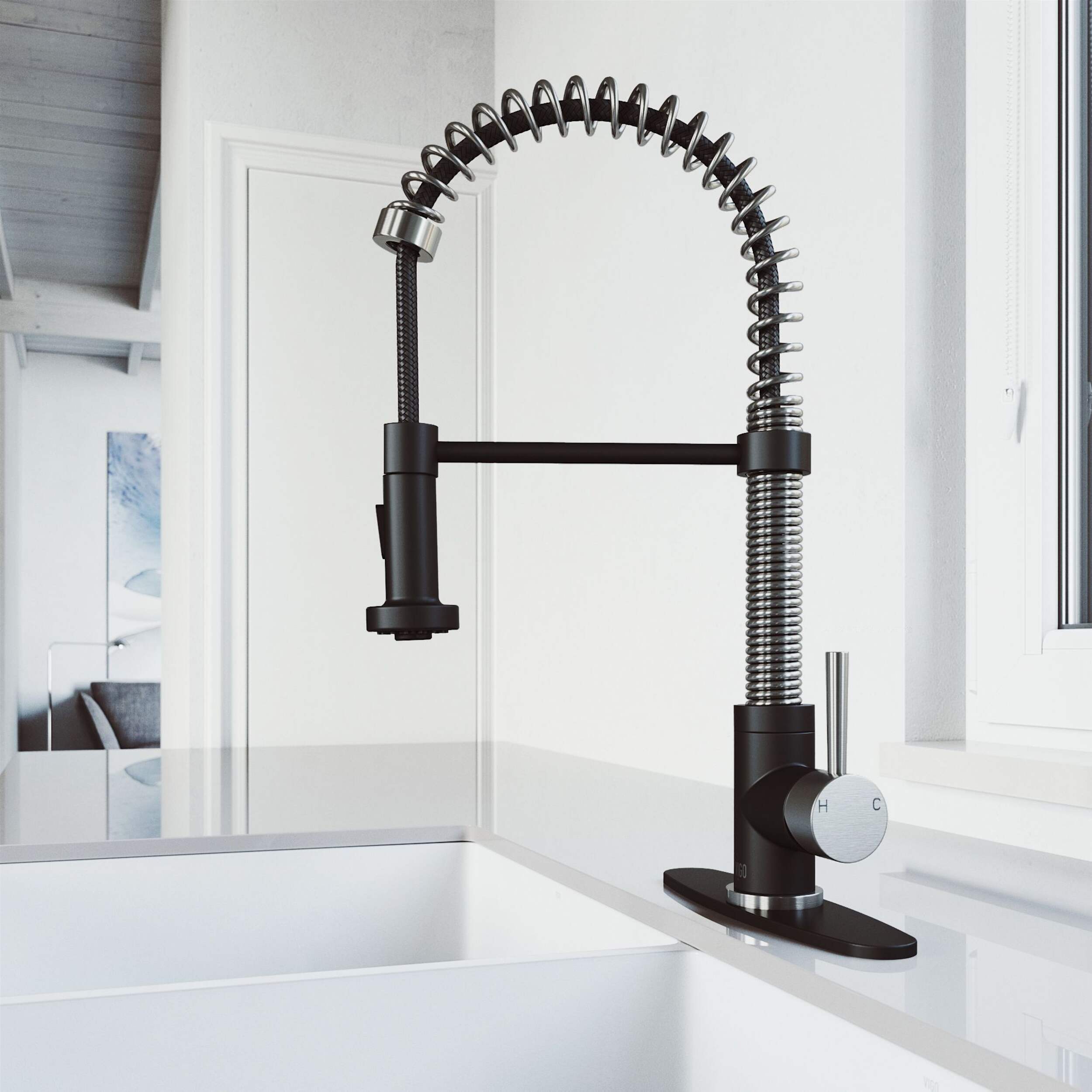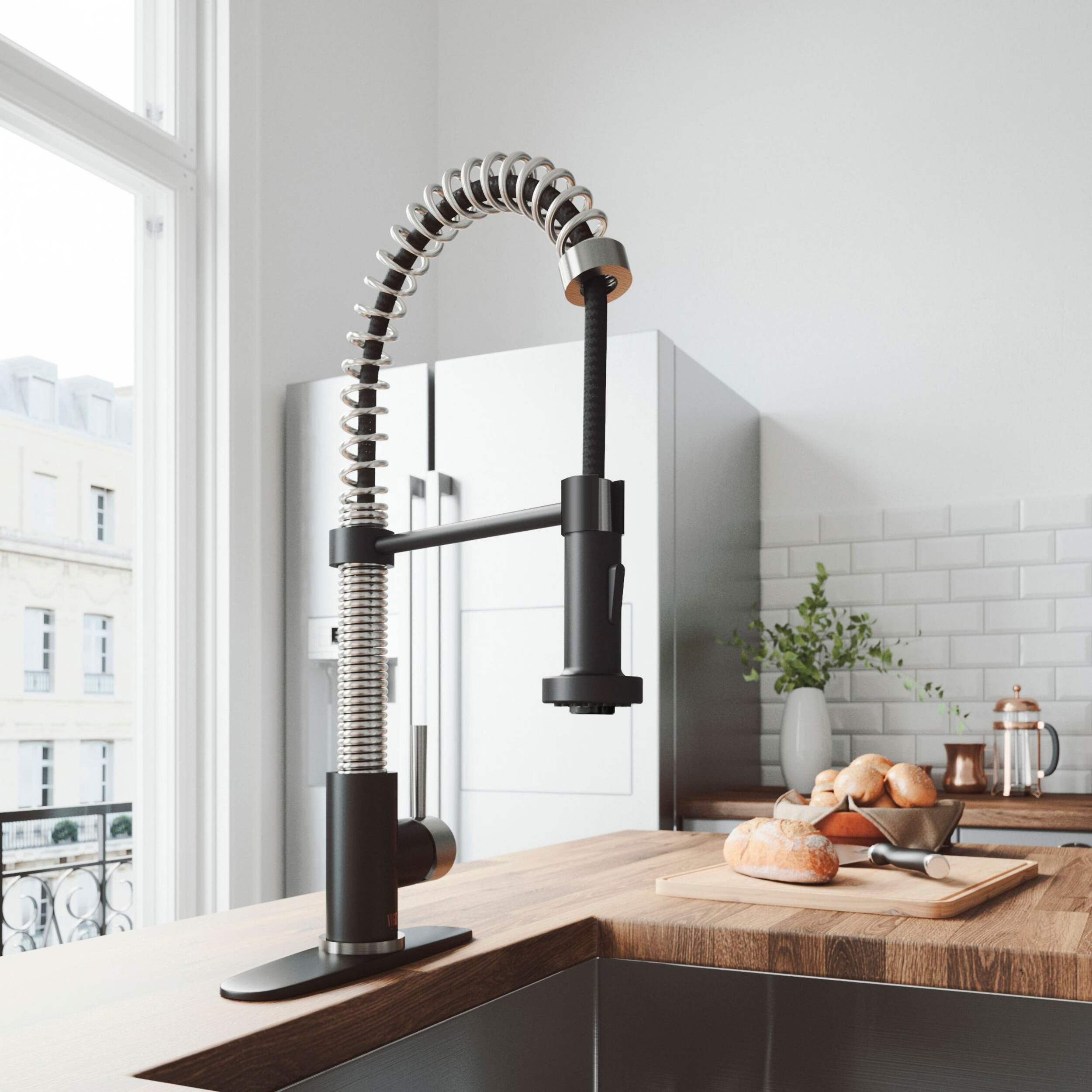 La tête de pulvérisation à tirette avec 2 modes du robinet d'évier à douchette extensible VIGO Edison vous permet de choisir entre un débit aéré ou un jet puissant pour tous vos besoins de cuisine modernes. Le bec pivotant de 360° s'étend jusqu'à 30 po, et ses détails en spirale et sa construction en laiton massif en font un accessoire très fonctionnel et magnifique. Comprend une plaque de comptoir noir mat pour plus de fonctionnalité et une installation facile.