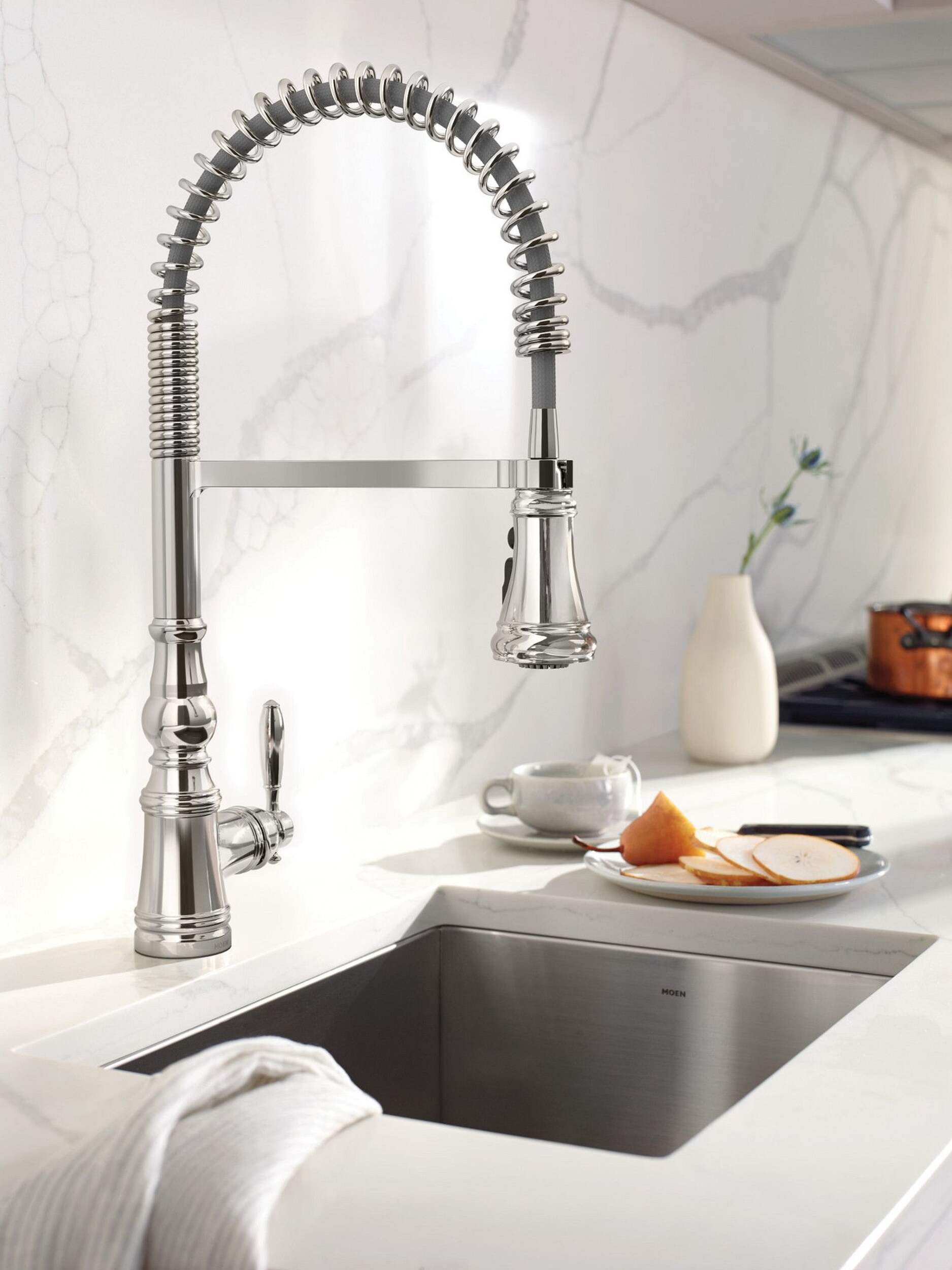 Robinet d'évier 1 manette bec rétractable Moen Weymouth au fini chromé réfléchissant comme un miroir convenant à tout style de décoration