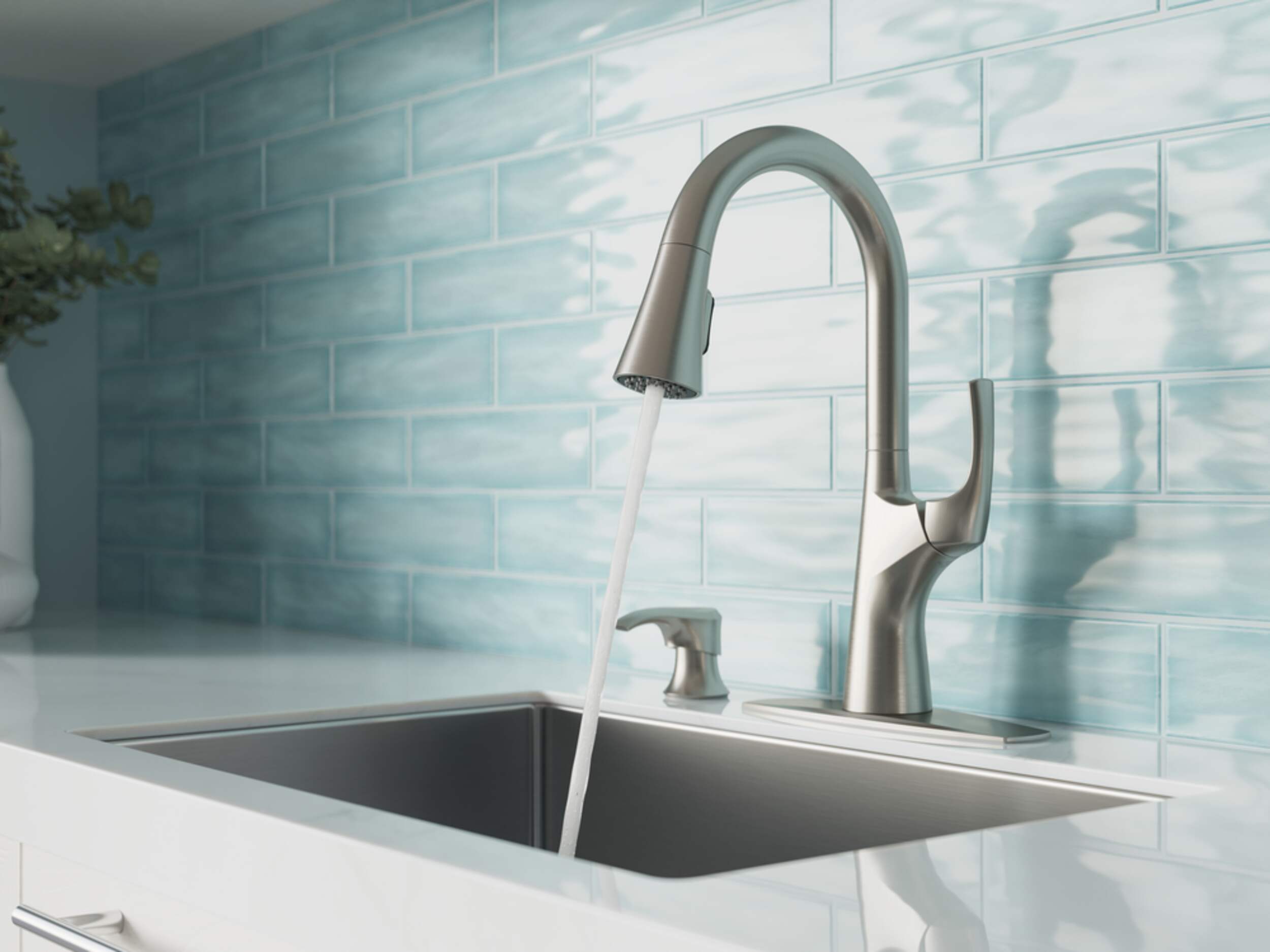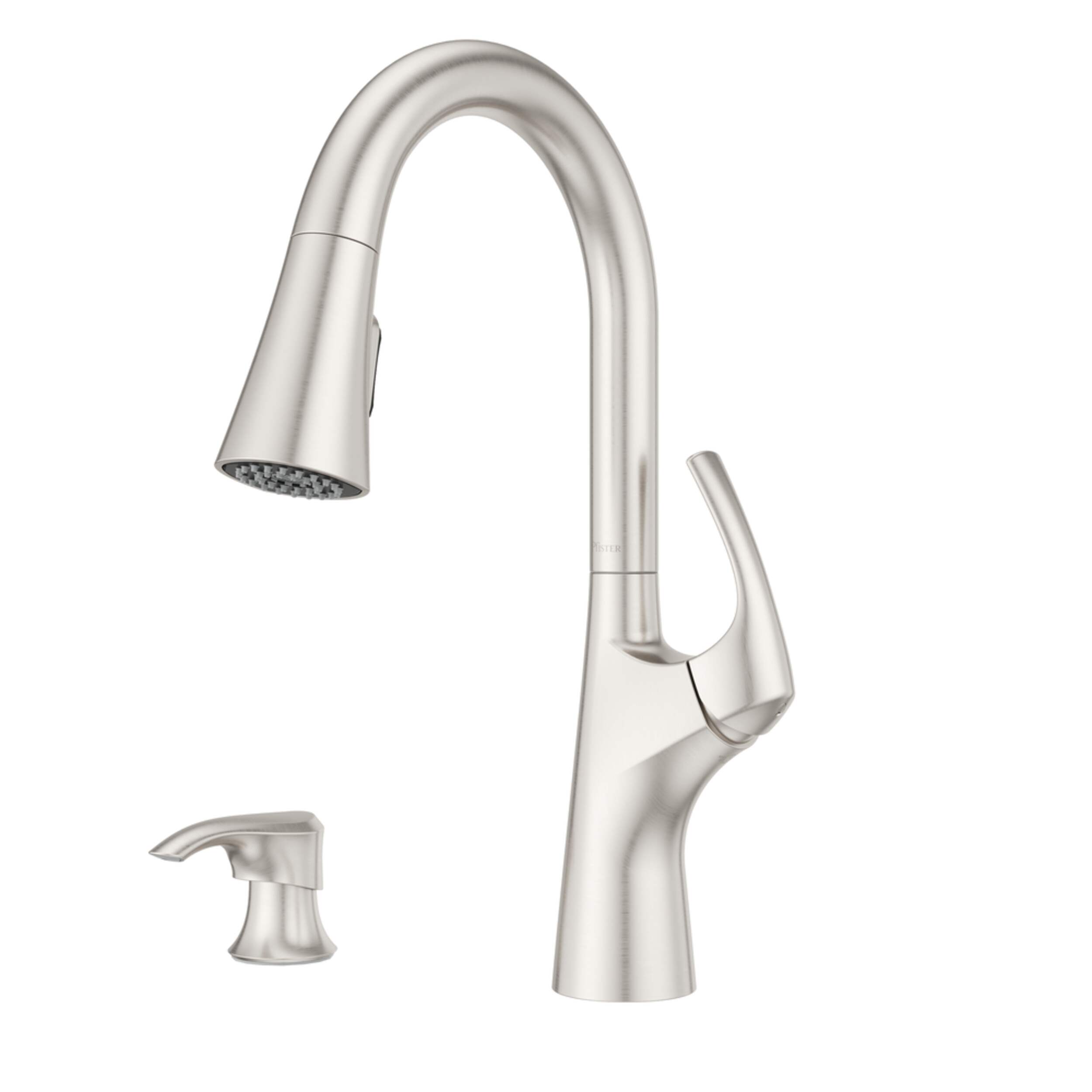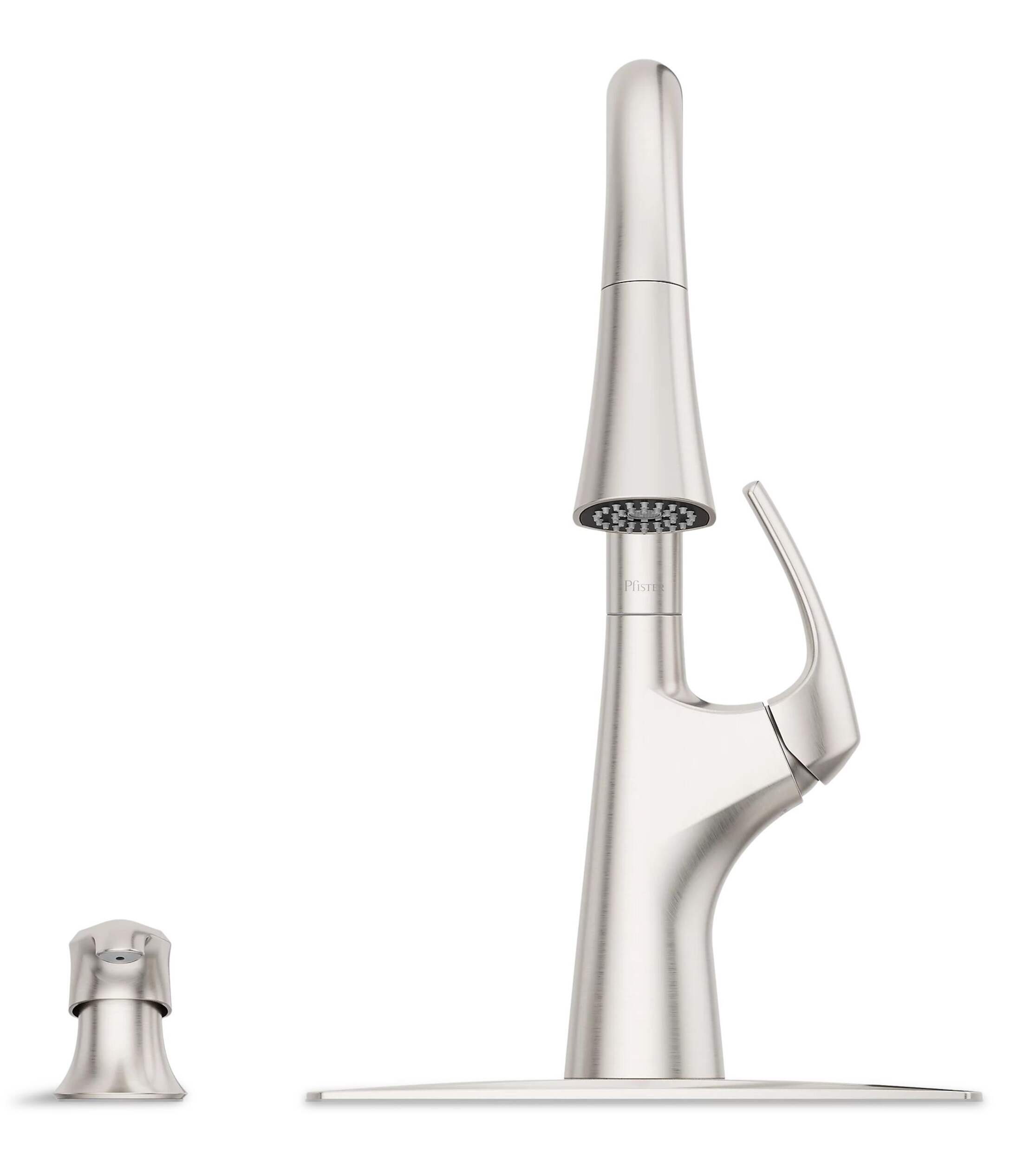 Robinet de cuisine Pfister Seahaven, version édulcorée du design traditionnel du mi-siècle, avec manette cohésive et tête de pulvérisation rétractable s'inspirant de la simplicité et de la force