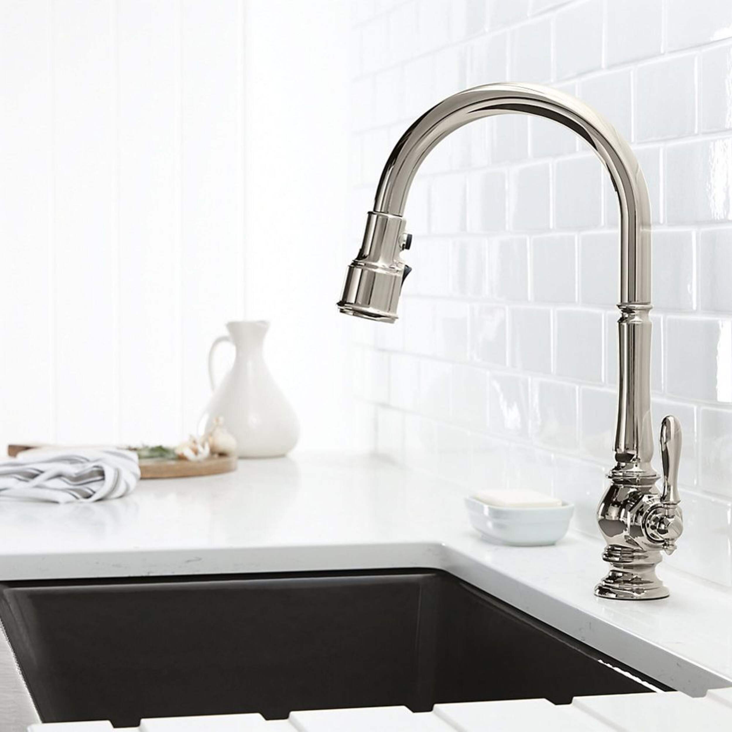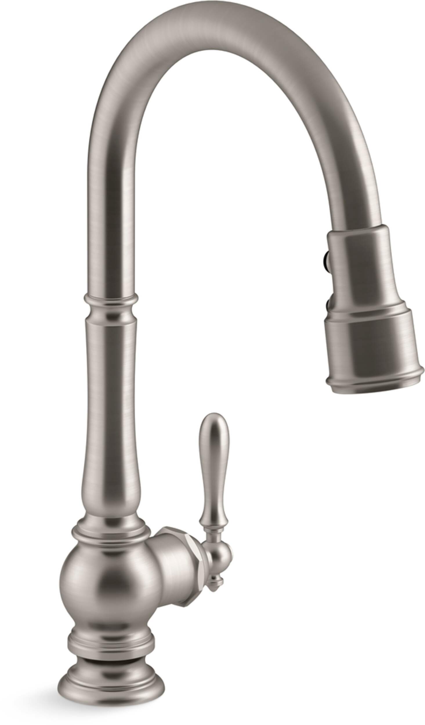 Collection de robinets Artifacts vous offrant des modèles classiques réinventés pour différentes tâches de la cuisine. Robinet d'évier de cuisine Artifacts qui présente un style vintage avec son bec à arche haute et sa poignée à levier tournant. Tête de pulvérisation rétractable à 3 fonctions vous permettant d'effectuer différentes tâches : Vaporisateur BerrySoft pour la préparation des aliments; jet aéré pour remplir les casseroles; et vaporisateur Sweep pour le nettoyage. Système d'accrochage DockNetik de Kohler qui fixe la tête de pulvérisation au bec.