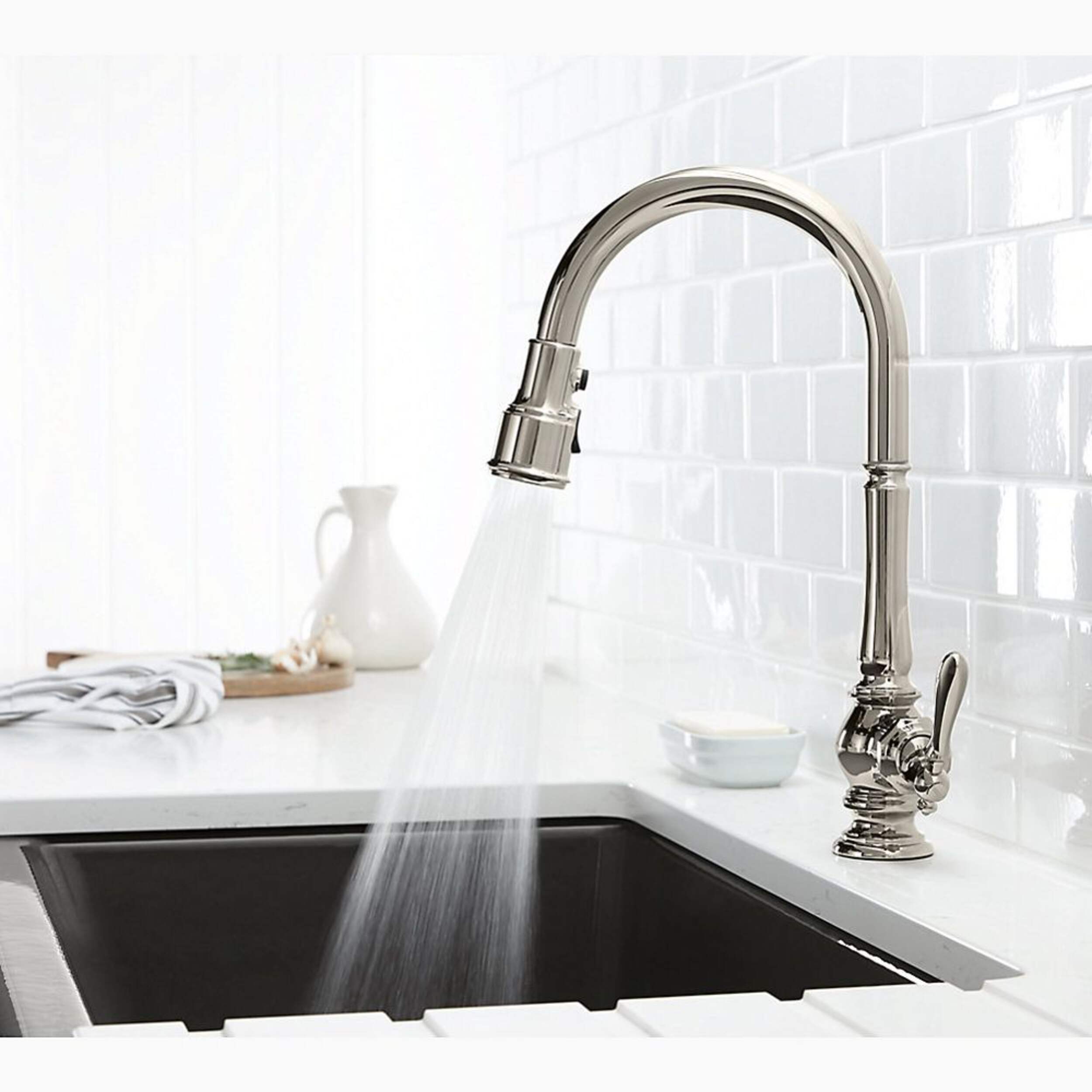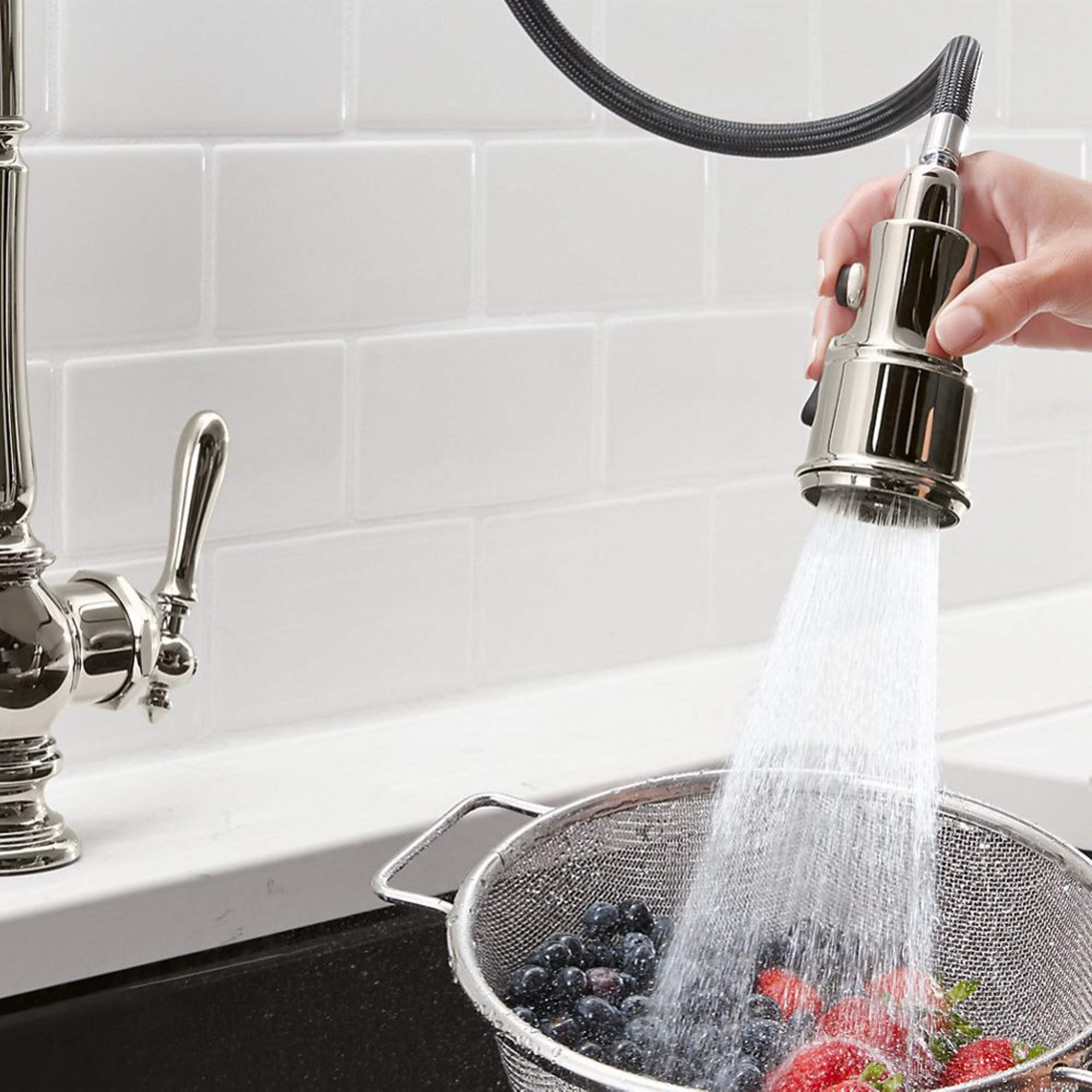 Robinet de cuisine Kohler Artifacts doté d’une douchette rabattable unique à trois fonctions pour nettoyer, rincer et remplir, avec vaporisations Sweep et BerrySoft et jet aéré