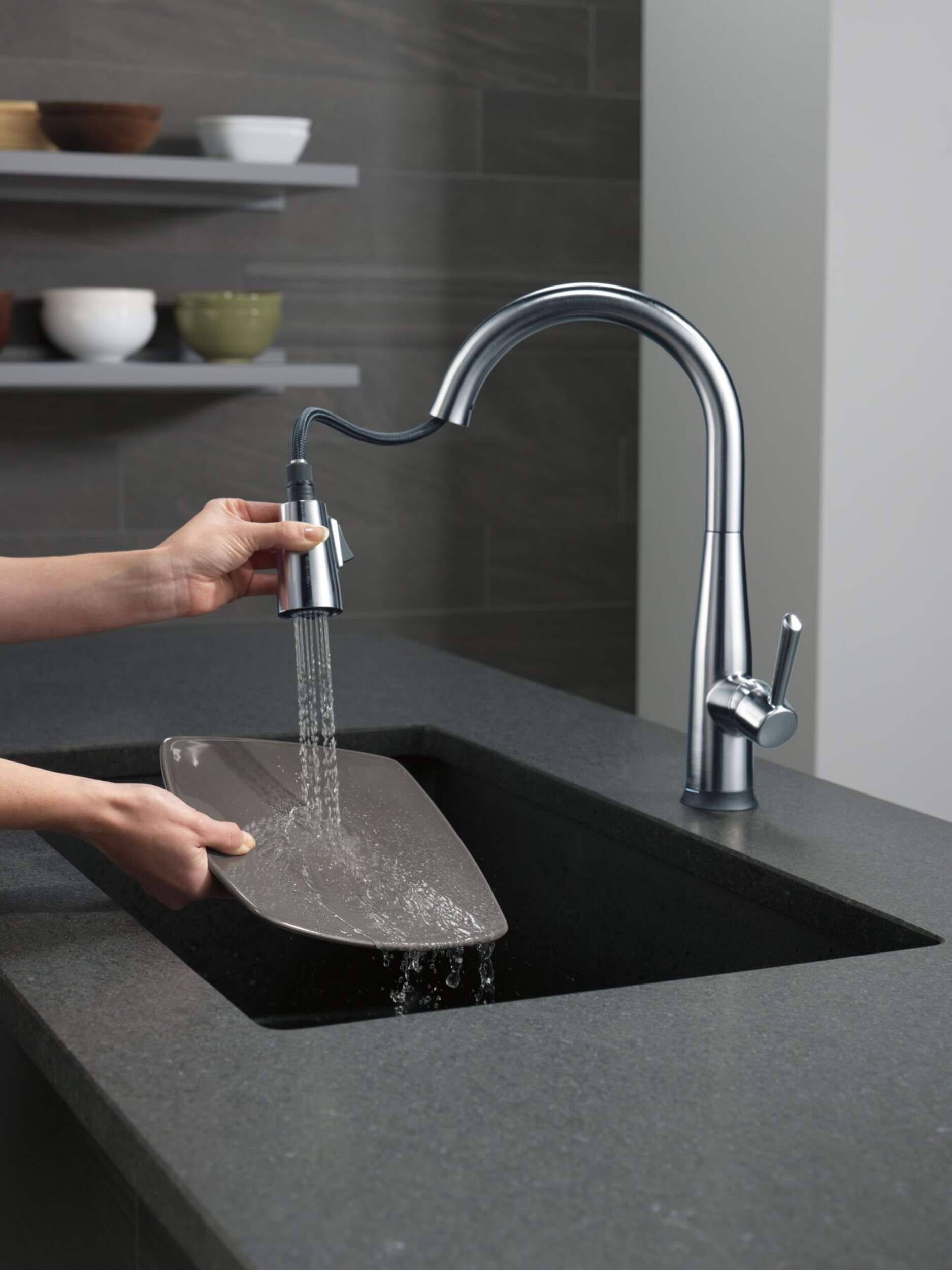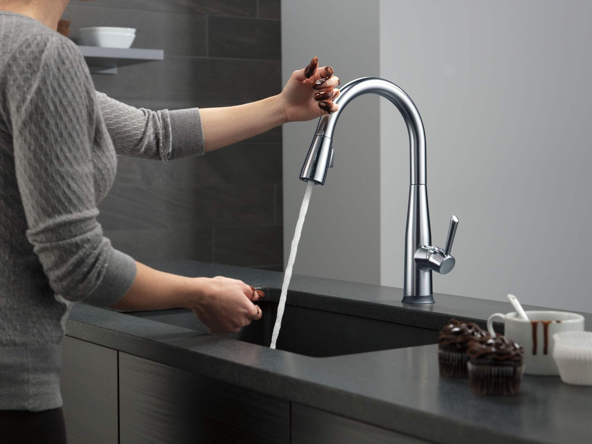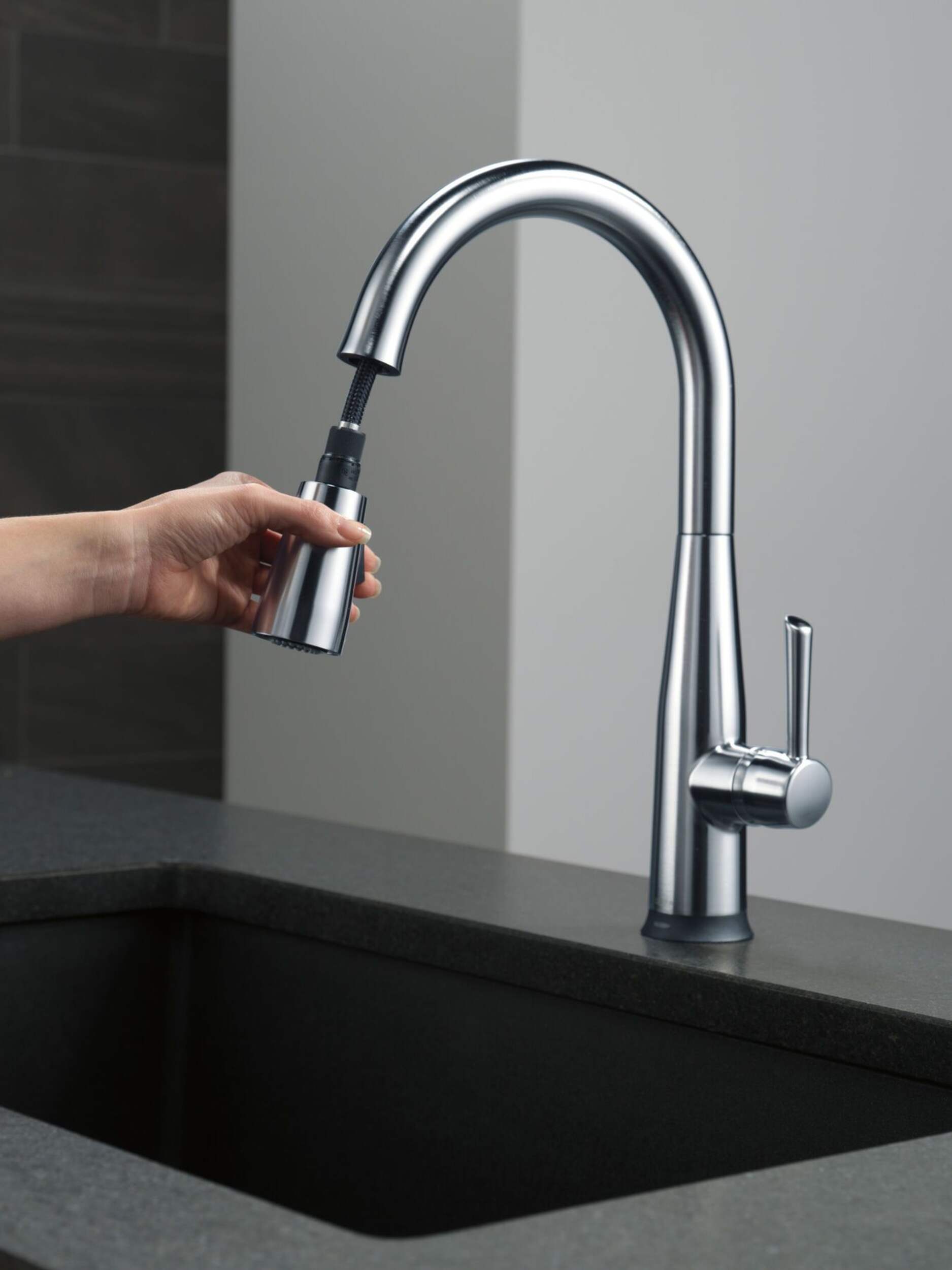 Robinet de cuisine rétractable à 1 poignée Delta Essa à technologie Touch2O; un simple toucher n’importe où sur le bec ou le manche ouvre et ferme l’eau