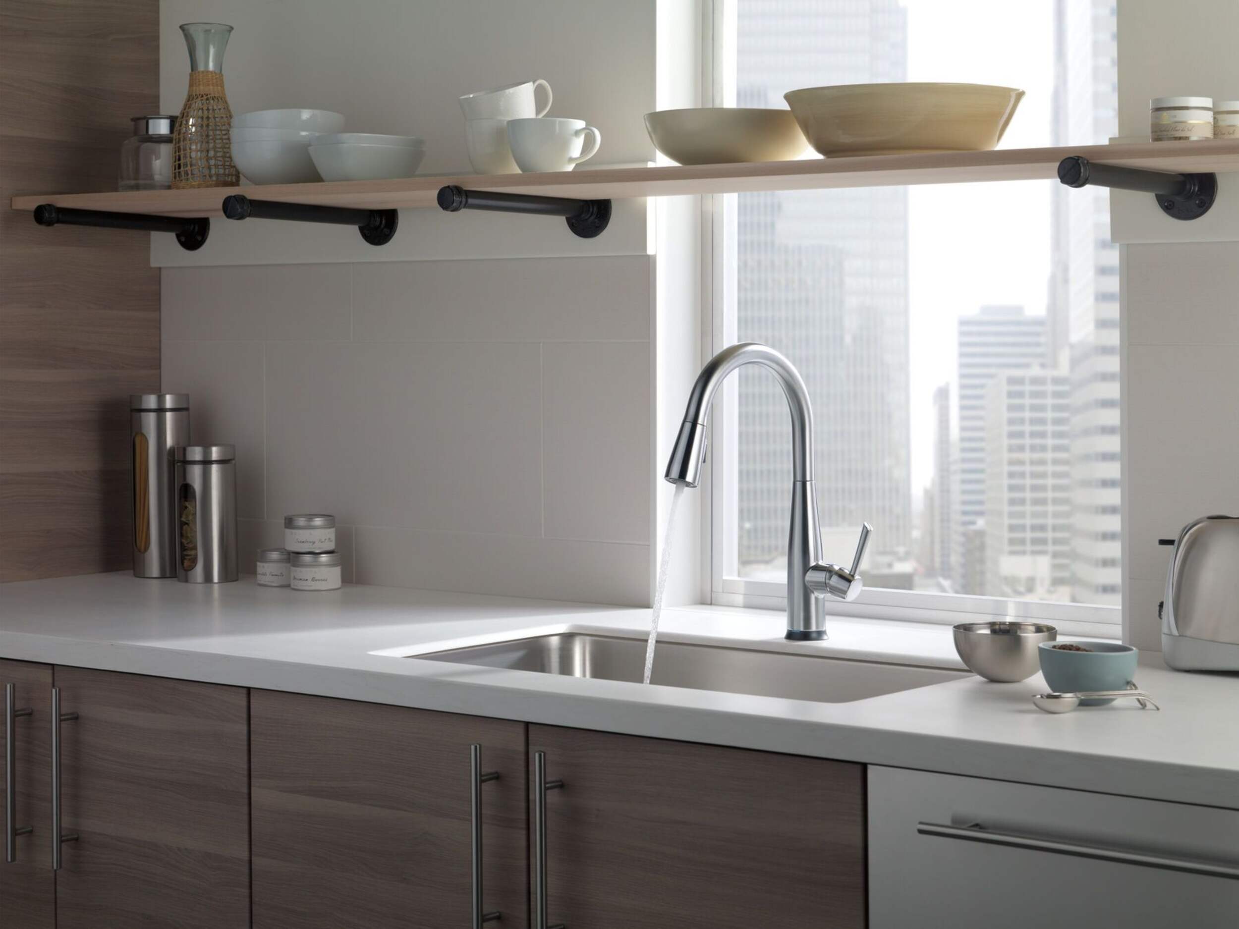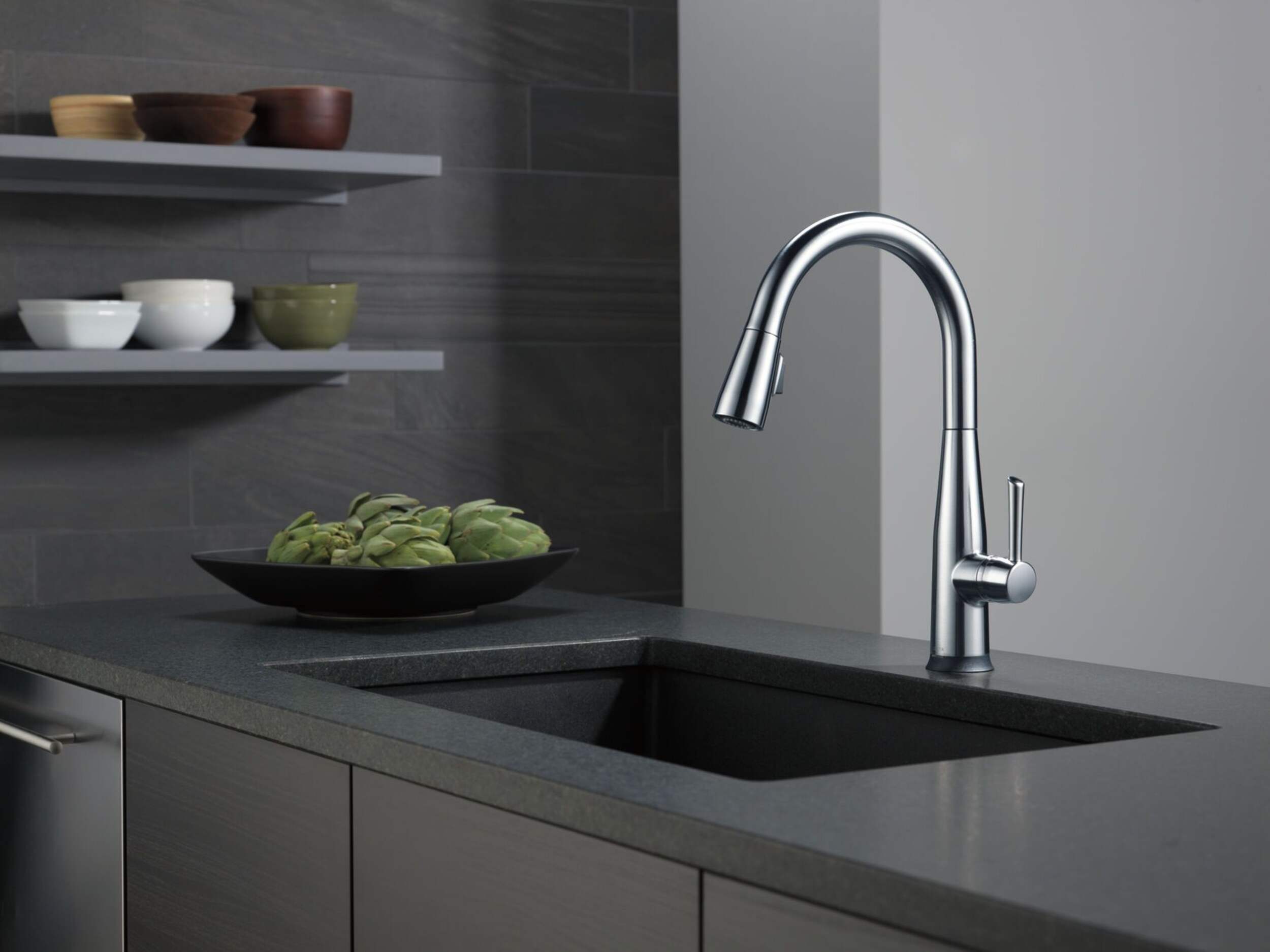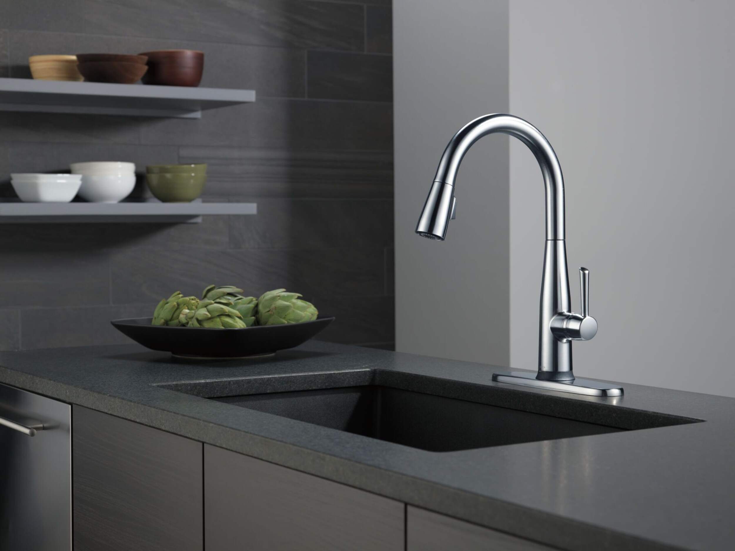 Robinet de cuisine rétractable à 1 poignée Delta Essa à technologie Touch2O; un simple toucher n’importe où sur le bec ou le manche ouvre et ferme l’eau