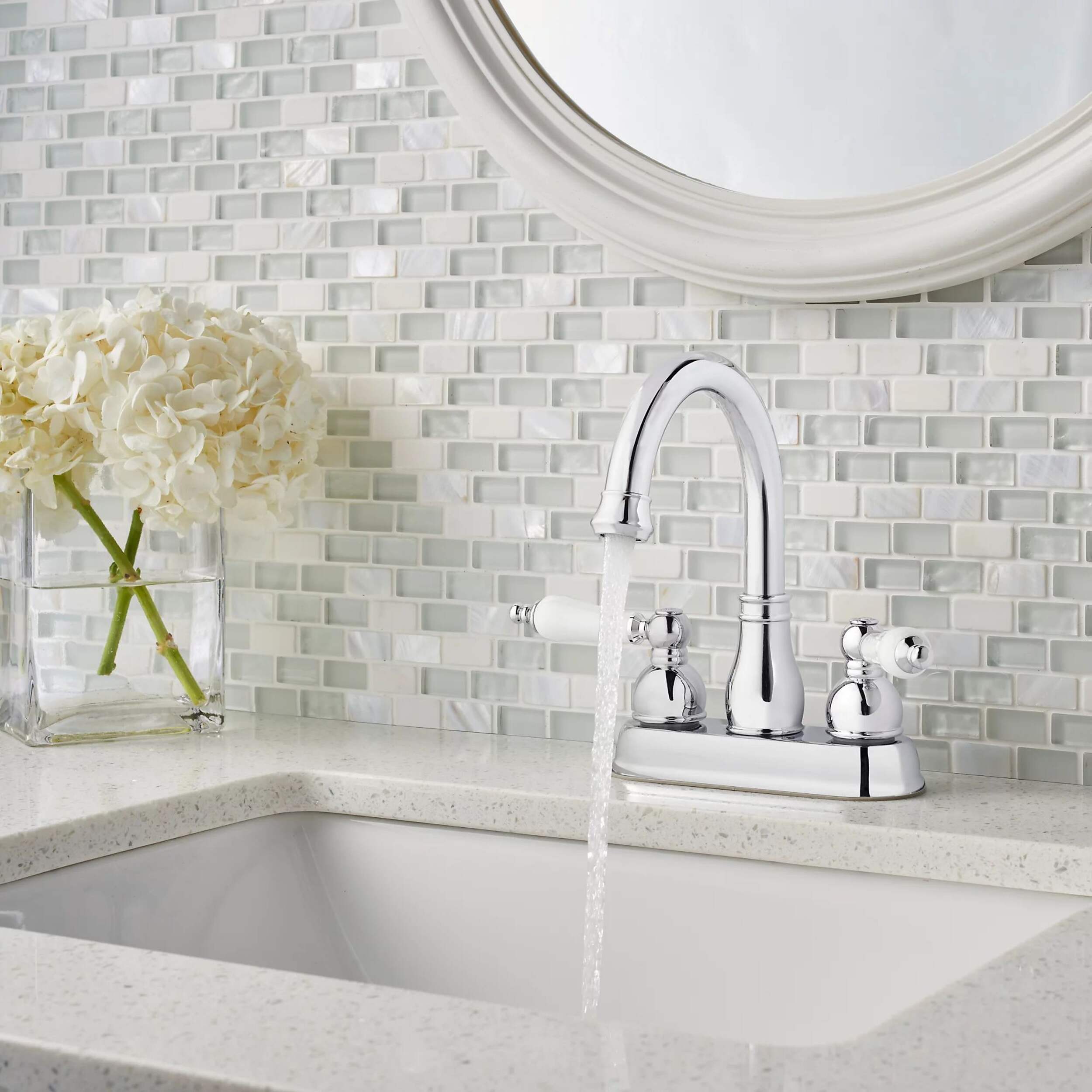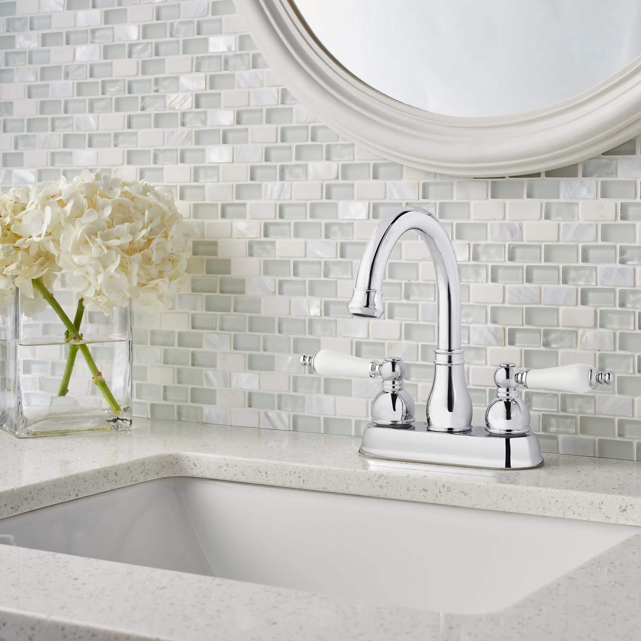Le robinet de lavabo de salle de bains central à arche haute à 2 poignées Pfister Henlow de 4 po met en valeur l'élégance et la fonctionnalité. Ses courbes gracieuses et son fini chromé poli ajoutent une touche de raffinement à n'importe quel décor de salle de bain. Conçu avec des éléments traditionnels et modernes en tête, ce robinet est doté de poignées en céramique blanche pour un attrait visuel accru. Le robinet Henlow est un choix élégant qui rehausse n'importe quelle salle de bain tout en offrant un rendement fiable pour un usage quotidien.
