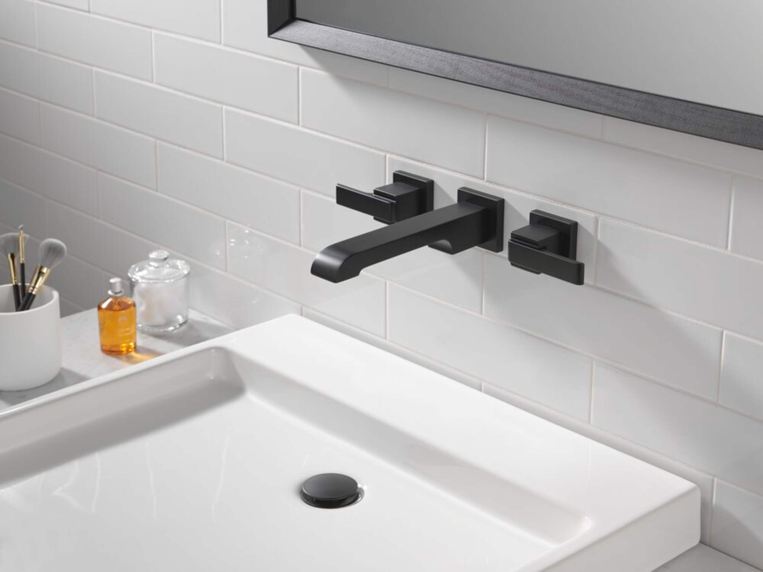 Avec ses angles et les bords aux motifs géométriques bien définis, le robinet de salle de bain Delta Ara à 2 manettes et montage mural confère une élégance contemporaine