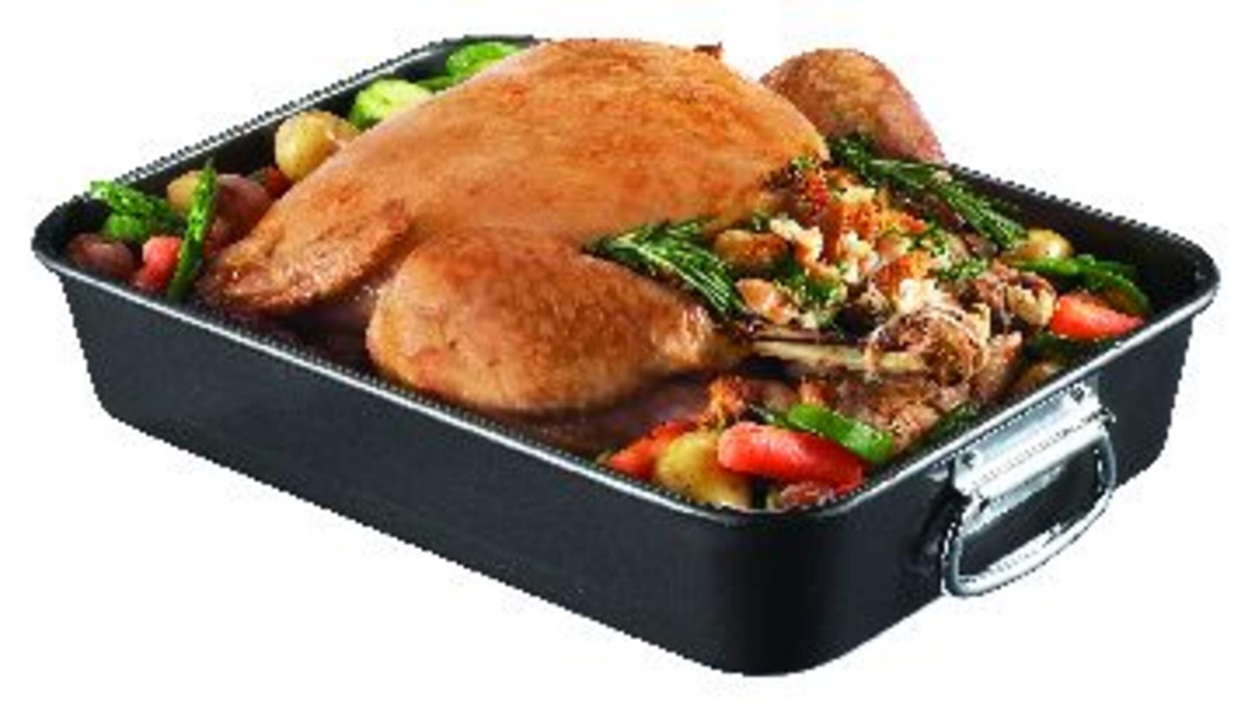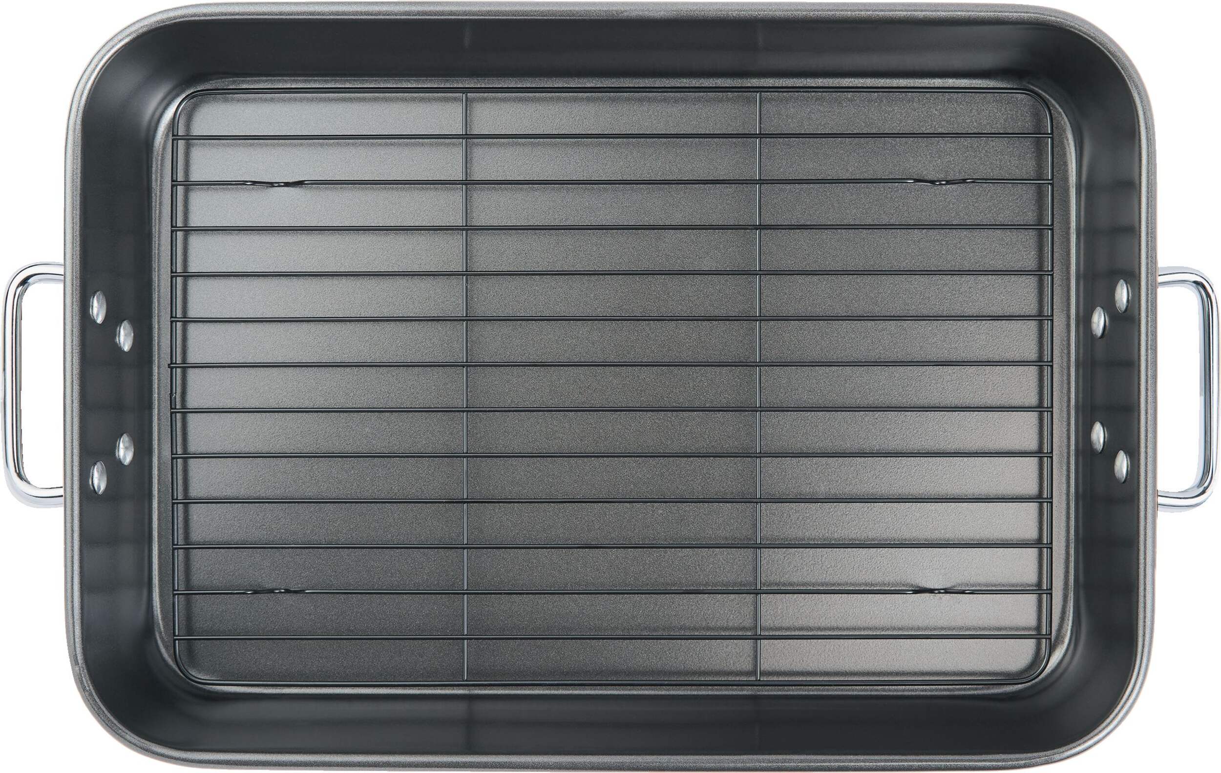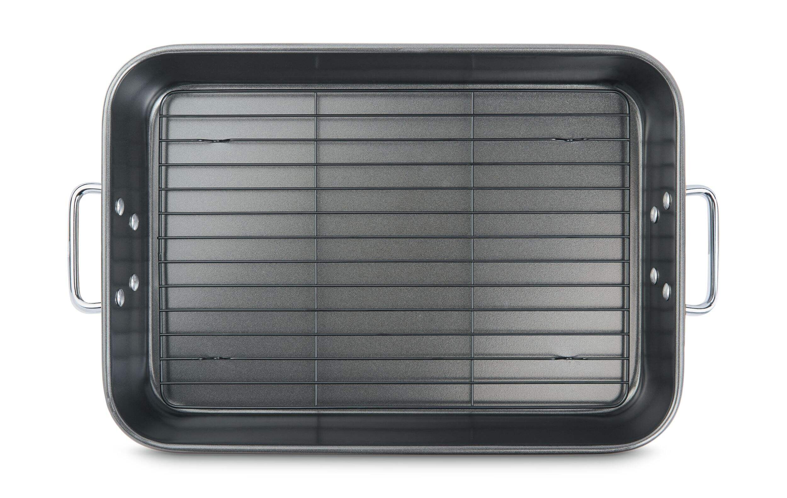 Préparez de fabuleux repas pour vos amis et votre famille avec cette rôtissoire polyvalente MASTER Chef. Dotée d'un revêtement antiadhésif sur la grille, ce qui permet de retirer facilement les aliments après la cuisson pour un nettoyage rapide. Grille plate de cette rôtissoire antiadhésive permettant aux jus de couler sous les viandes tout en offrant un débit d'air approprié pour des coupes plus juteuses et plus tendres. Poignées en fil d'acier qui se rabattent vers le haut et vers le bas pour faciliter le rangement et la manipulation lorsque la poêle sort du four.