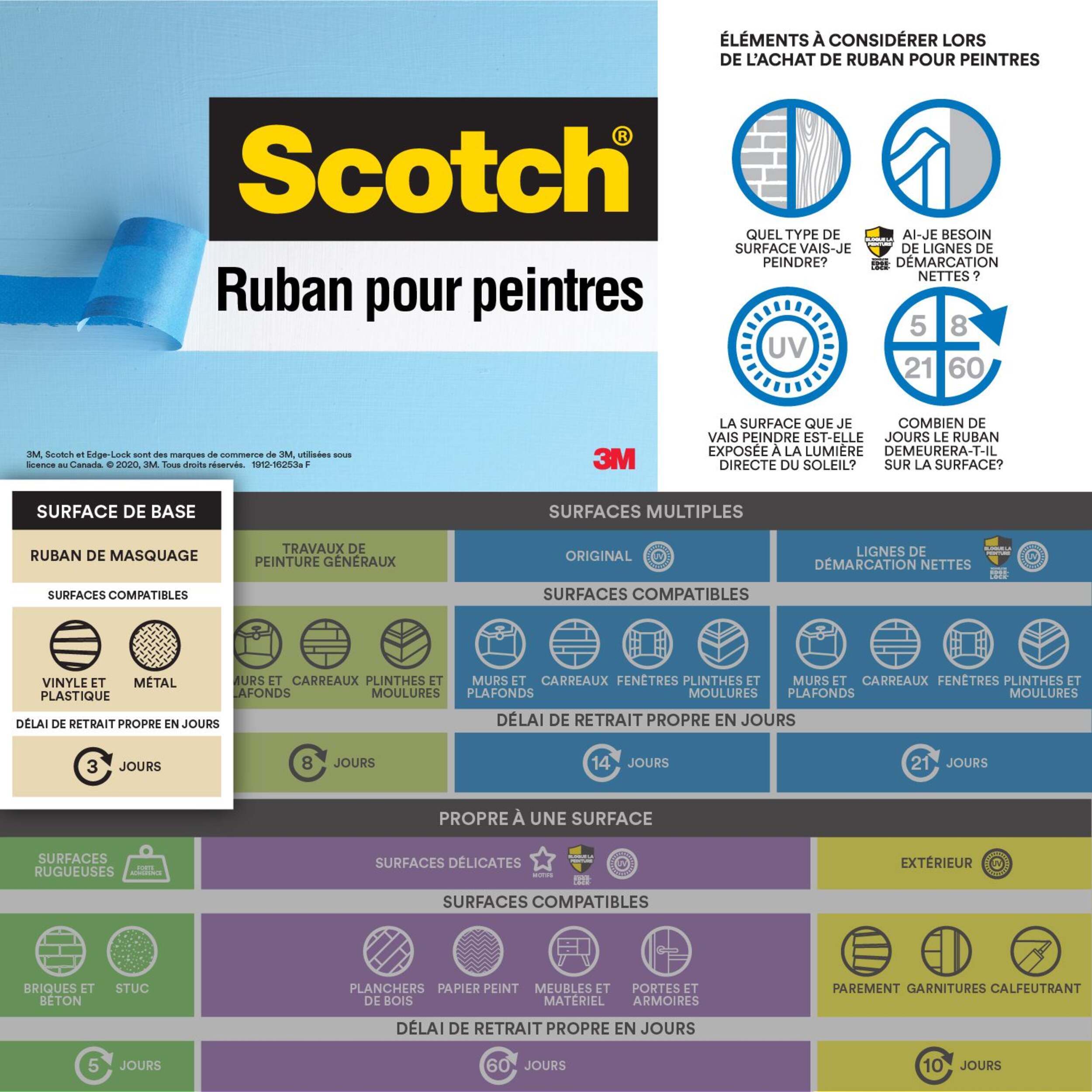 Ruban de masquage de qualité entrepreneur Scotch tout usage conçu pour les surfaces non dommageables. Utilisez-le pour protéger le vinyle, le tapis, le métal ou le plastique pour réaliser votre travail. Le ruban de masquage Scotch MD de qualité entrepreneur colle aux surfaces pendant un maximum de 3 jours, puis se retire facilement sans laisser de résidu collant.