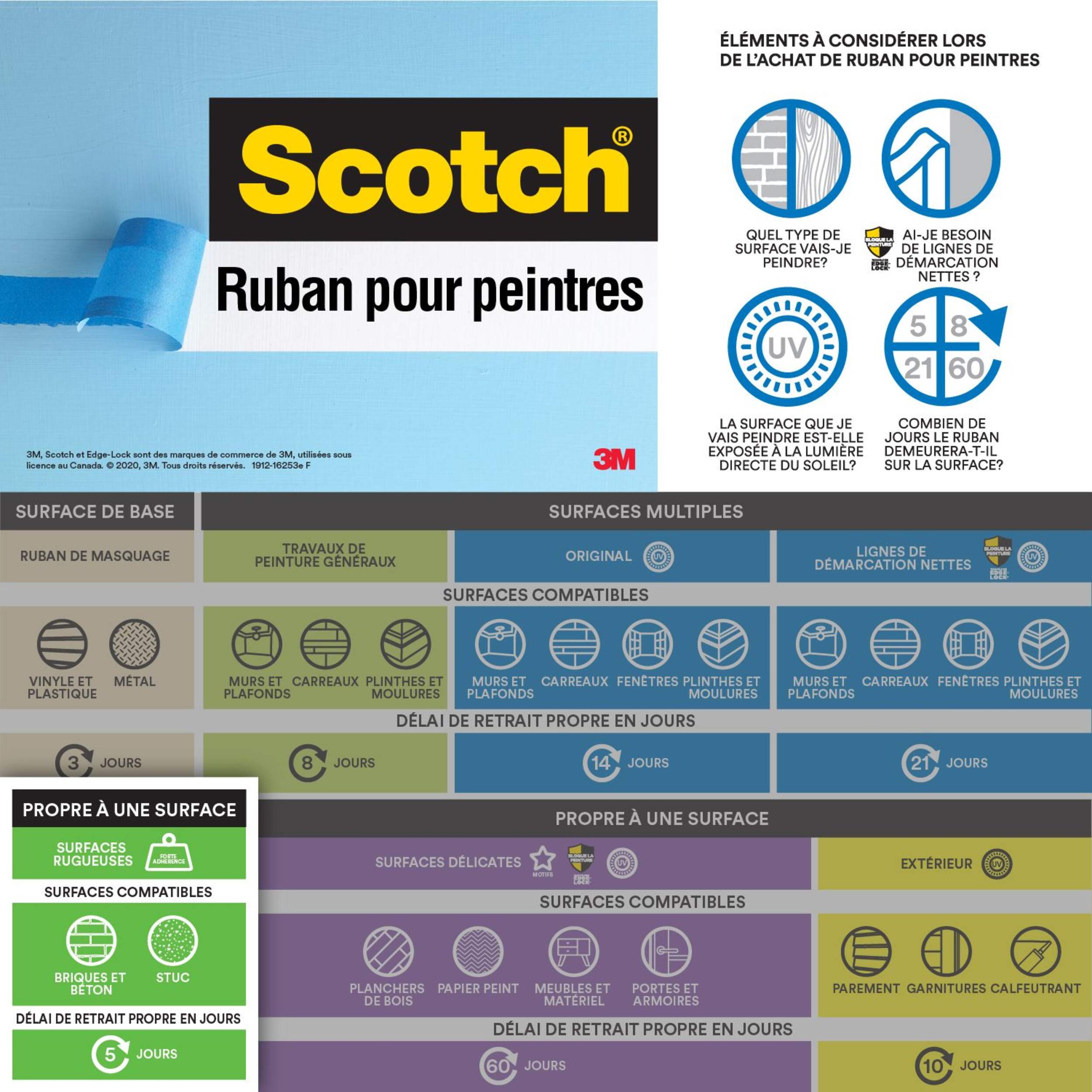 Ruban pour peintres 3M Scotch très résistant pour surface rugueuse vert de 1,41 po x 60 vg doté d'un adhésif très puissant qui adhère aux surfaces rugueuses comme la brique, le stuc, le béton et le bois à grain grossier sans les endommager. Prise solide qui protège vos surfaces pendant jusqu'à 5 jours tout en permettant un retrait facile lorsque vous avez terminé, sans résidu collant. Utilisez-le pour votre prochain projet de bricolage afin de ne pas peindre les surfaces que vous ne voulez pas enduire. Le ruban robuste assure des lignes de peinture nettes et précises pour un fini professionnel, même sur les textures et les substrats inégaux. Il est recommandé d'utiliser le ruban à peinturer Scotch MD pour surfaces rugueuses avec les revêtements laqués.
