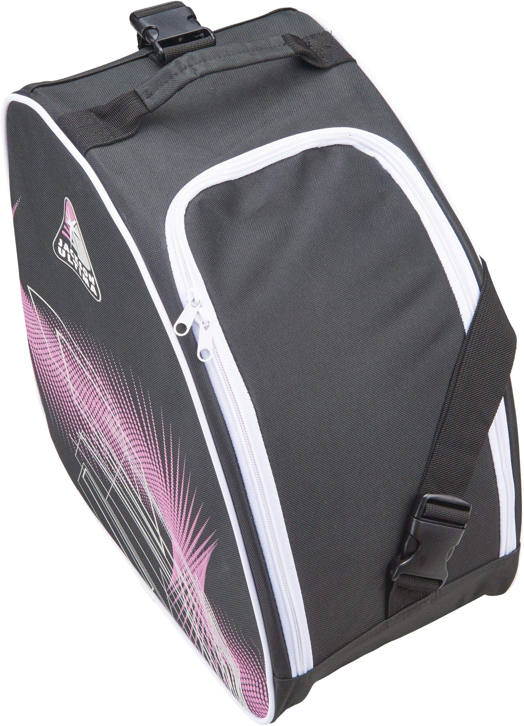 Sac de patinage artistique Jackson Ultima idéal pour les voyages sur la glace et hors de la glace. Sac de patin spacieux et élégant qui arbore le logo Jackson Ultima avec un motif sérigraphié. Comprend une poche surdimensionnée à fermeture à glissière spécialement conçue pour ranger vos patins et de l'espace supplémentaire pour les petits articles. Bandoulière ajustable avec boucles vous permettant de le transporter facilement jusqu'à la patinoire et vous pouvez aussi le suspendre ou le fixer à un autre sac. De plus, il y a une petite poignée pratique sur le dessus pour faciliter le transport. Pour protéger le sac contre les surfaces mouillées, il est doté de nervures au bas qui le surélèvent du sol. Palette de couleurs du sac composée de noir avec une bordure blanche et d'un motif violet, ajoutant une touche d'élégance. Dans l'ensemble, ce sac offre amplement d'espace de rangement, des options de transport confortables, une durabilité et un modèle attrayant.