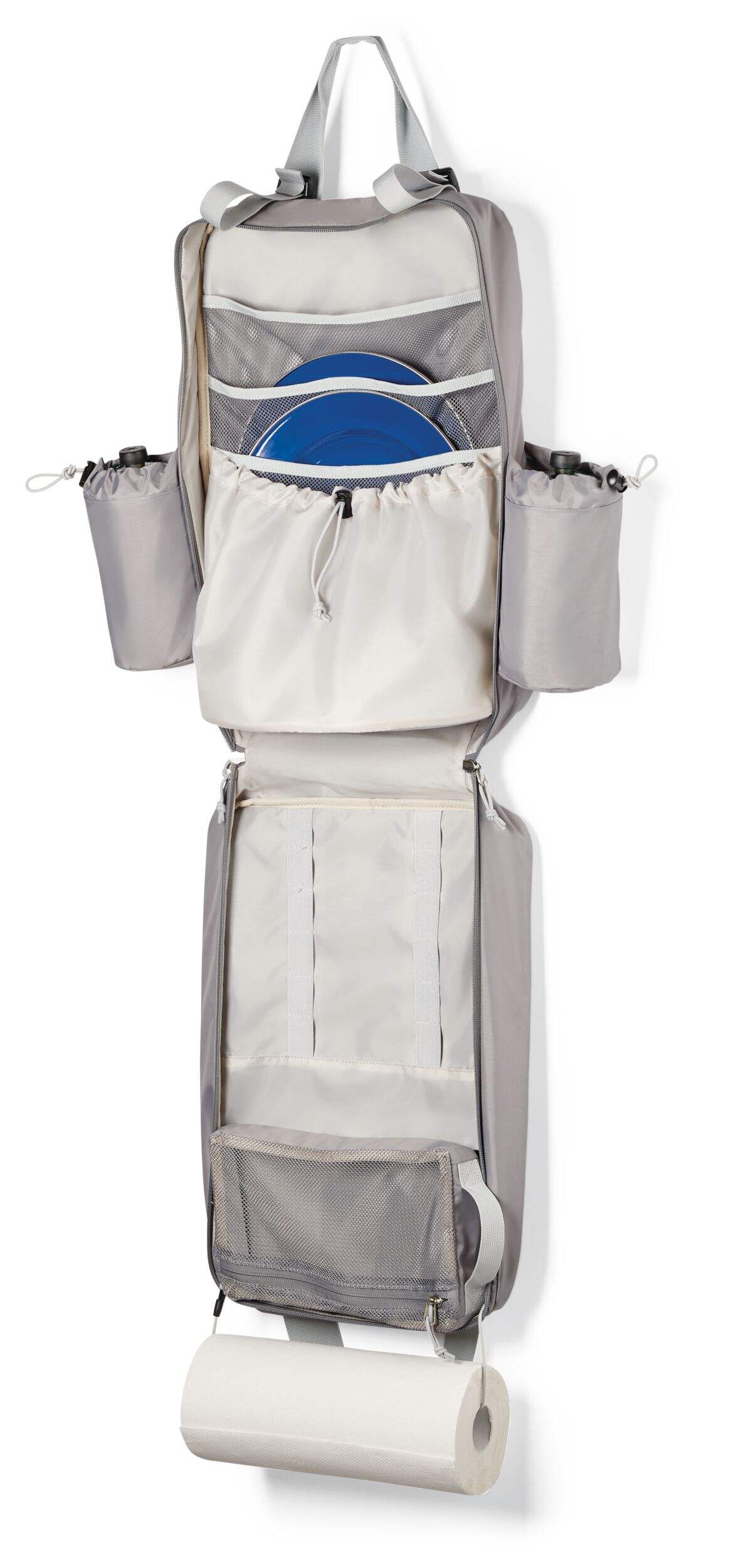 Conception 2-en-1 avec un sac de 25 L qui s'ouvre pour former un range-tout suspendu de cuisine de camping pour un rangement pratique des batteries de cuisine et des accessoires