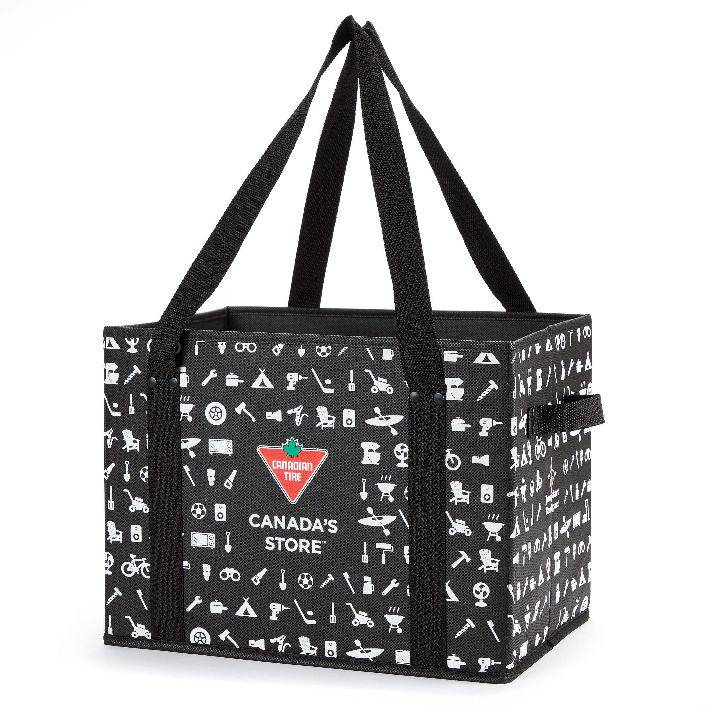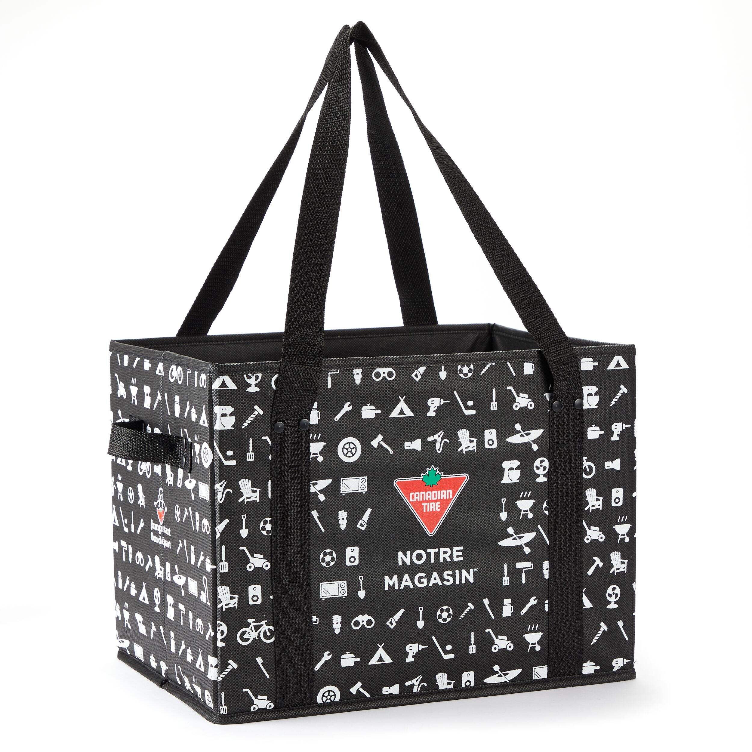 Évitez les sacs en plastique réutilisables avec le sac fourre-tout pliable en plastique réutilisable avec poignées Canadian Tire de 27 L. Sac fourre-tout réutilisable doté d'un modèle de boîte repliable pour que vous puissiez le ranger facilement dans votre sac à main quand vous sortez. Compact et léger, le sac fourre-tout en plastique noir est fait de matériaux recyclés. Façon amusante et durable de protéger l'environnement et de contribuer à la prévention des déchets. Au lieu d'acheter de nouveaux sacs, transportez ce sac fourre-tout durable et élégant chaque fois que vous vous rendez au magasin.