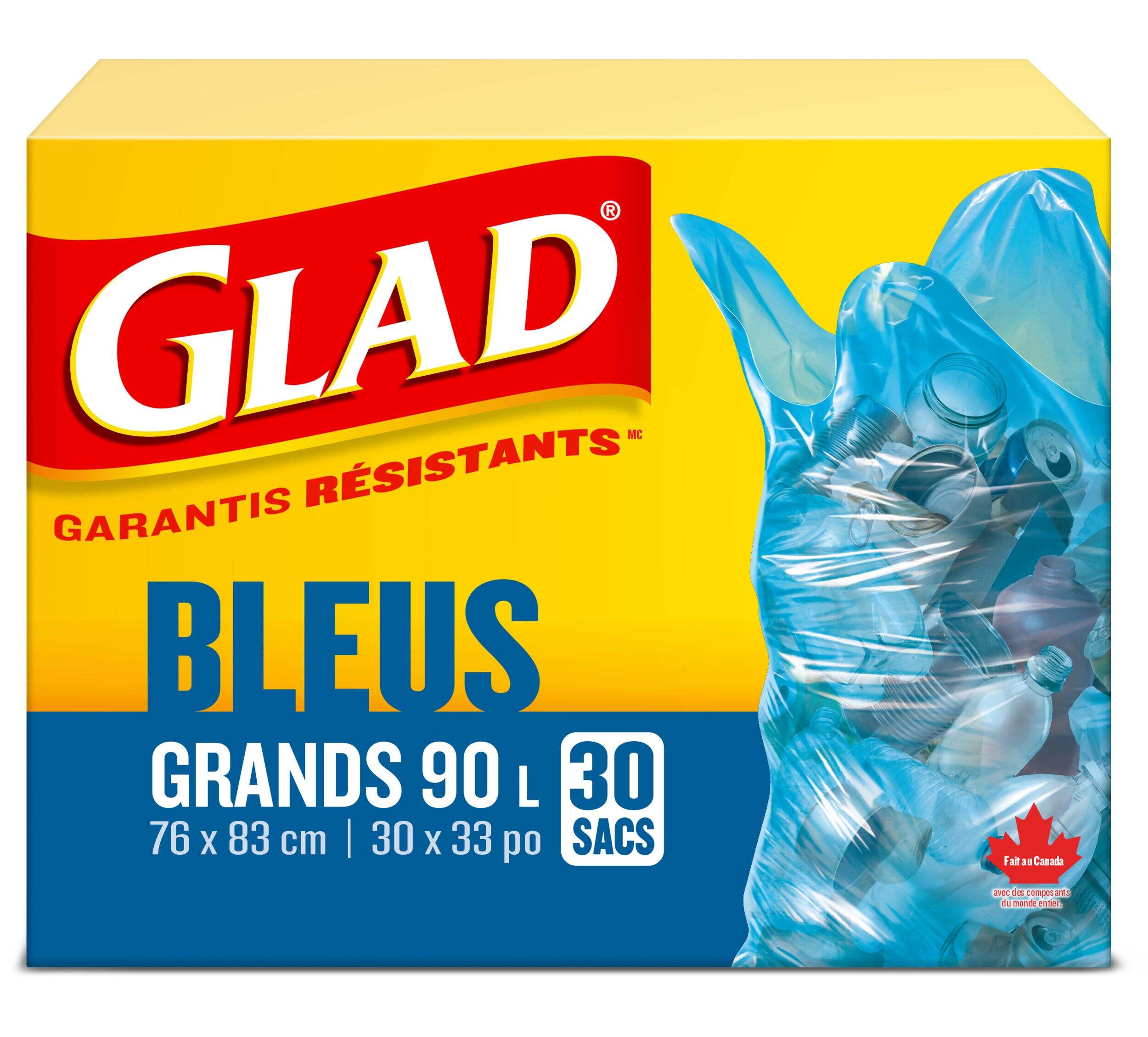 Sacs de recyclage Glad, bleus, conçus pour contenir tous vos produits recyclables et pour vous éviter de surcharger votre bac bleu