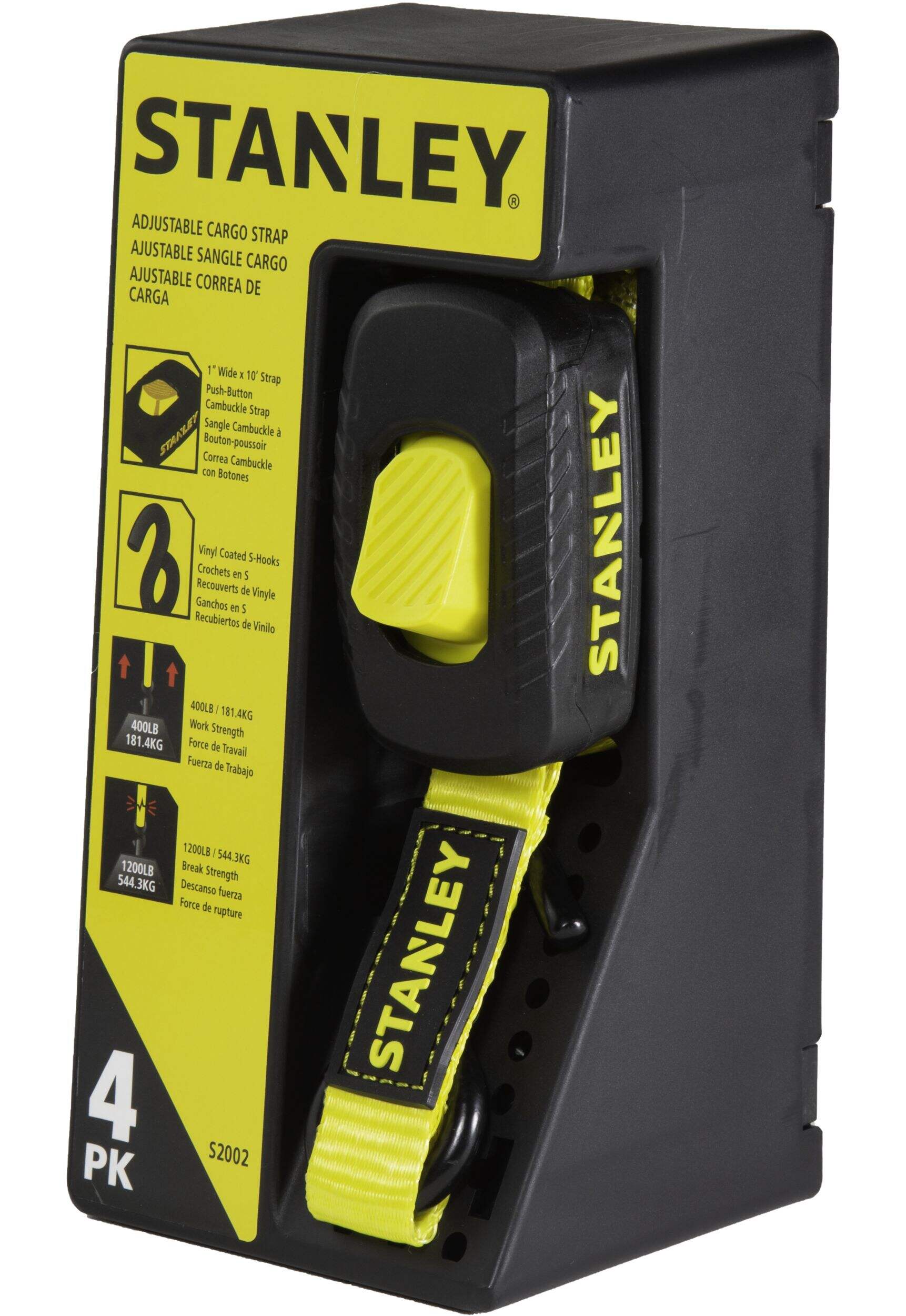 Sangles d'arrimage à boucle à came Stanley en paquet de 4 idéales pour fixer de petits articles en toute sécurité. Fonctionnement facile à bouton-poussoir permettant un réglage rapide et facile de la sangle. Boîtier à boucle à came qui protège de la saleté et des débris sans réduire la performance.