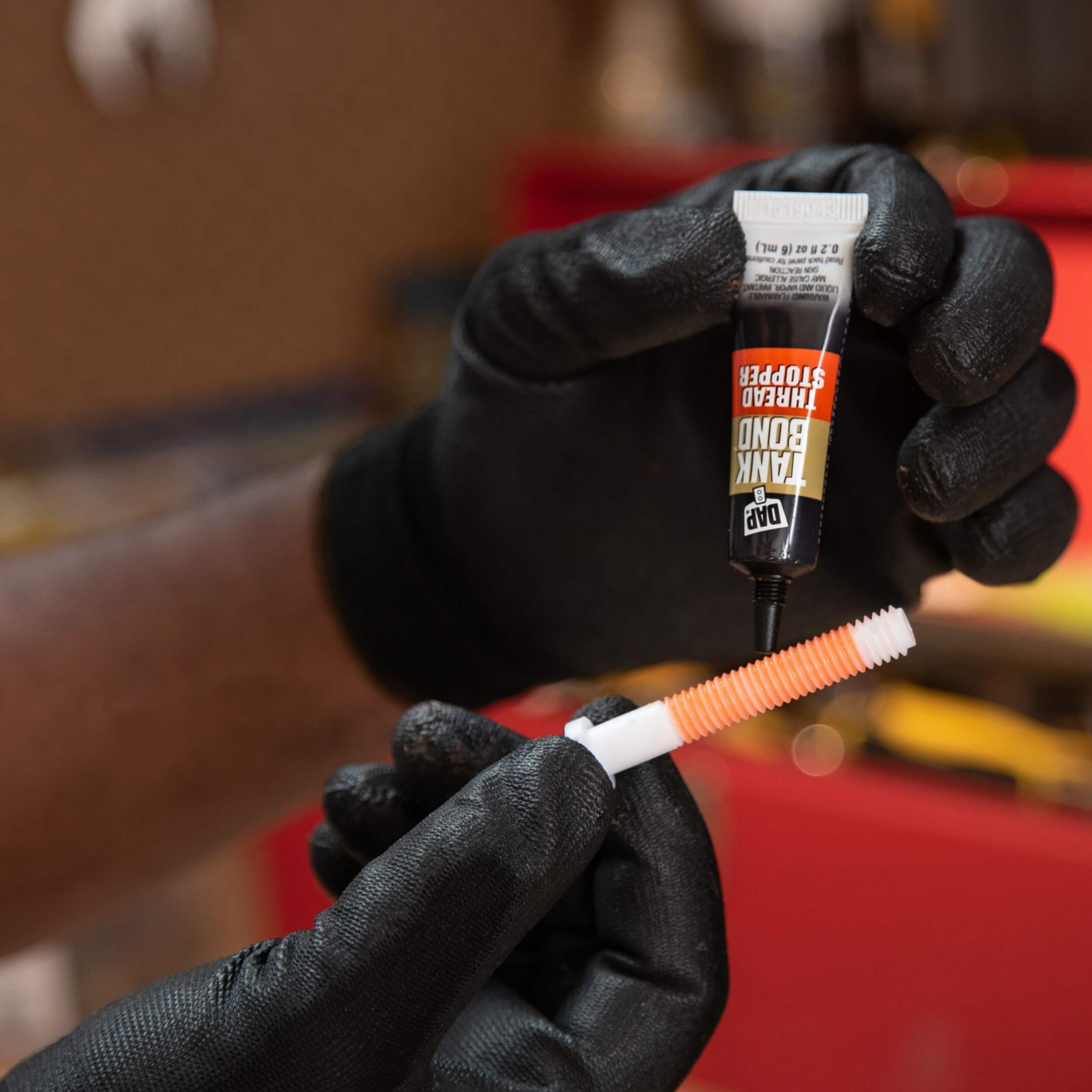 Scellant pour filetage DAP Tank Bond, qui enduit la vis ou le boulon fileté de ruban adhésif ou d'un revêtement similaire à du gel pour aider à absorber les chocs et les vibrations