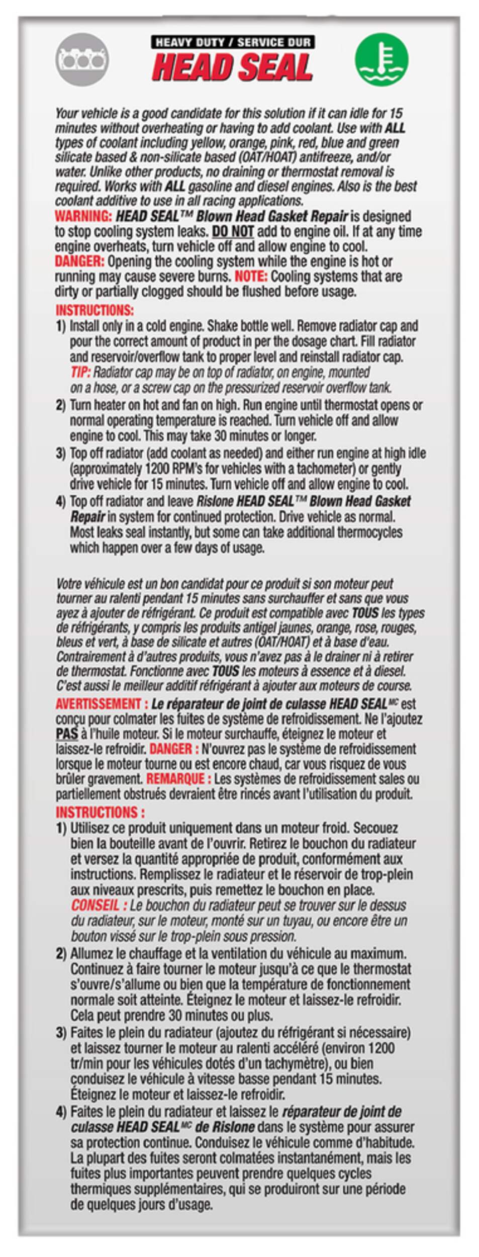 Ce produit Rislone est de qualité professionnelle. Il s'agit tout simplement de la solution compatible à l'antigel la plus puissante sur le marché. Il pénètre dans les joints de culasse qui fuient, endommagés ou grillés, et sèche pour former un joint plus solide que le joint de culasse original. C'est la meilleure formule pour éliminer toutes les autres fuites de liquide de refroidissement dans les radiateurs en plastique, en fonte, en cuivre et en aluminium, les radiateurs, les pastilles d'obturation, les joints, les collecteurs d'admission, les culasses et les blocs-cylindres. La formule spéciale contient également du Xtreme CoolMC, qui arrête la surchauffe et réduit la température de l'eau. Notre scelleuse de joint de culasse rapide et efficace est le résultat de décennies de recherche et d'essais menés par des ingénieurs en chimie de haut vol. Lorsque vous choisissez Rislone pour la réparation de joints de culasse endommagés, vous avez un produit conçu pour s'adapter parfaitement au style de vie et au budget des conducteurs de tous les jours.