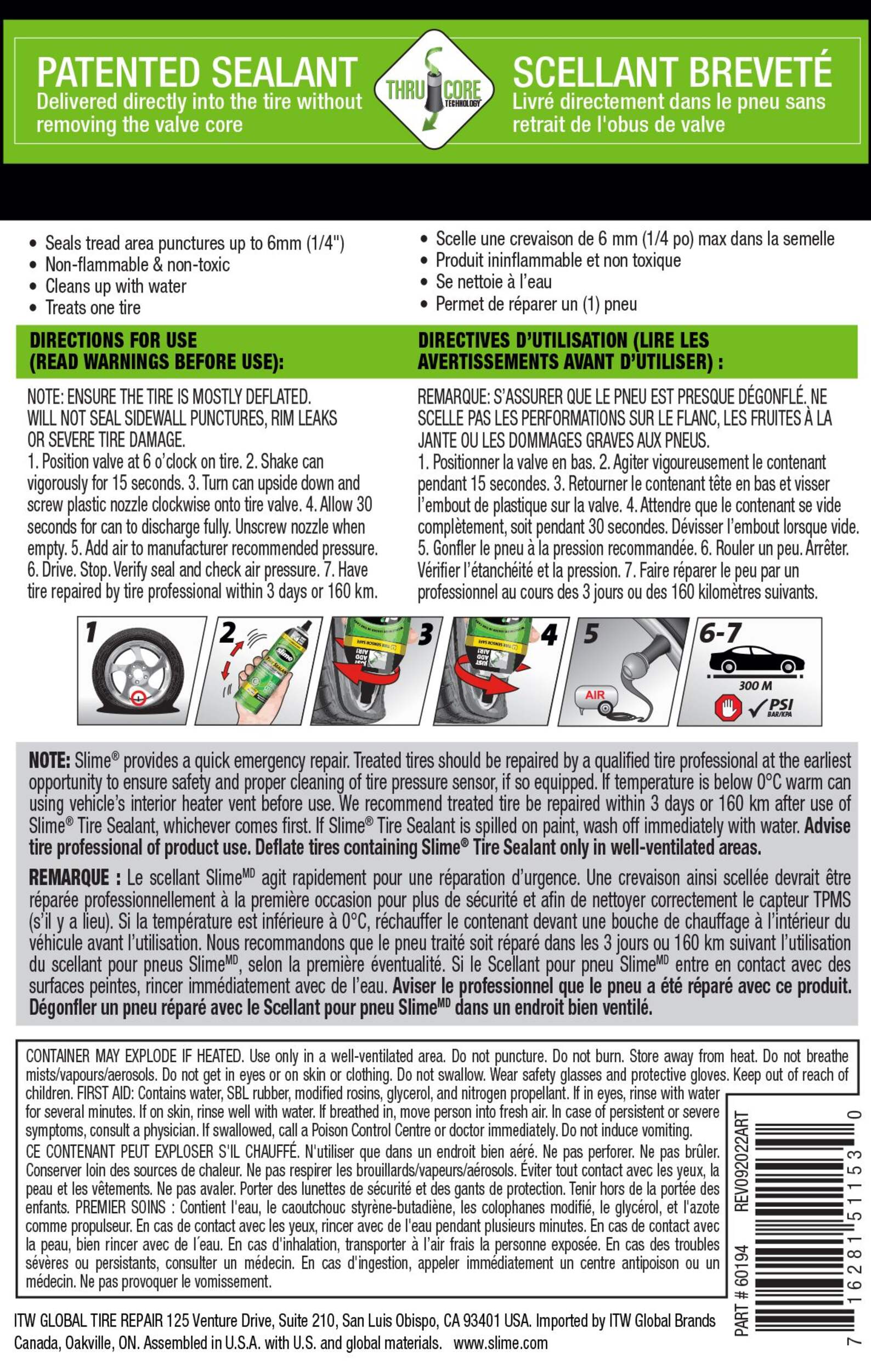 Scellant pour pneus SlimeMD Thru-Core pour réparation de crevaisons d'urgence conçu pour réparer temporairement les crevaisons des véhicules et devant être enlevé dans les 3 jours ou après avoir parcouru 160 kilomètres