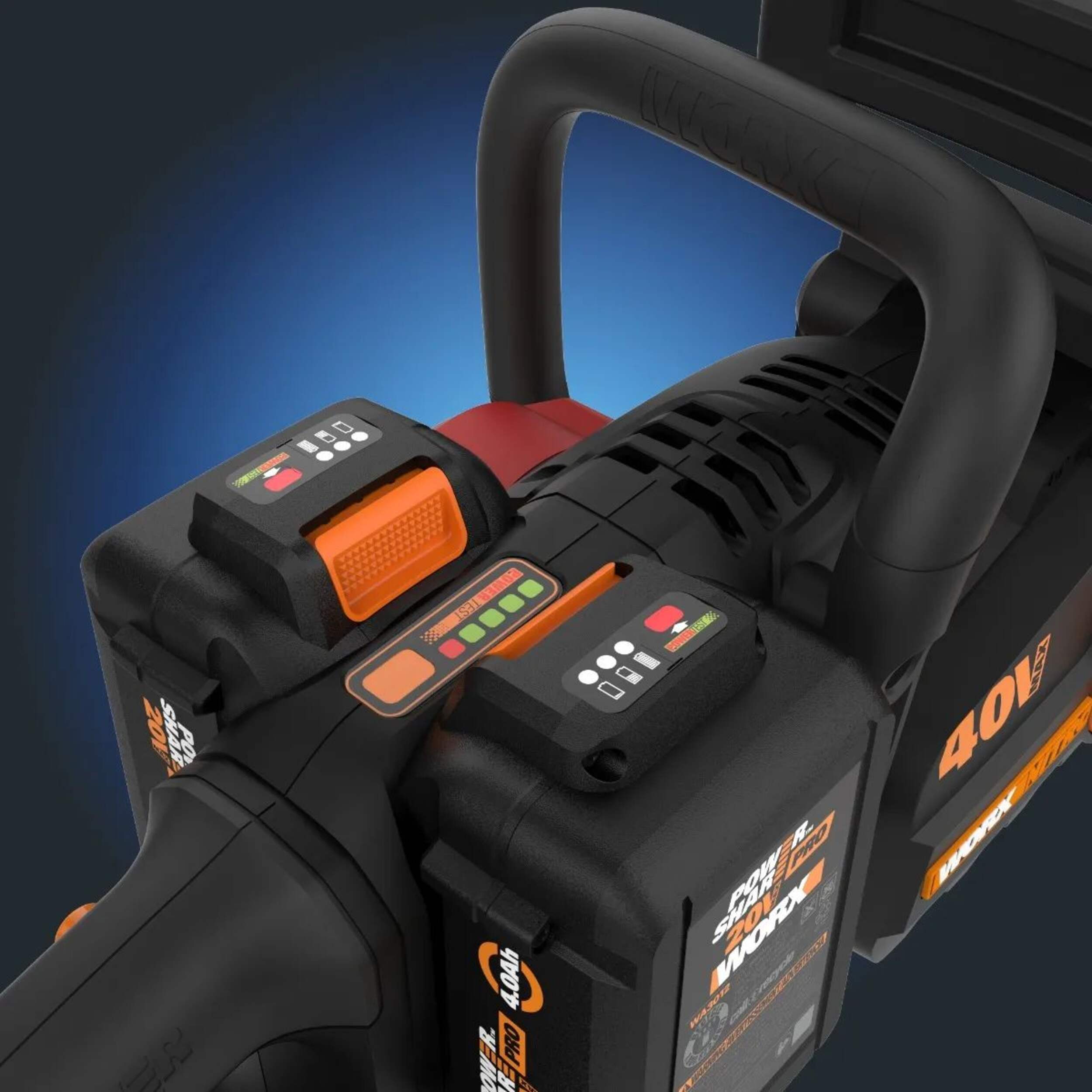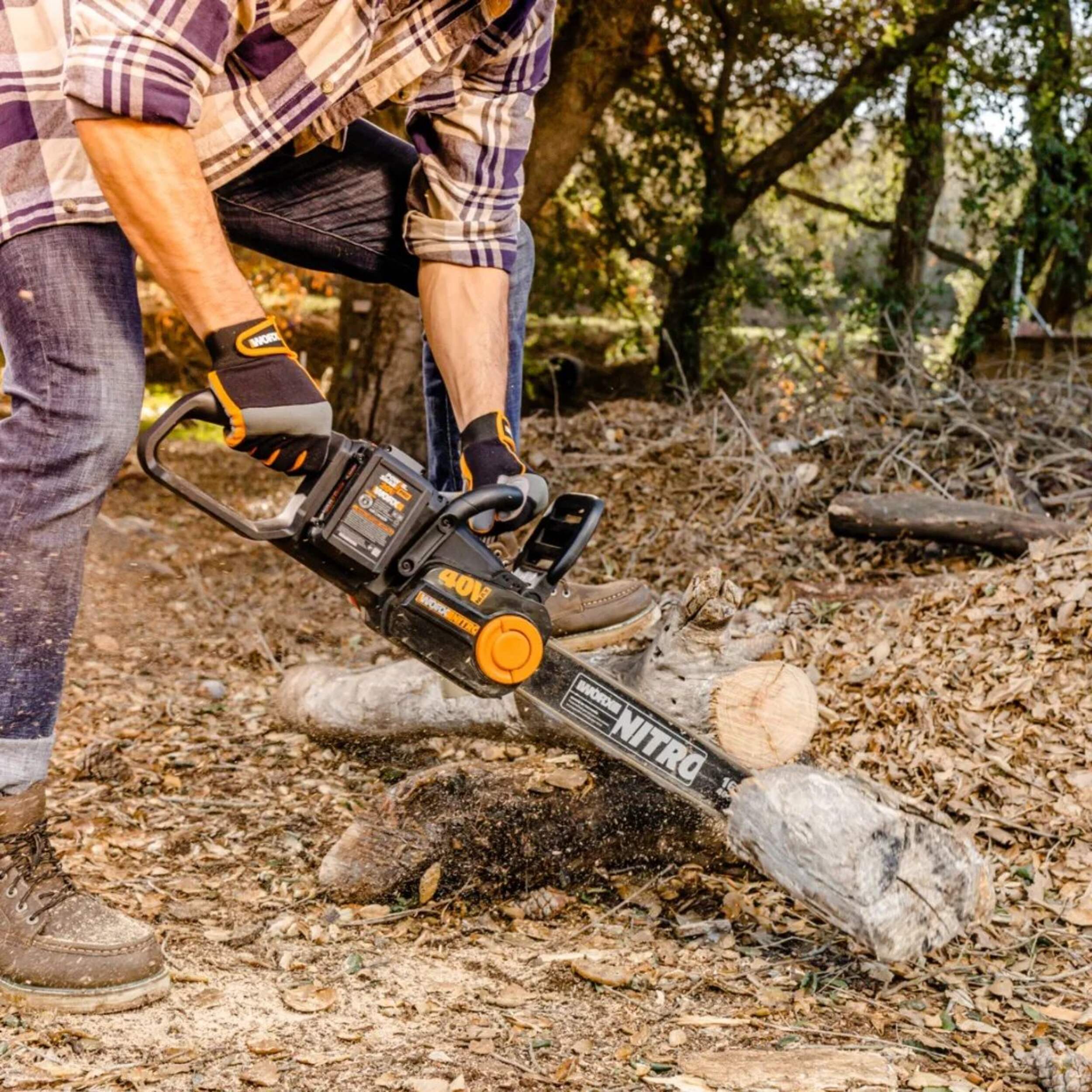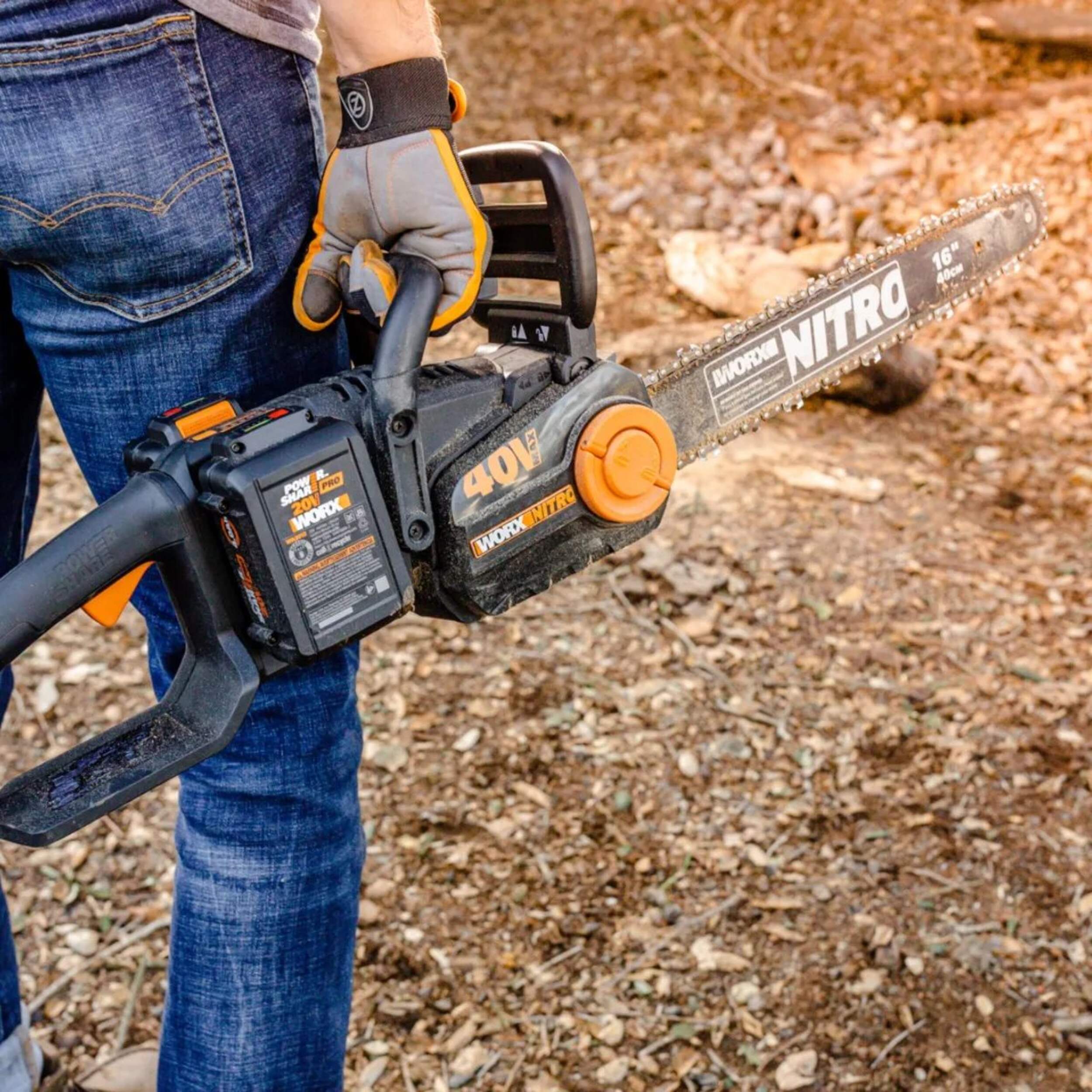 Scie à chaîne sans fil Worx Nitro 40 V Power Share 16 po avec moteur sans balai qui a été développée pour fournir des performances supérieures sans tous les inconvénients de l'utilisation d'un outil à essence. 40 V d'alimentation et un moteur sans balais haute efficacité se combinent pour faire tourner la chaîne à grande vitesse de 16 po à 59 pi/s, mais à une fraction du coût d'exploitation d'une scie à chaîne à essence sur toute sa durée de vie. Scies à chaîne à batterie qui sont moins coûteuses à alimenter et à entretenir et sont plus propres que les outils à essence. Conçues pour un usage professionnel ou pour les bricoleurs avancés. Avec la scie à chaîne Nitro 40 V, vous pouvez couper des bûches jusqu'à 30 po de diamètre sur le sol ou 15 po de diamètre sur les arbres et les branches qui sont encore debout. Système de tension au toucher sans outil qui empêche le serrage excessif de la chaîne et fonction de lubrification automatique de la chaîne qui garantit que vous disposez toujours d'une chaîne bien huilée qui augmente la durée de vie du guide-chaîne et de la chaîne. Pas de la chaîne qui est de 3/8 pouce et scies à chaîne alimentée par batterie qui ne pèse que 15,3 lb avec les batteries installées et 12,4 lb seule. (C'est léger pour une scie à chaîne par rapport aux modèles traditionnels plus anciens.) Parfaite pour les revendeurs de maison ou les propriétaires qui ont besoin de nettoyer la terre ou de hacher les branches d'arbres tombés après une tempête. Géniale pour les équipes de nettoyage de catastrophes ou pour le personnel de la foresterie, de la réserve naturelle et de la faune. Modèle Worx qui n'est pas fourni avec une batterie. Destiné aux utilisateurs de Power Share qui ont déjà des batteries à la maison. C'est ce qu'il y a de bien à propos des outils Power Share, vous économisez de l'argent parce que vous n'avez pas toujours à acheter la batterie.