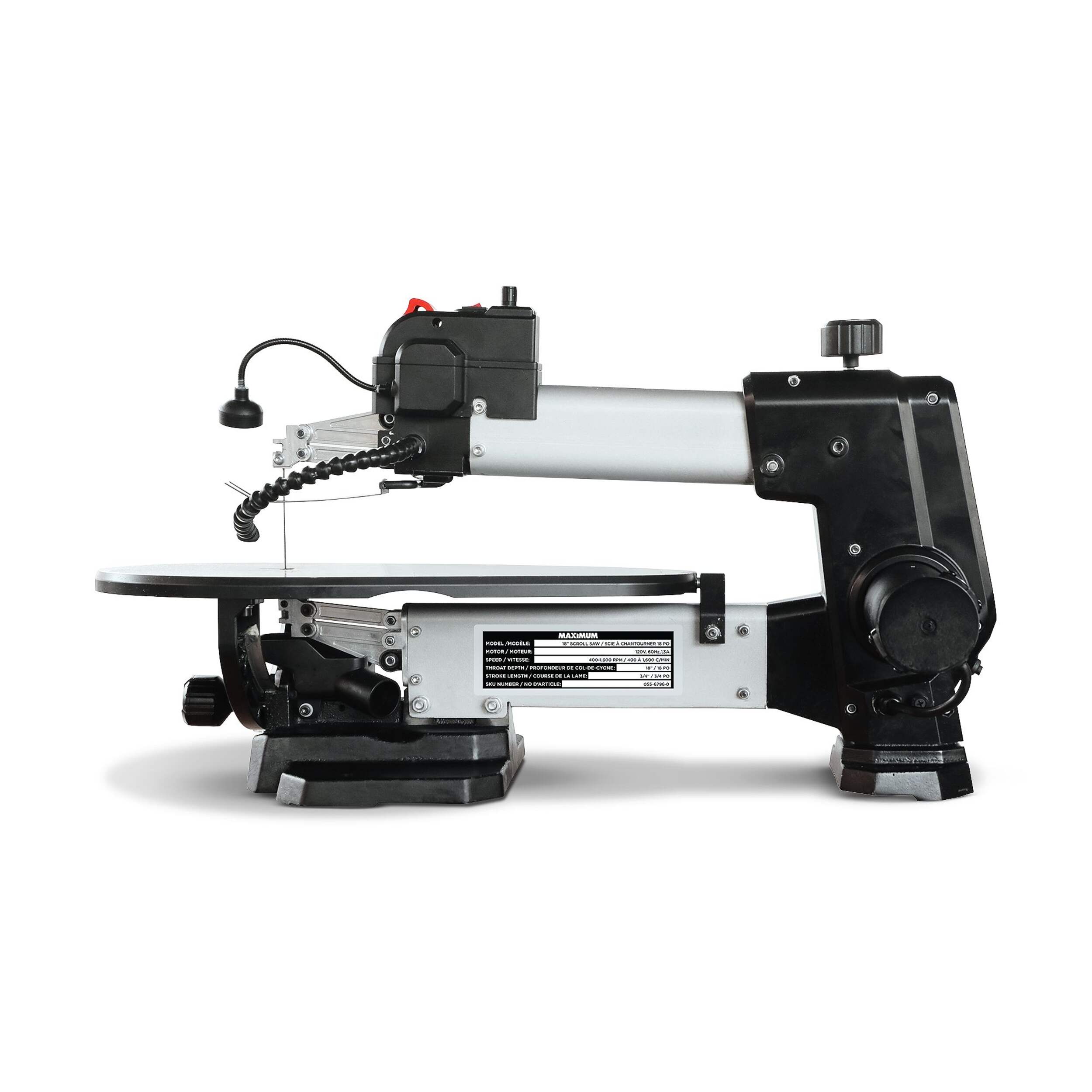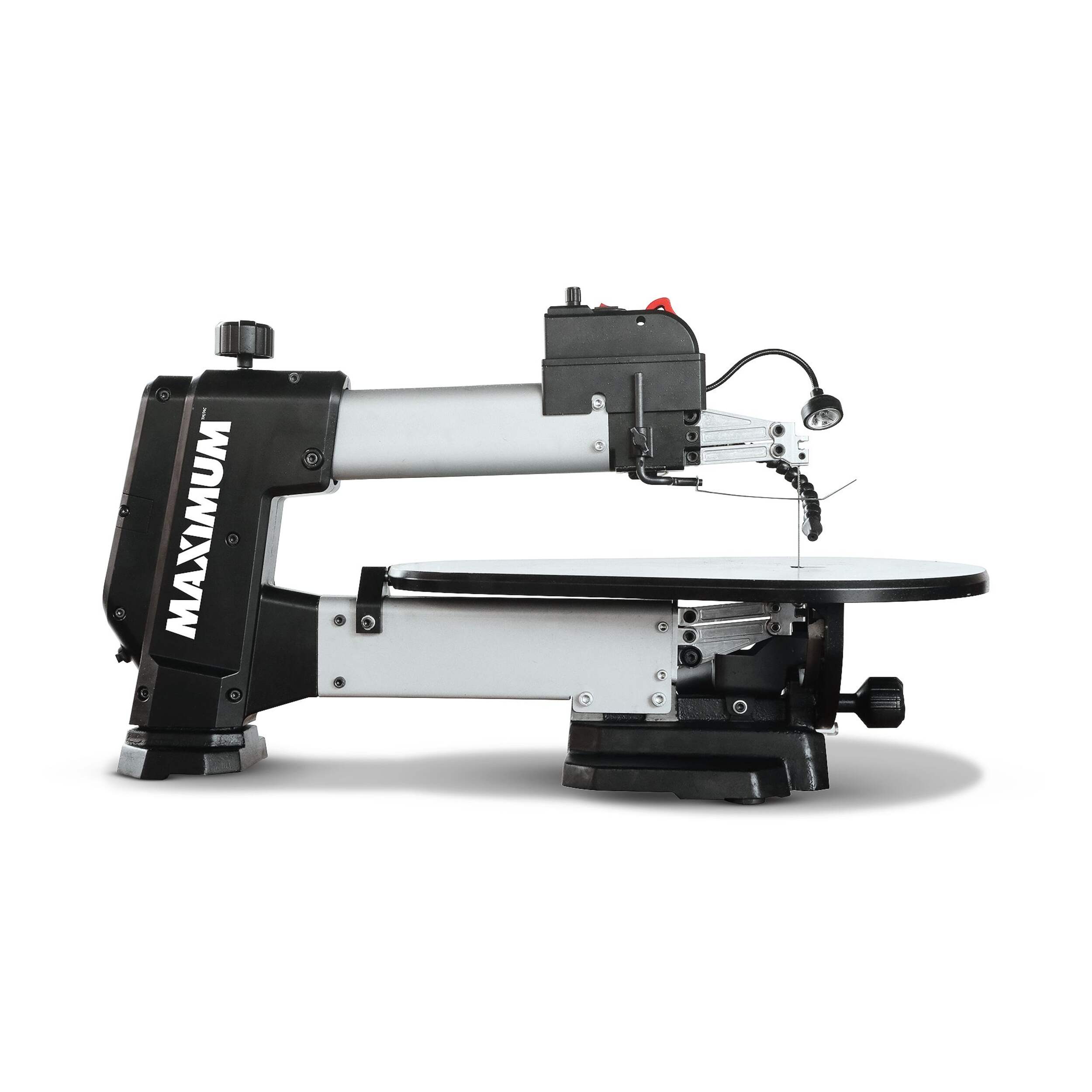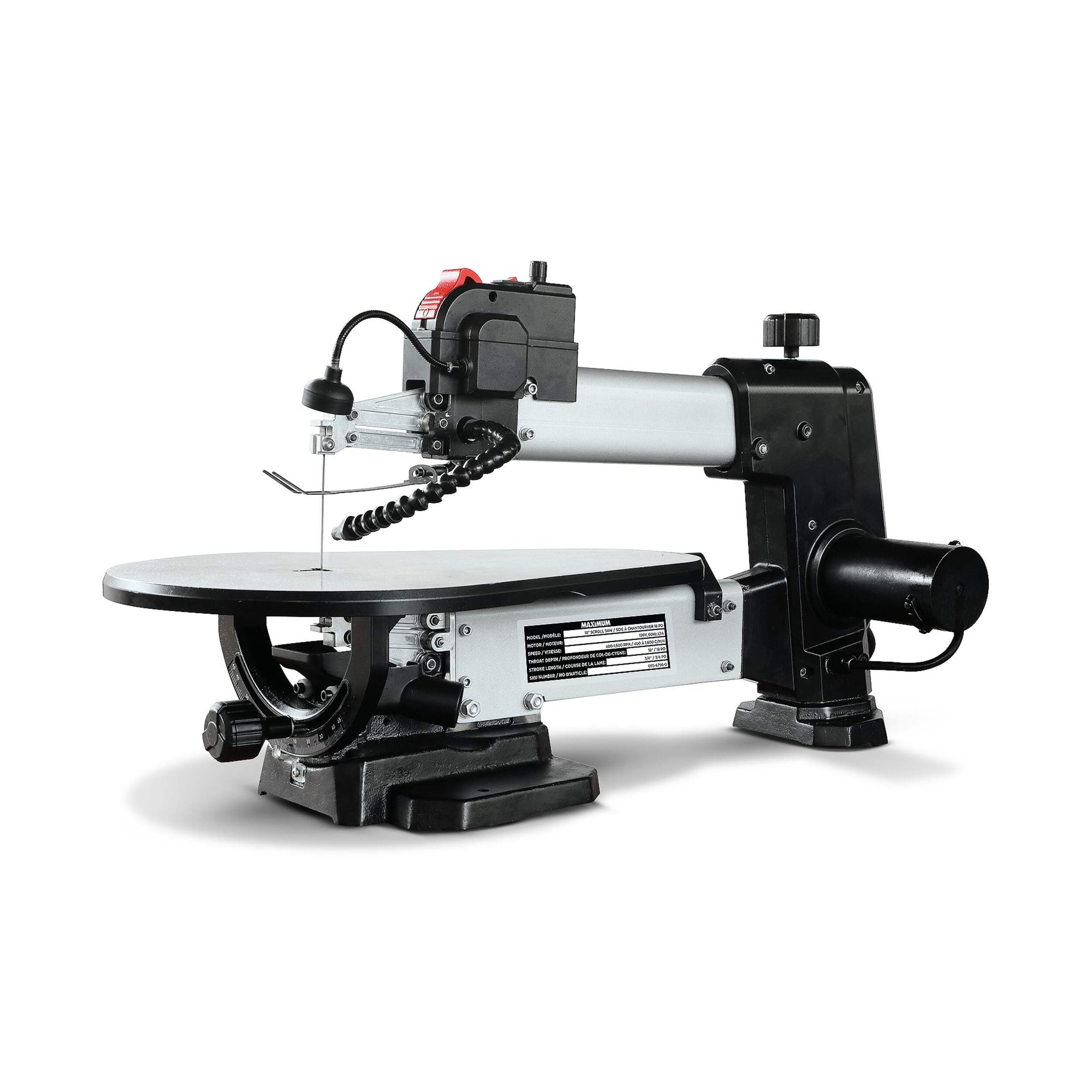 Scie à chantourner MAXIMUM comprenant une scie à vitesse variable polyvalente idéale pour couper le bois et les produits composites, ce qui la rend idéale pour fabriquer des jouets, des casse-têtes, des jeux, des oeuvres d'artet des bijoux. Avec une vitesse variable allant jusqu'à 1 600 tr/min, cette puissante scie de table à double inclinaison MAXIMUM peut être utilisée pour la coupe courbe, la coupe droite et la coupe angulaire. Garantie limitée de 5 ans comprise.