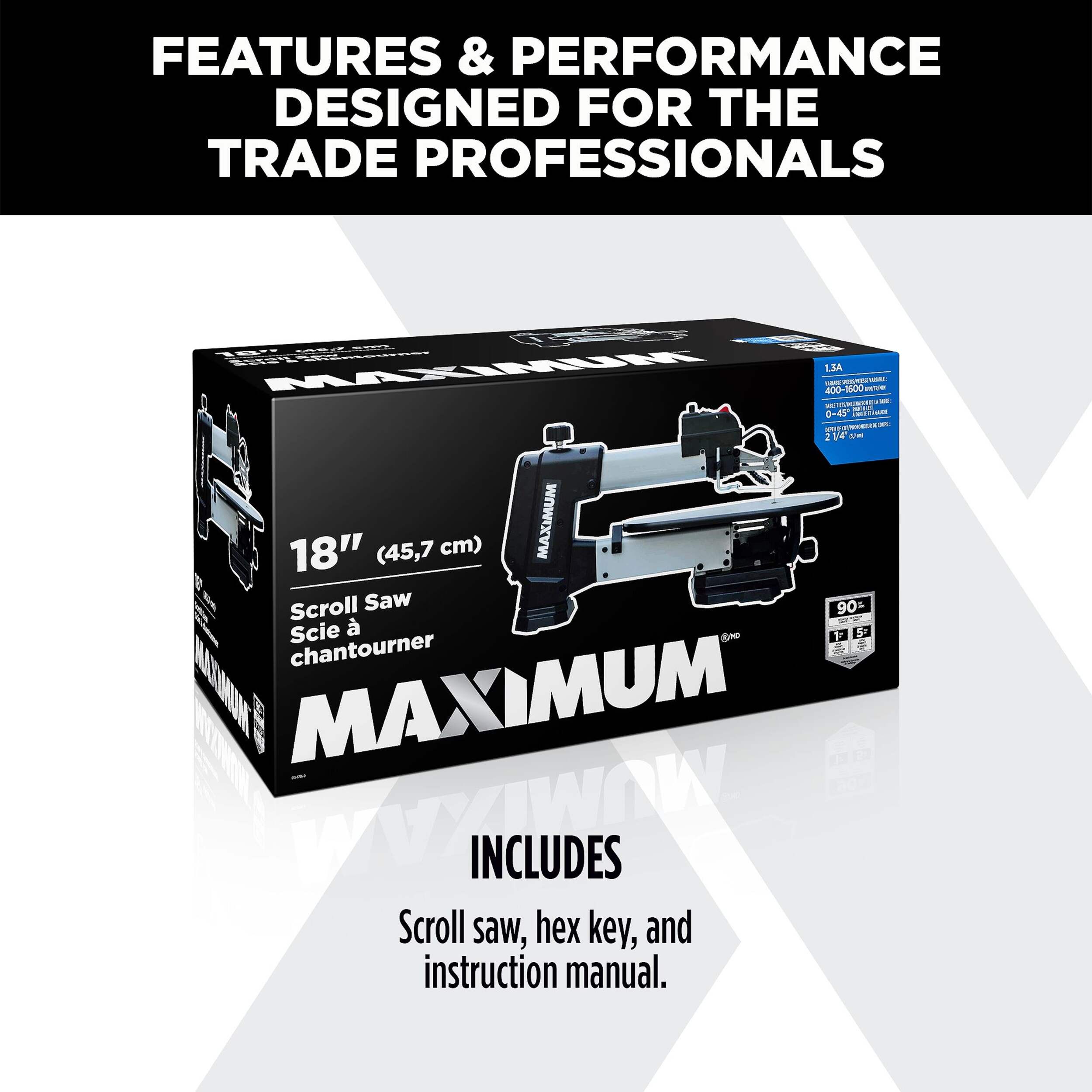 Scie à chantourner MAXIMUM de 18 po dotée d'une grande surface à double inclinaison permettant des coupes en biseau allant jusqu'à 45 degrés de largeur à 45 degrés de rotation