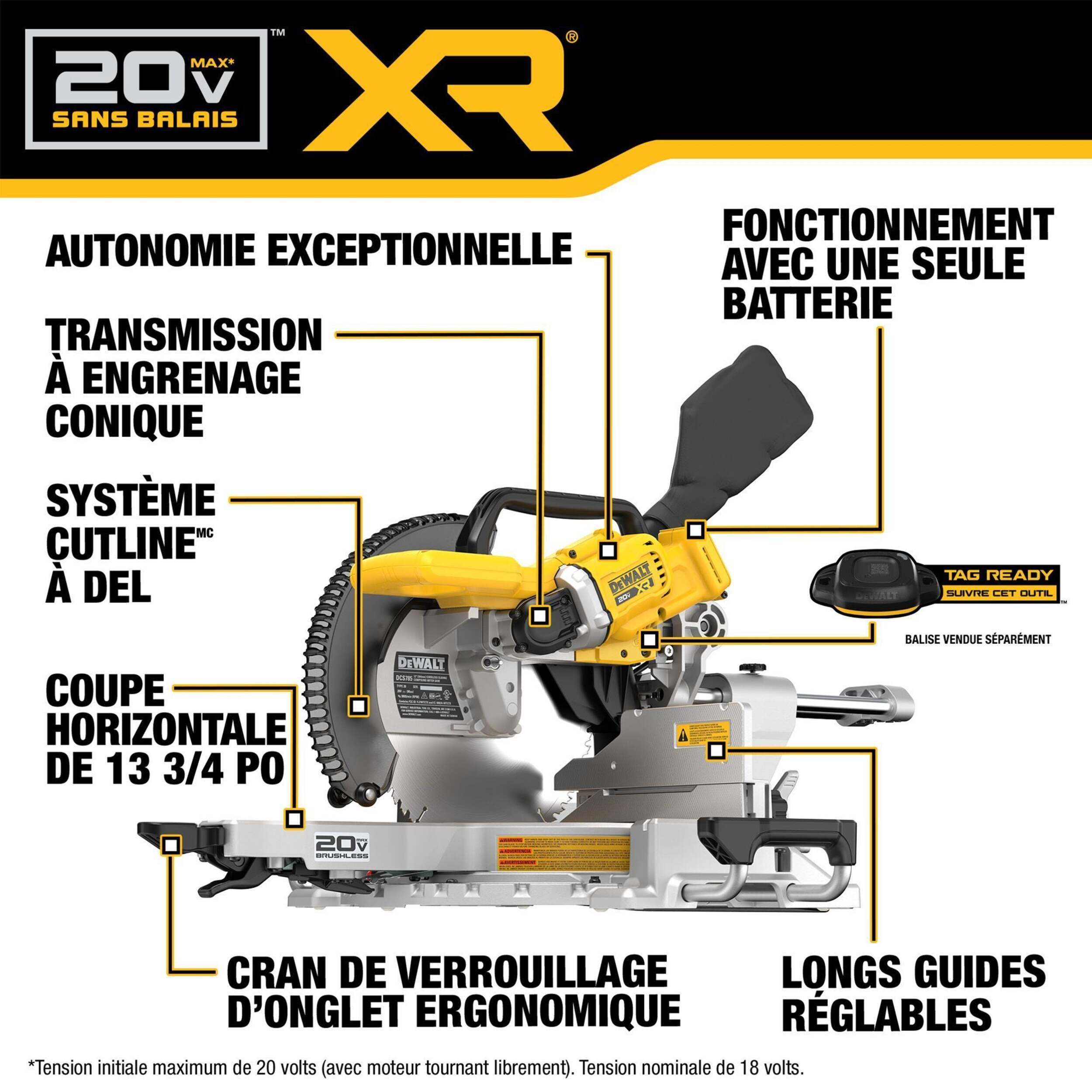 Compatibilité sans fil : première scie à onglets DEWALT de 12 po compatible avec toute la gamme de batteries DEWALT 20 V MAX* et DEWALT FLEXVOLTMD (vendues séparément)