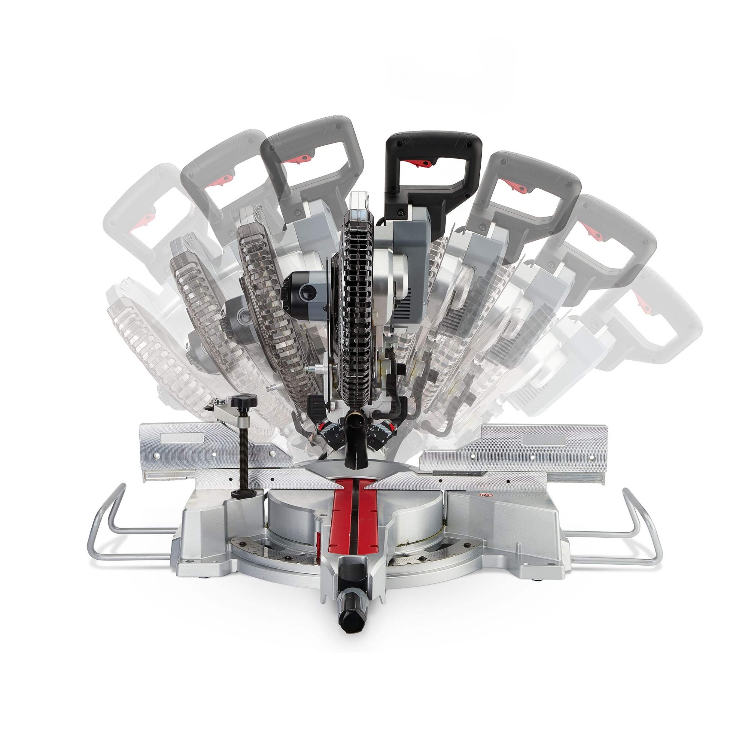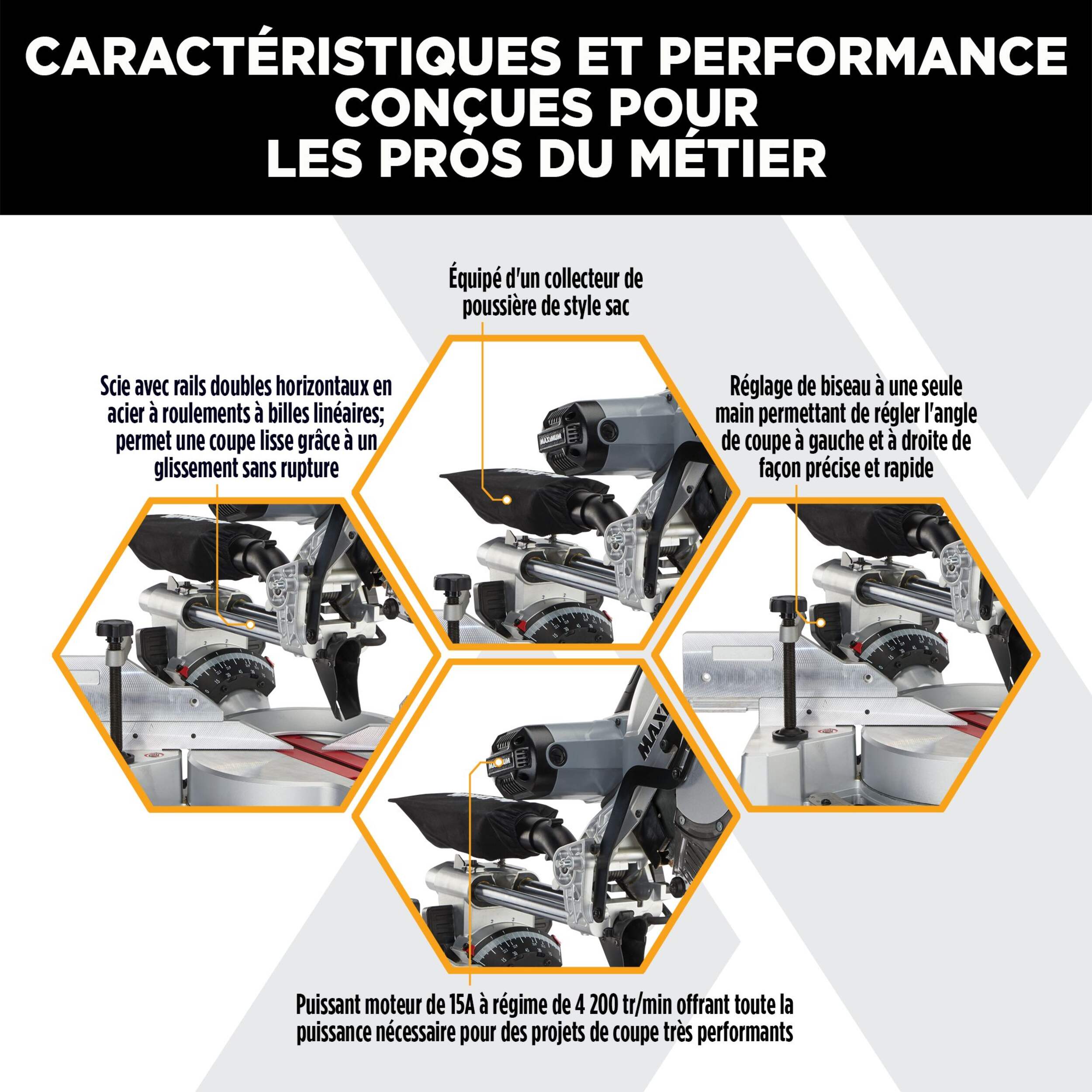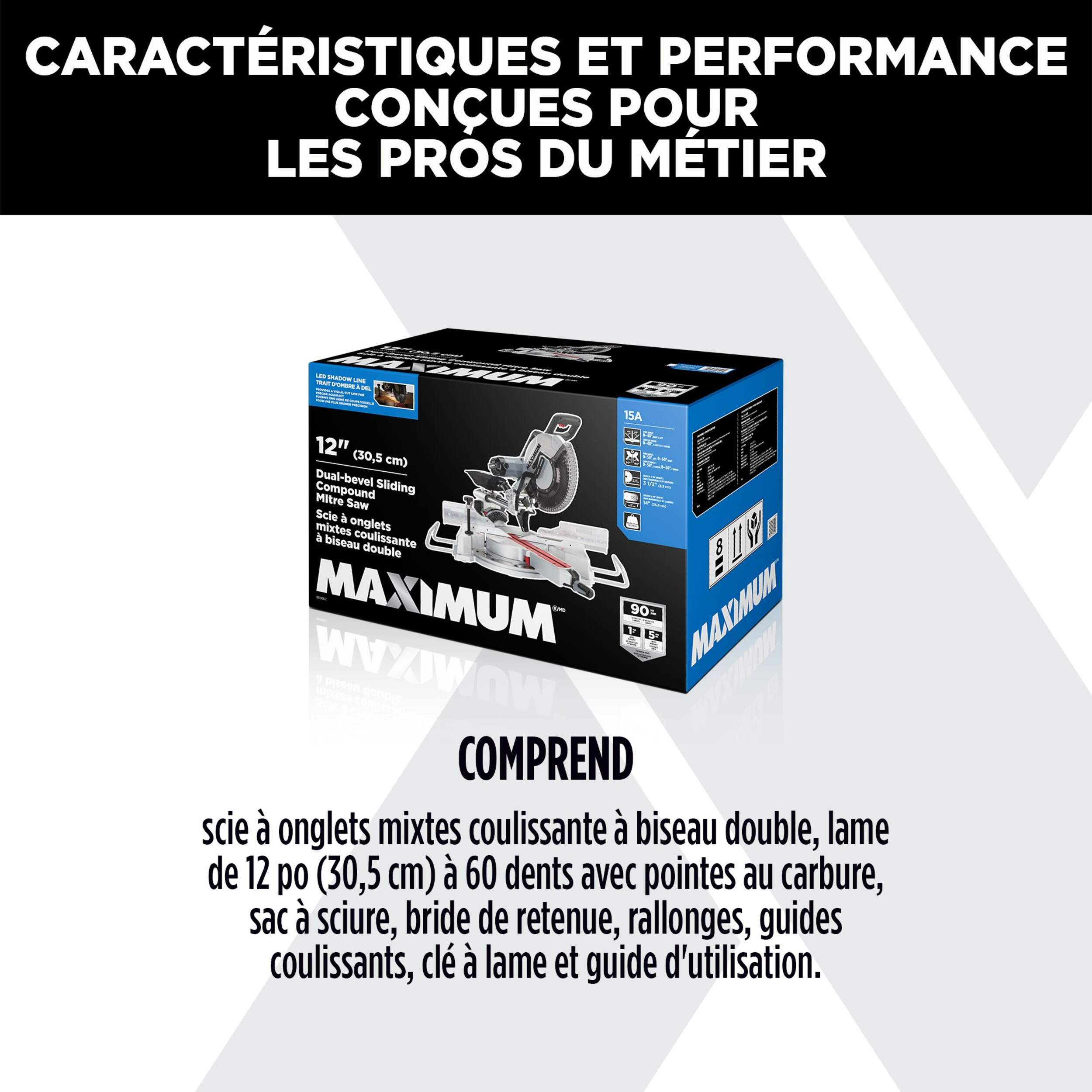 INCLUT : Scie à onglets combinée coulissante à double biseau, lame de scie au carbure à 60 dents de 30,5 cm (12 po), sac à poussière, bride d'étau, ailettes de rallonge, guides coulissants, clé à lame et manuel d'instructions