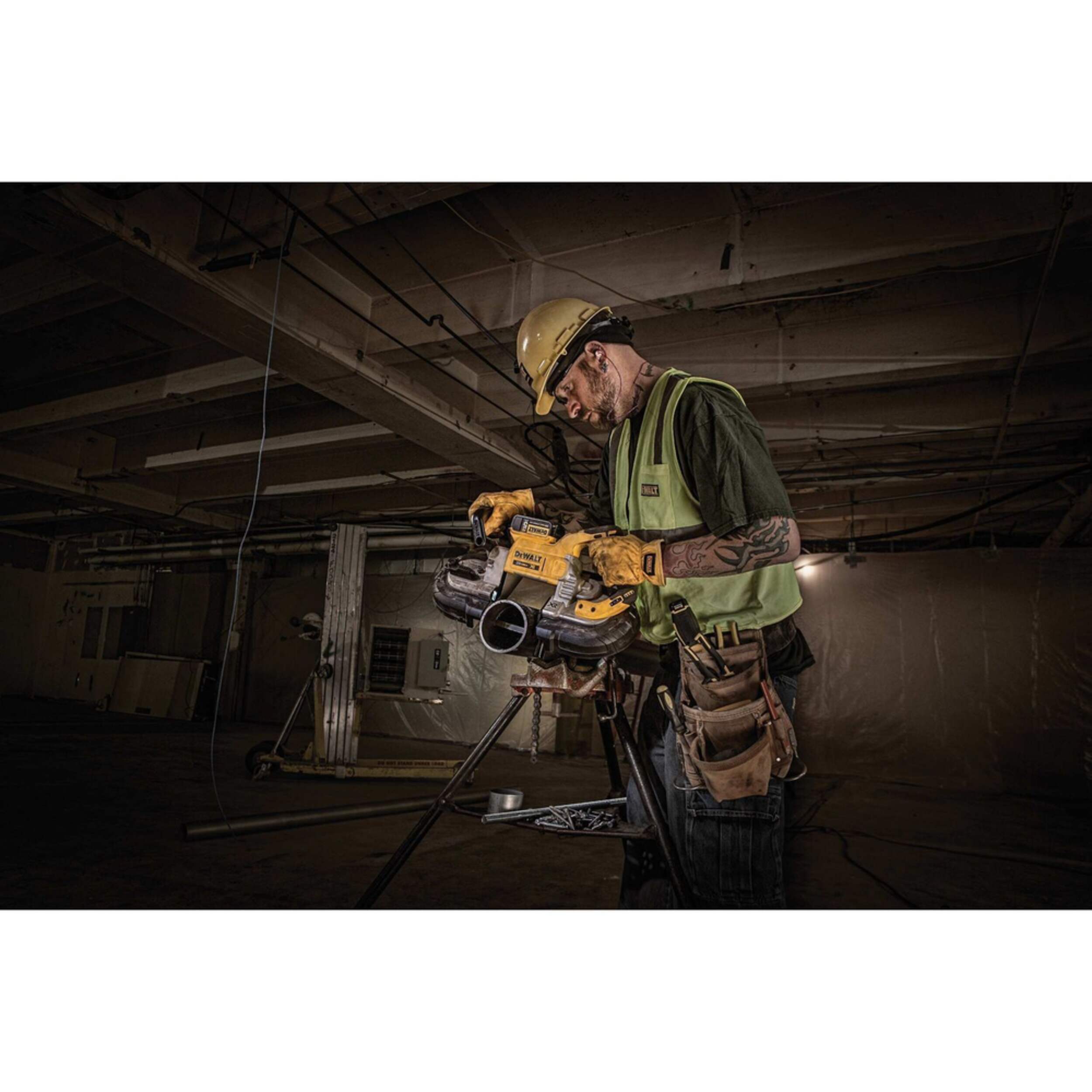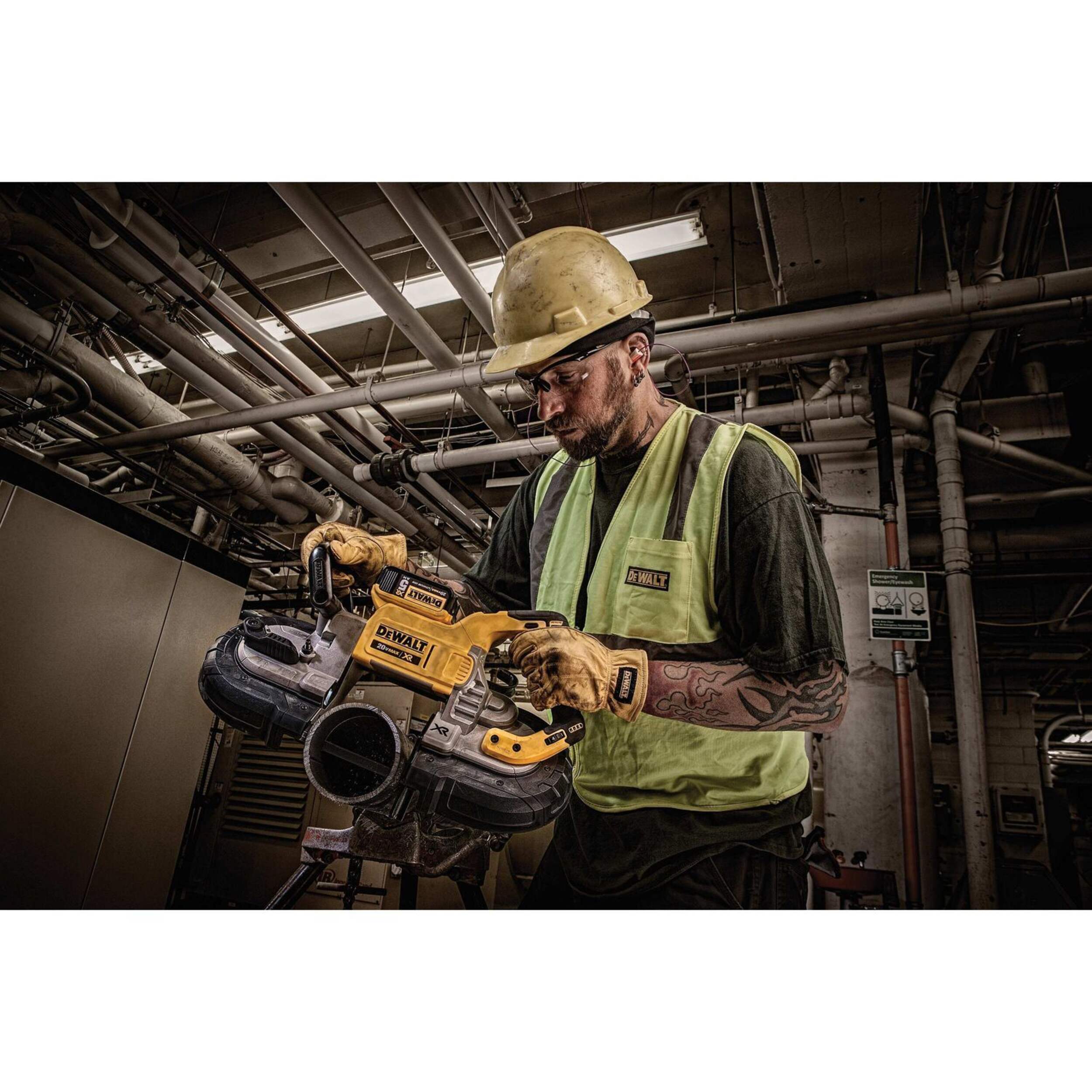 Scie à ruban sans balai 20 V MAX offrant la puissance et la durée de fonctionnement que vous attendez de DEWALT. Avec un moteur sans balais 20 V MAX et (2) batteries 20 V MAX de 5 Ah, la scie à ruban DEWALT de 20 V peut couper jusqu'à 5 po x 4-3/4 po de matériau rectangulaire et jusqu'à 4 po de matériau rond. Compatible avec toutes les batteries DEWALT 20 V MAX et FLEXVOLT, comprend un contrôle de vitesse de lame de scie à ruban, un crochet de suspension intégré et une base en caoutchouc durable.