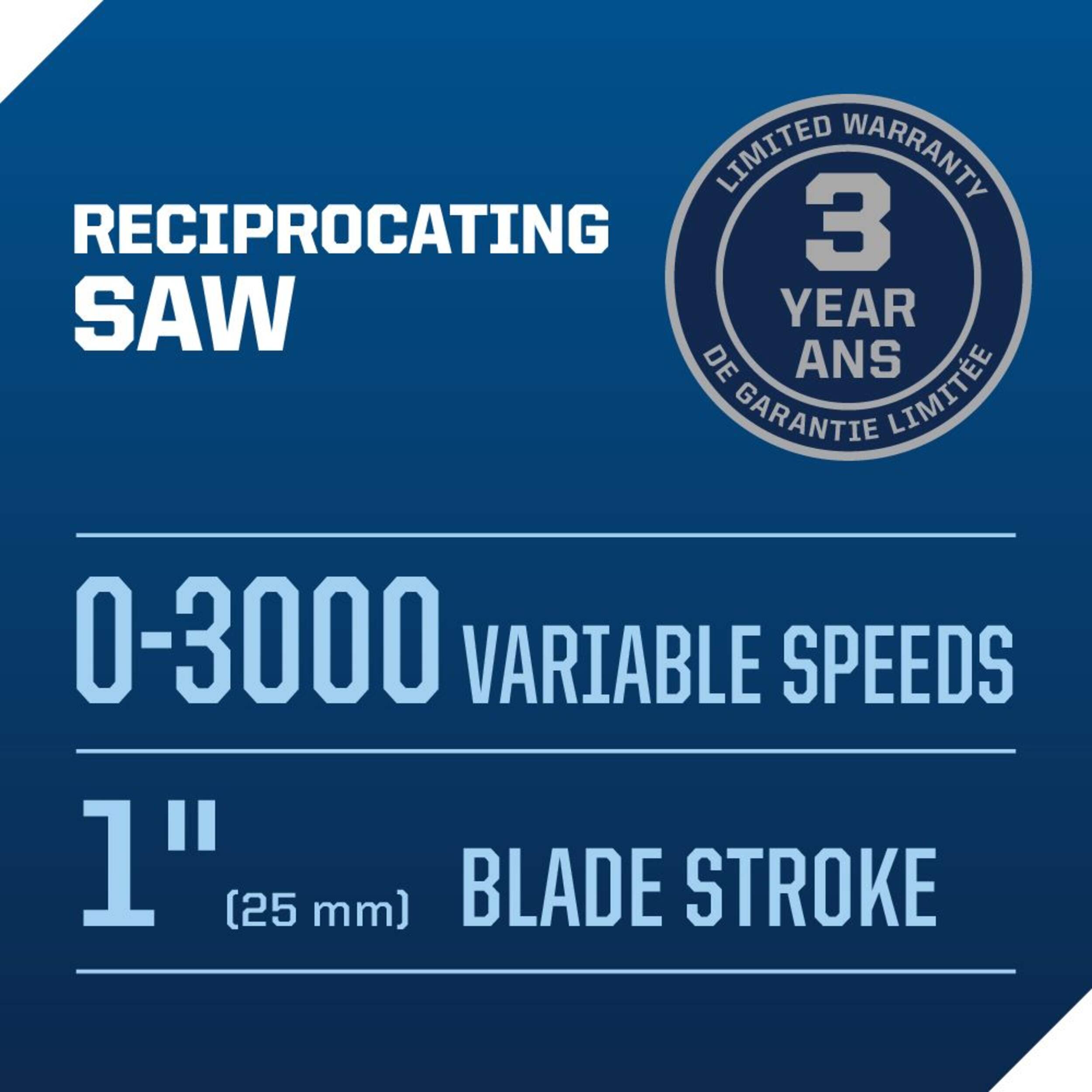 Vitesse variable de 0 à 3 000 coups/min pour couper des planches de bois, de métal et d'autres matériaux