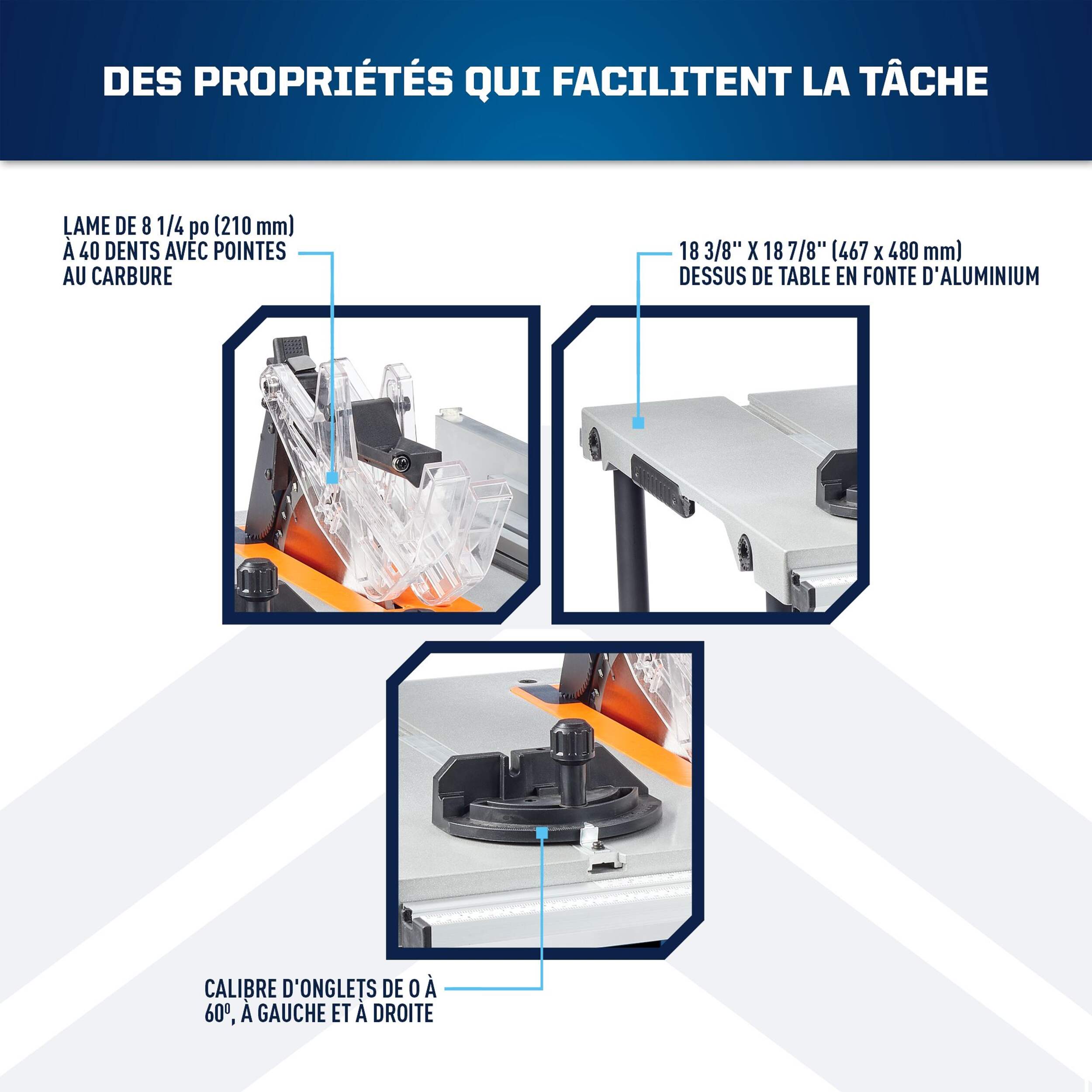 Capacité de coupe de 2 3⁄4 po à 90°, capacité de coupe de 1 3/4 po à 45°