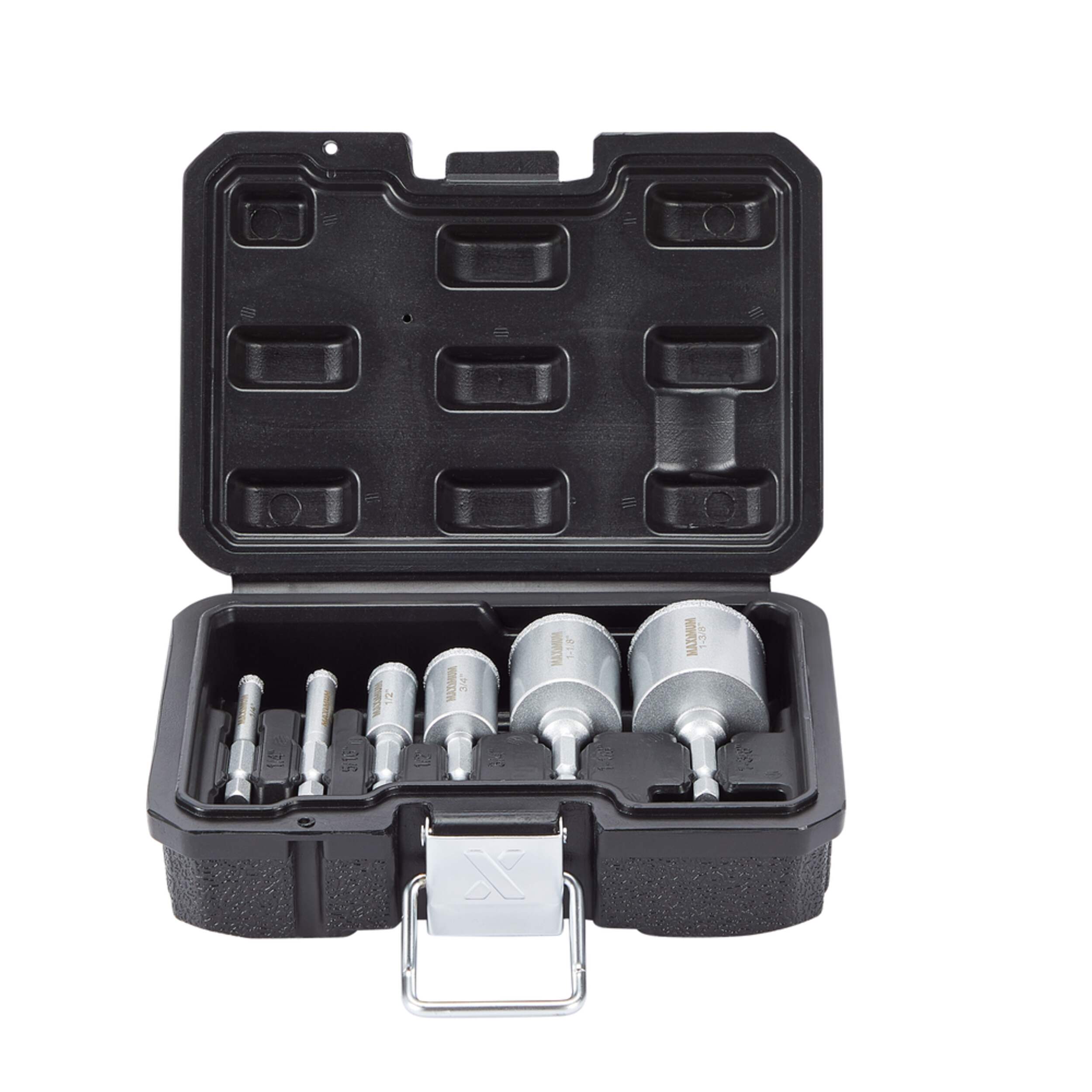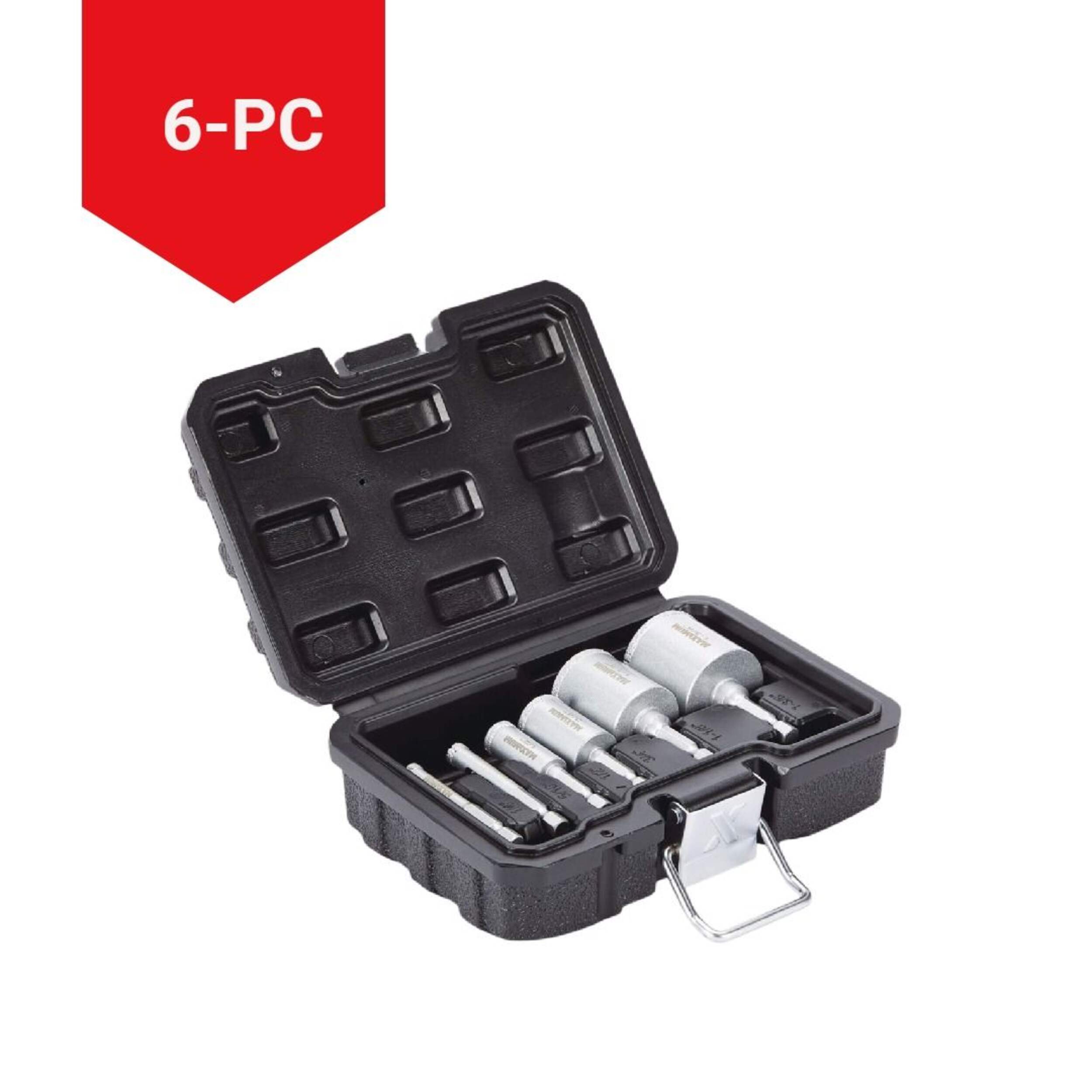 Comprend : Scies-cloches : 6,4 mm (1/4 po), 8 mm (5/16 po), 1,3 cm (1/2 po), 1,9 cm (3/4 po), 2,8 cm (1-1/8 po) et 3,5 cm (1-3/8 po)