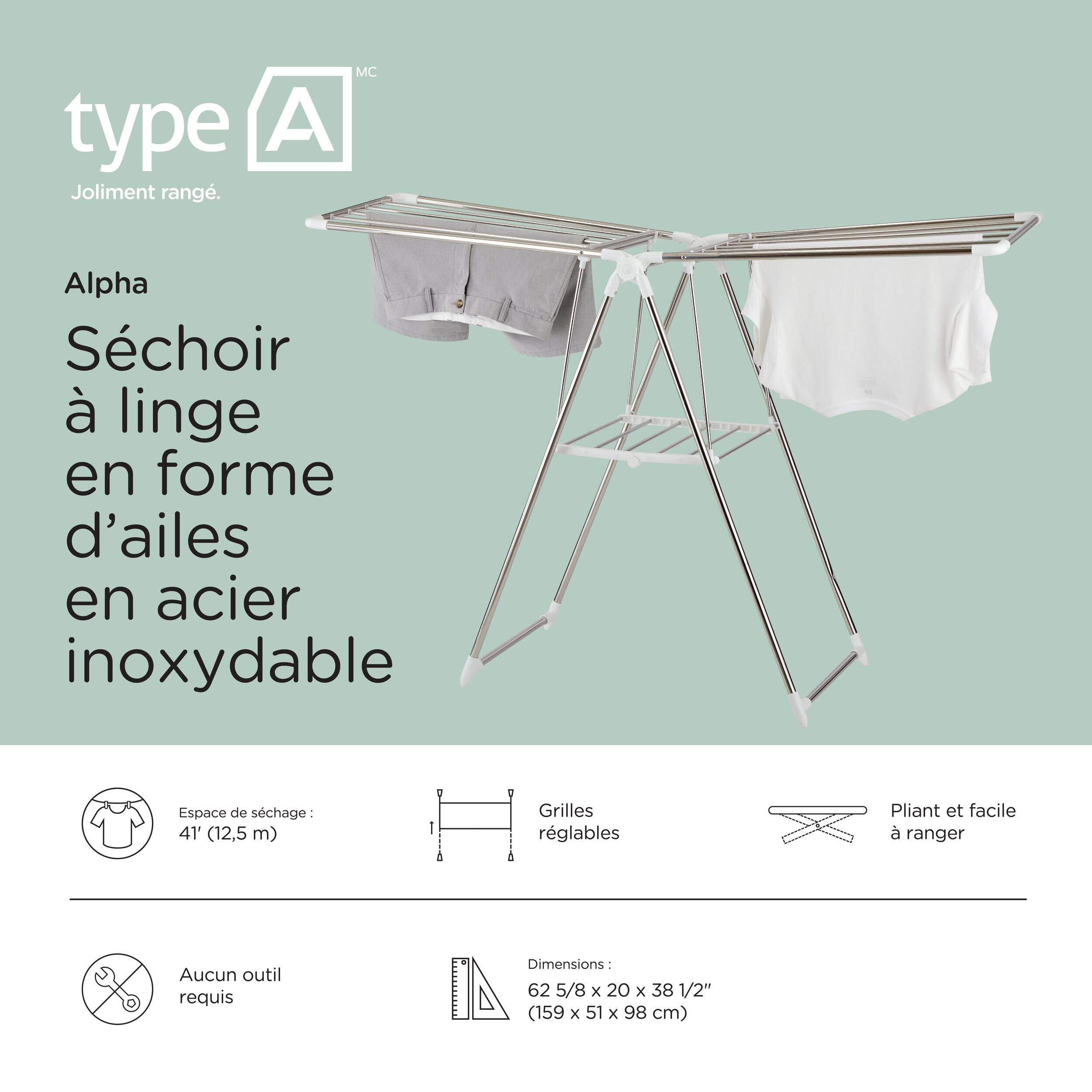 Séchez vos vêtements et tissus de façon écologique avec le séchoir à linge en acier inoxydable Type A Gullwing. Conçu avec des ailes ajustables dotées de plusieurs fentes de séchage, ce séchoir permet de sécher à l'air libre efficacement divers articles comme des couches en tissu, des serviettes et des maillots de bain. Sa construction résiste à la rouille et à la corrosion et conserve une apparence élégante même après une exposition prolongée à l'humidité. Idéal pour une variété d'utilisations, ce séchoir à linge se replie facilement pour un rangement compact lorsque vous ne l'utilisez pas.