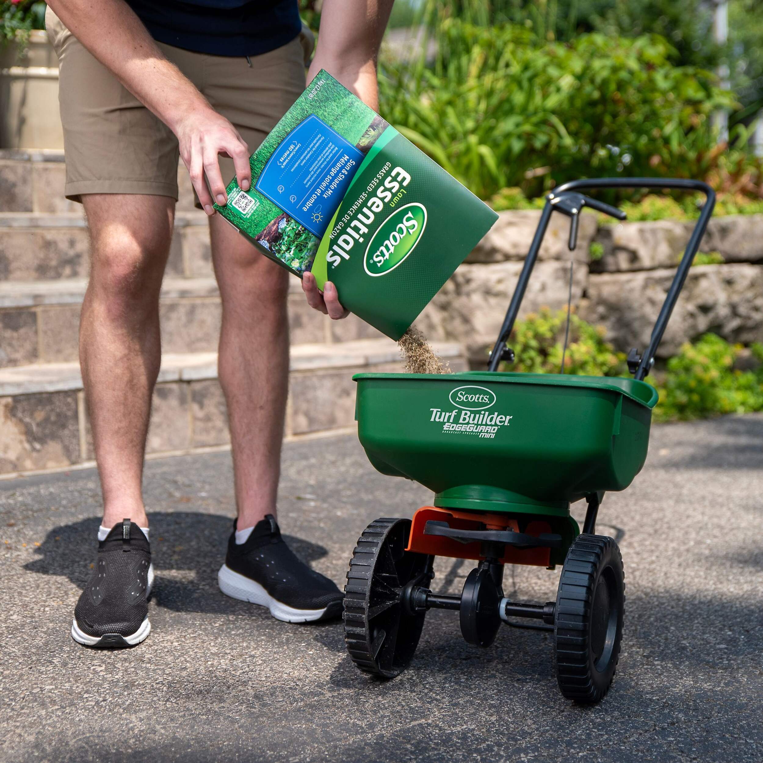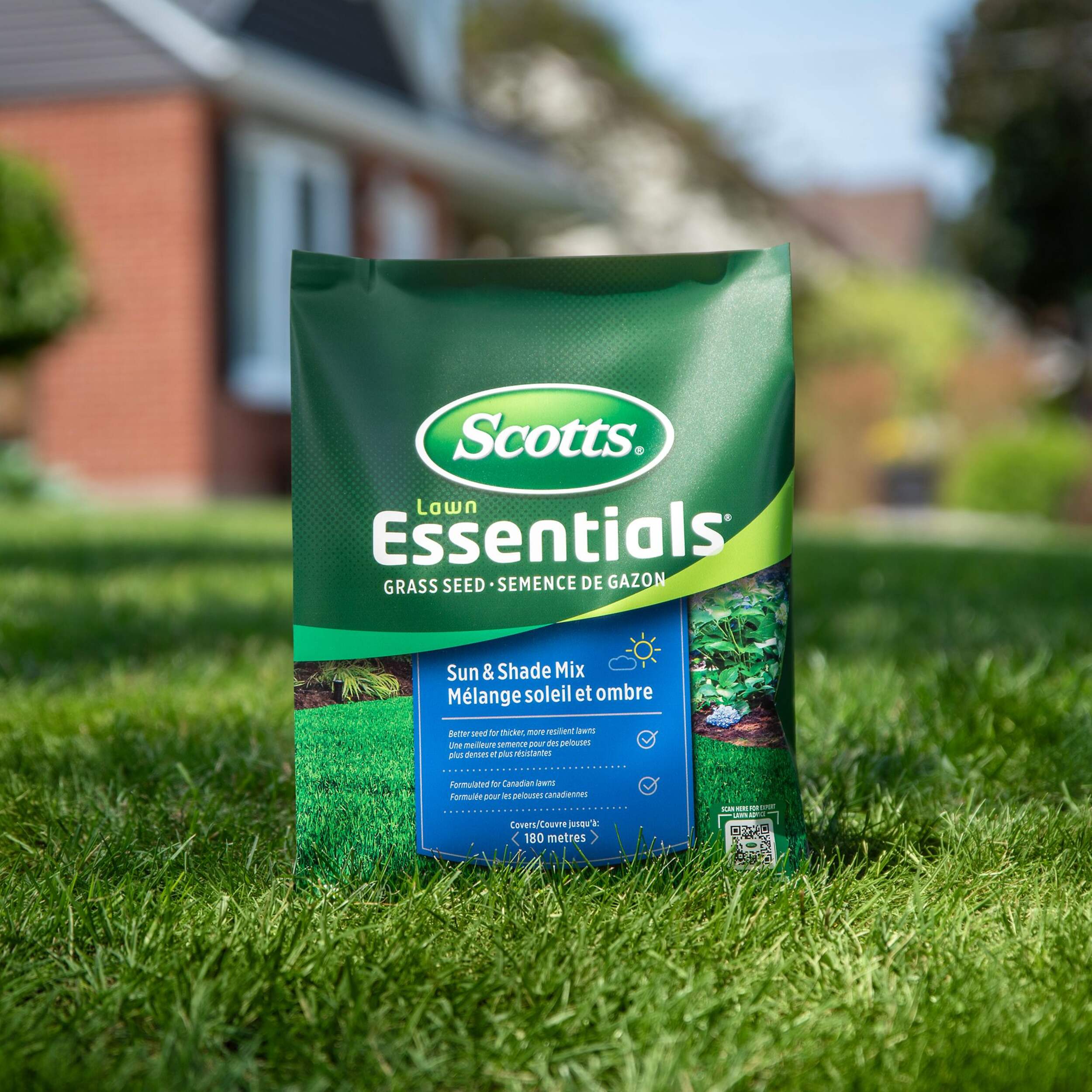 Mélange soleil et ombre de semences à pelouse ScottsMD Lawn EssentialsMC qui peut aider à obtenir une pelouse plus épaisse et plus résistante, dans le cadre d'un programme d'entretien de pelouse sain