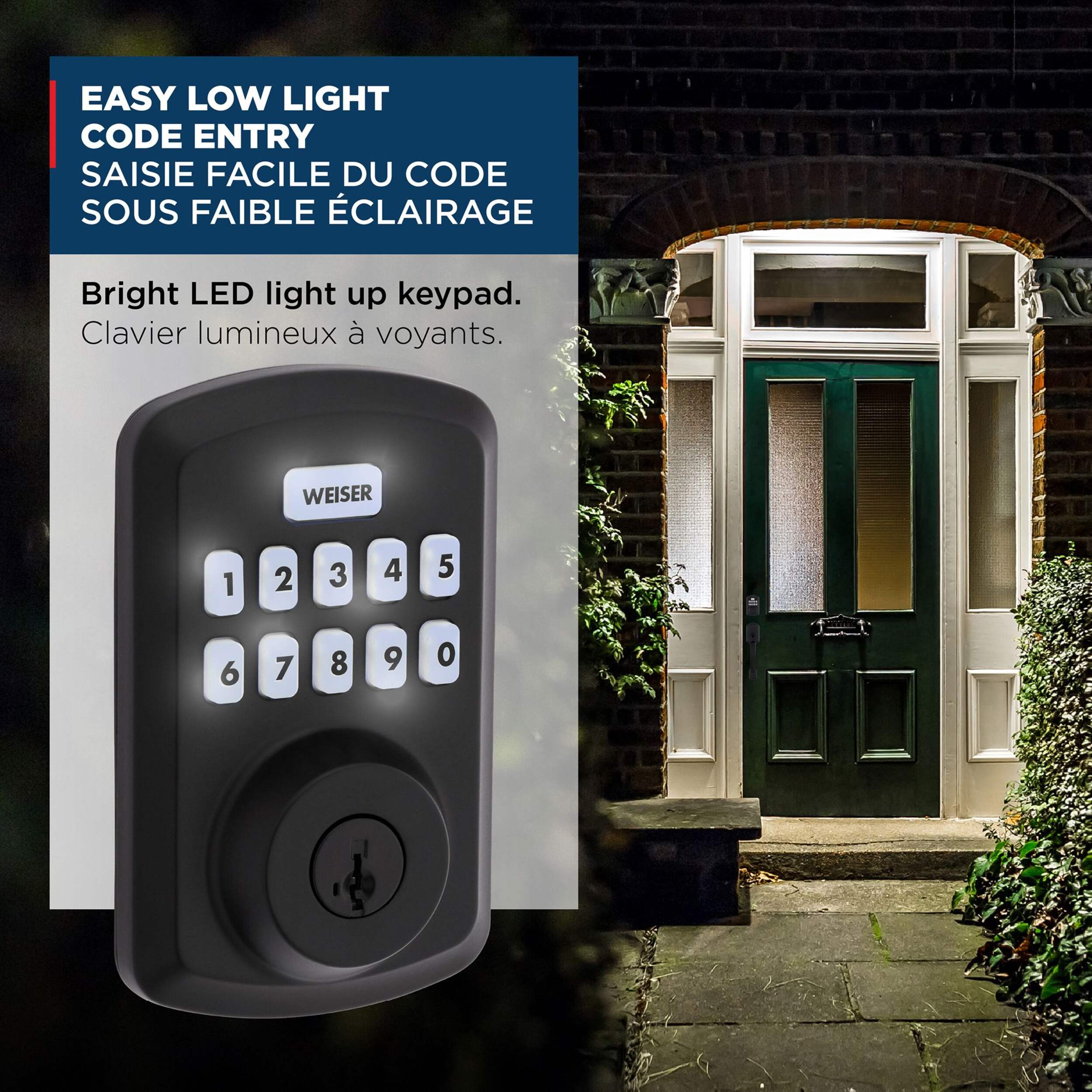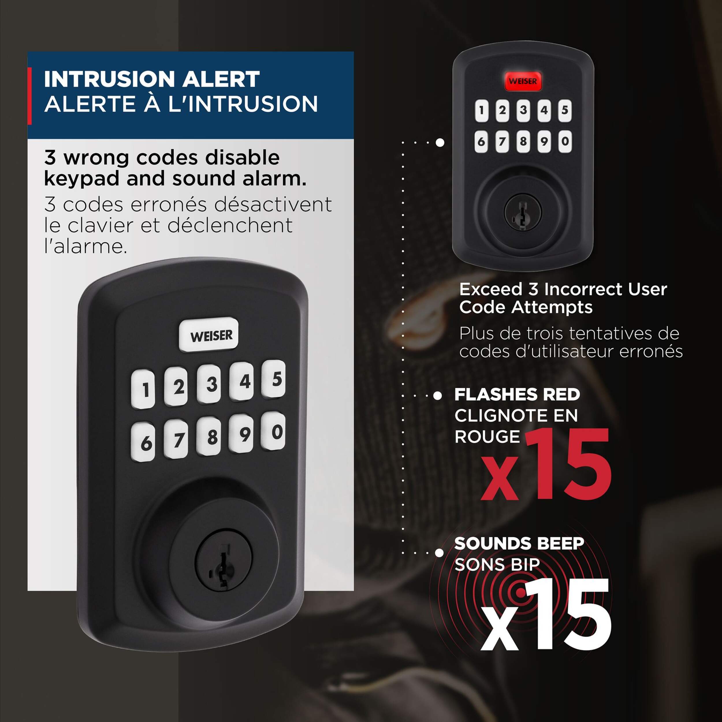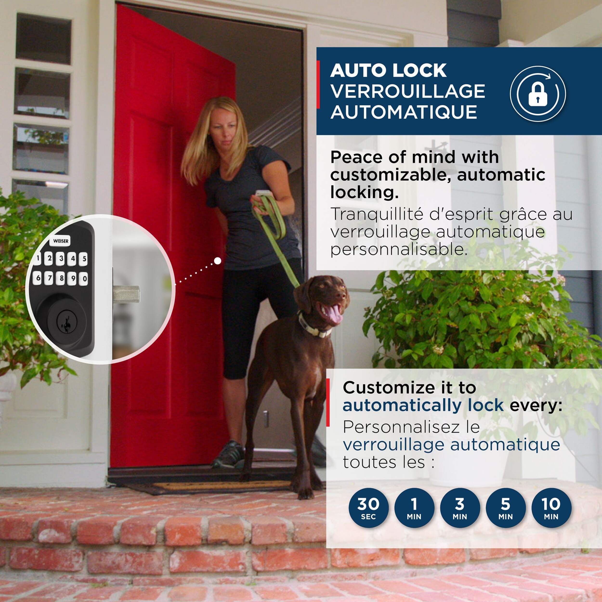 Améliorez la sécurité de votre maison avec la serrure à pêne dormant à clavier électronique Weiser Powerbolt 3. Entrez facilement dans votre maison à l'aide du clavier et des codes d'accès personnalisables pour une entrée sans tracas. La fonction de verrouillage automatique sécurise votre porte après un délai prédéfini, ce qui améliore la sécurité. Grâce à la technologie SmartKey, vous pouvez facilement changer le cylindre de la serrure pour une commodité accrue. De plus, les alertes d'intrusion intégrées activent une alarme de 1 minute et le verrouillage après trois entrées de code incorrectes, ce qui aide à assurer la sécurité de votre maison en tout temps.
