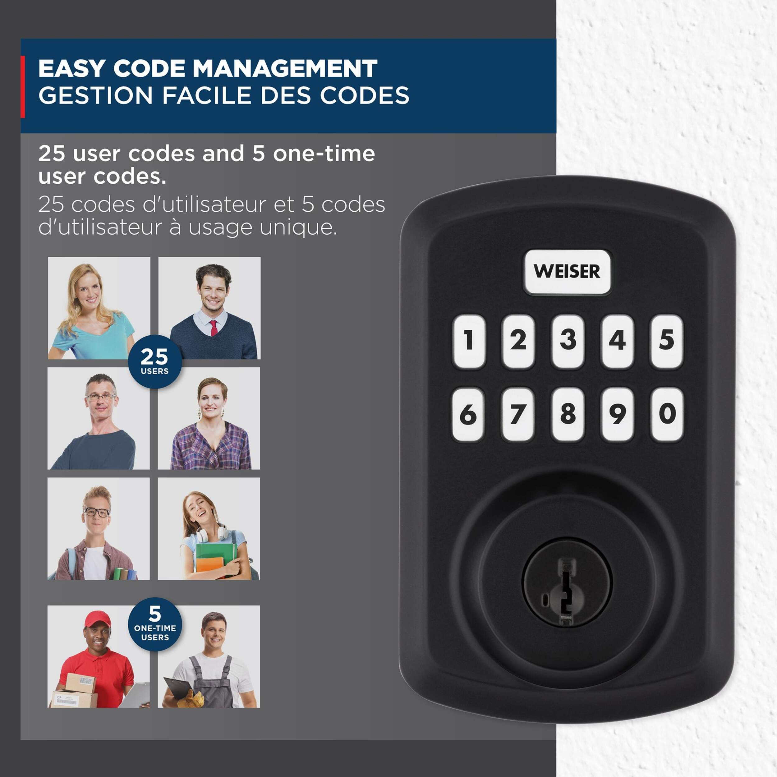 GESTION FACILE DU CODE : Personnalisez jusqu'à 25 codes d'utilisateur, 5 codes d'utilisateur uniques et 1 code de programmation qui vous permet de modifier ou de supprimer des codes d'utilisateur quand vous en avez besoin