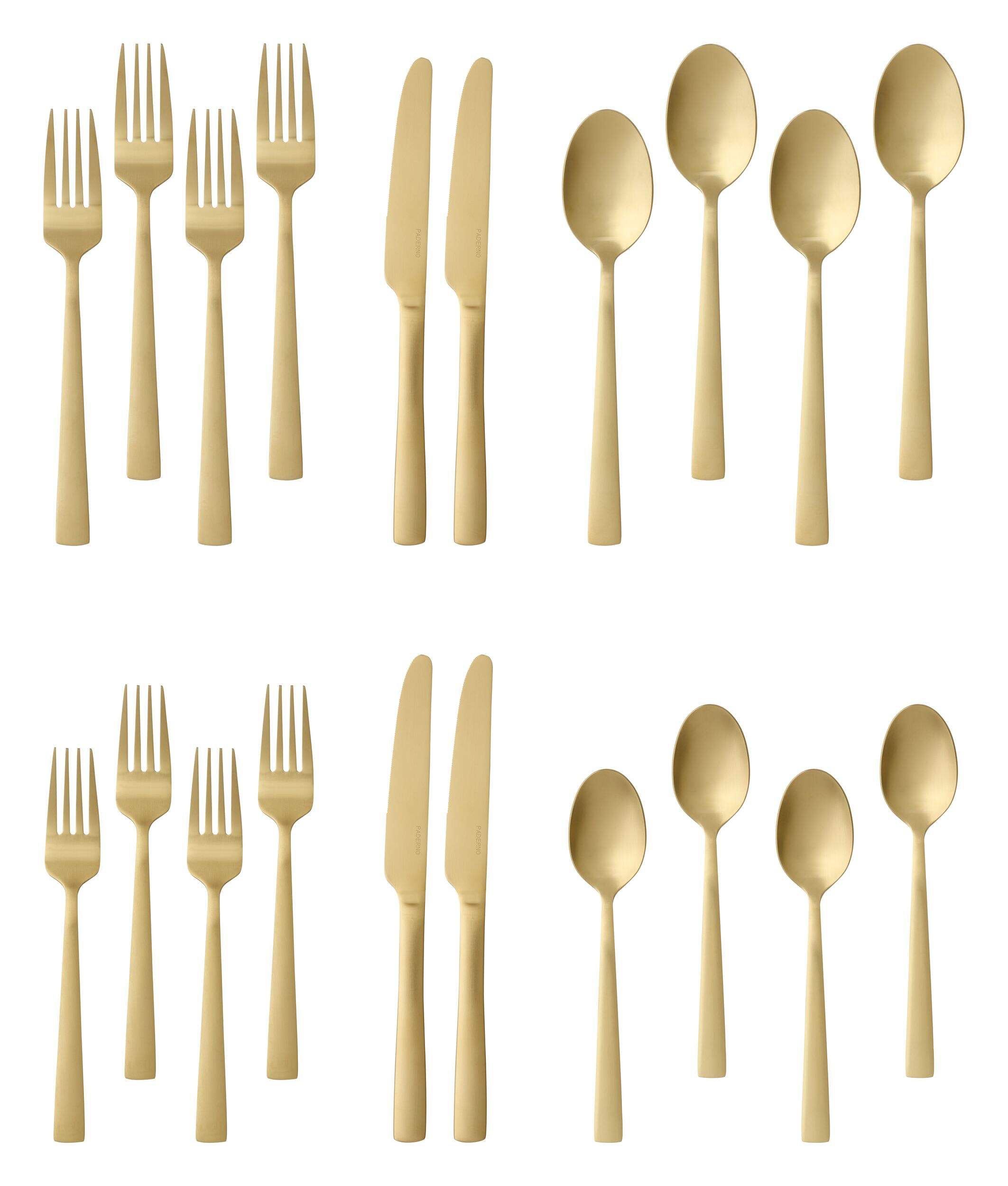 Comprend 4 couteaux de table, 4 fourchettes à salade, 4 fourchettes, 4 cuillères à soupe et 4 cuillères à thé
