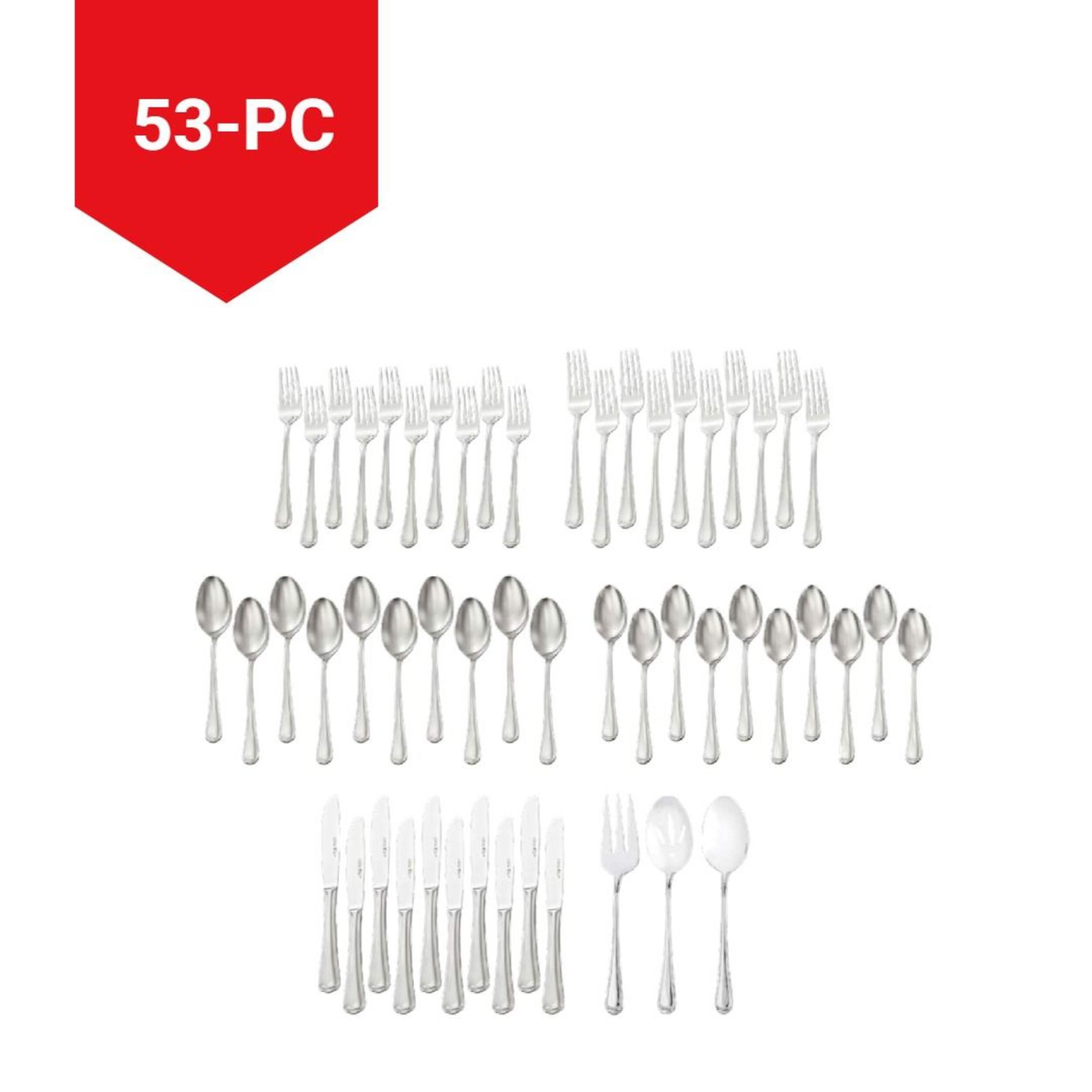Jeu de 53 pièces comprenant : 10 couteaux de table, 10 fourchettes de table, 10 cuillères de table, 10 fourchettes à salade, 10 cuillères à thé, 1 cuillère de service, 1 cuillère à égoutter et 1 fourchette de service