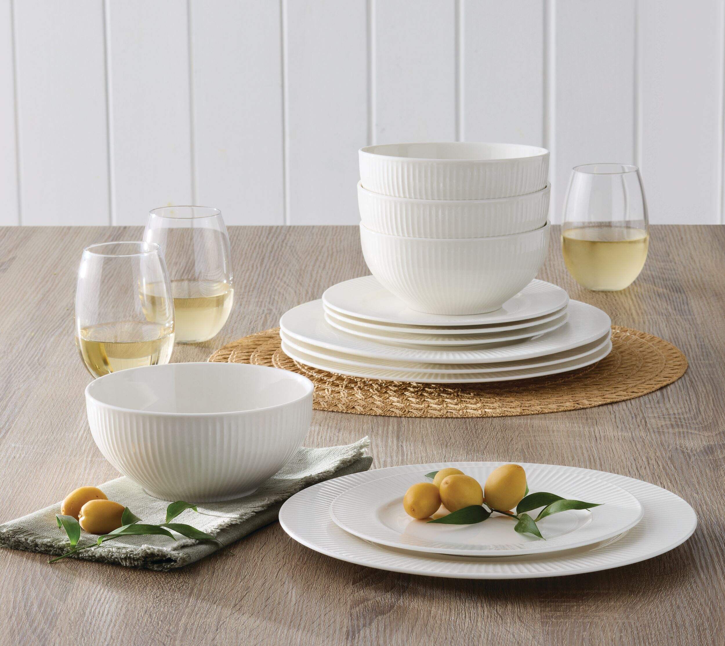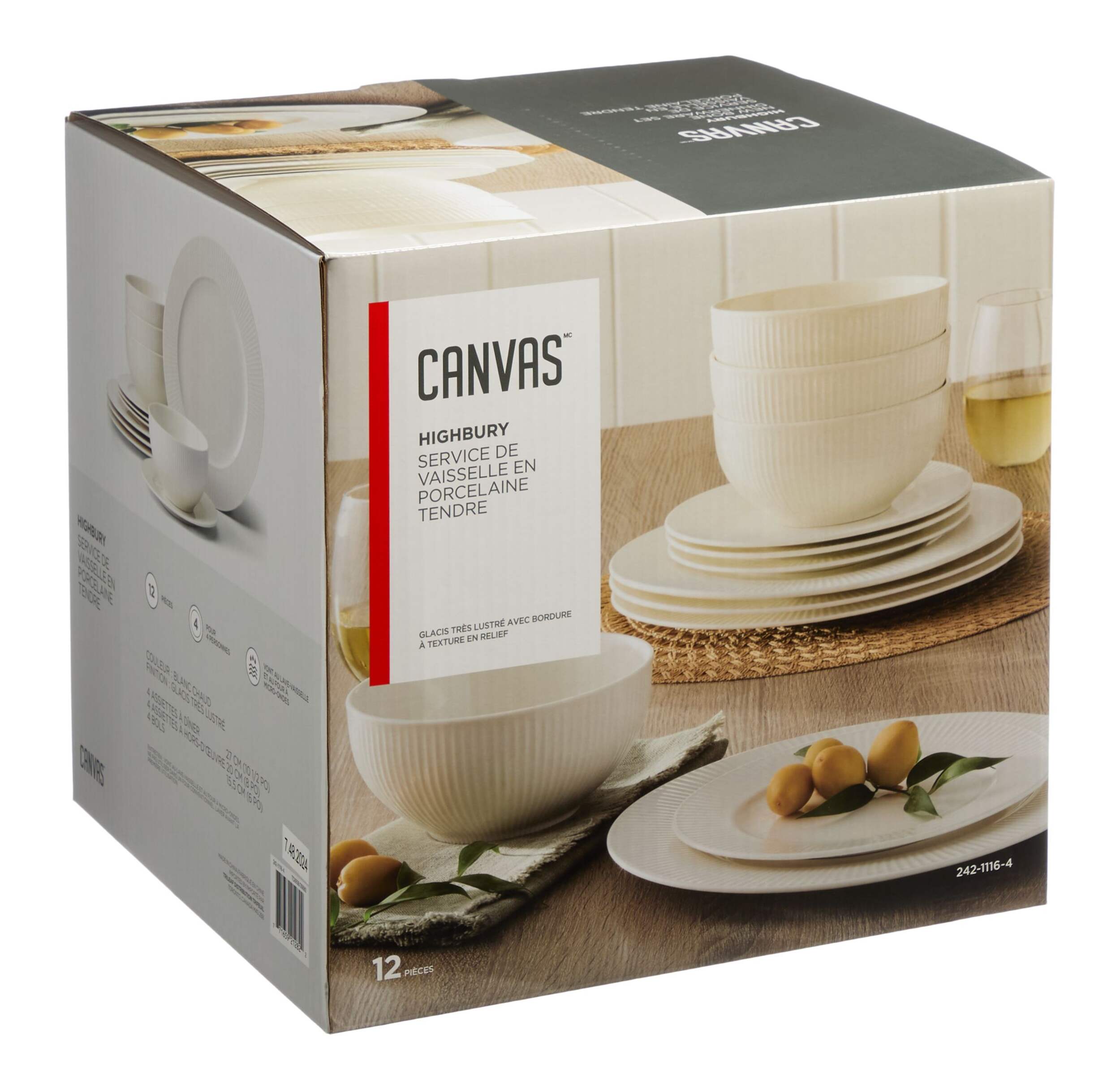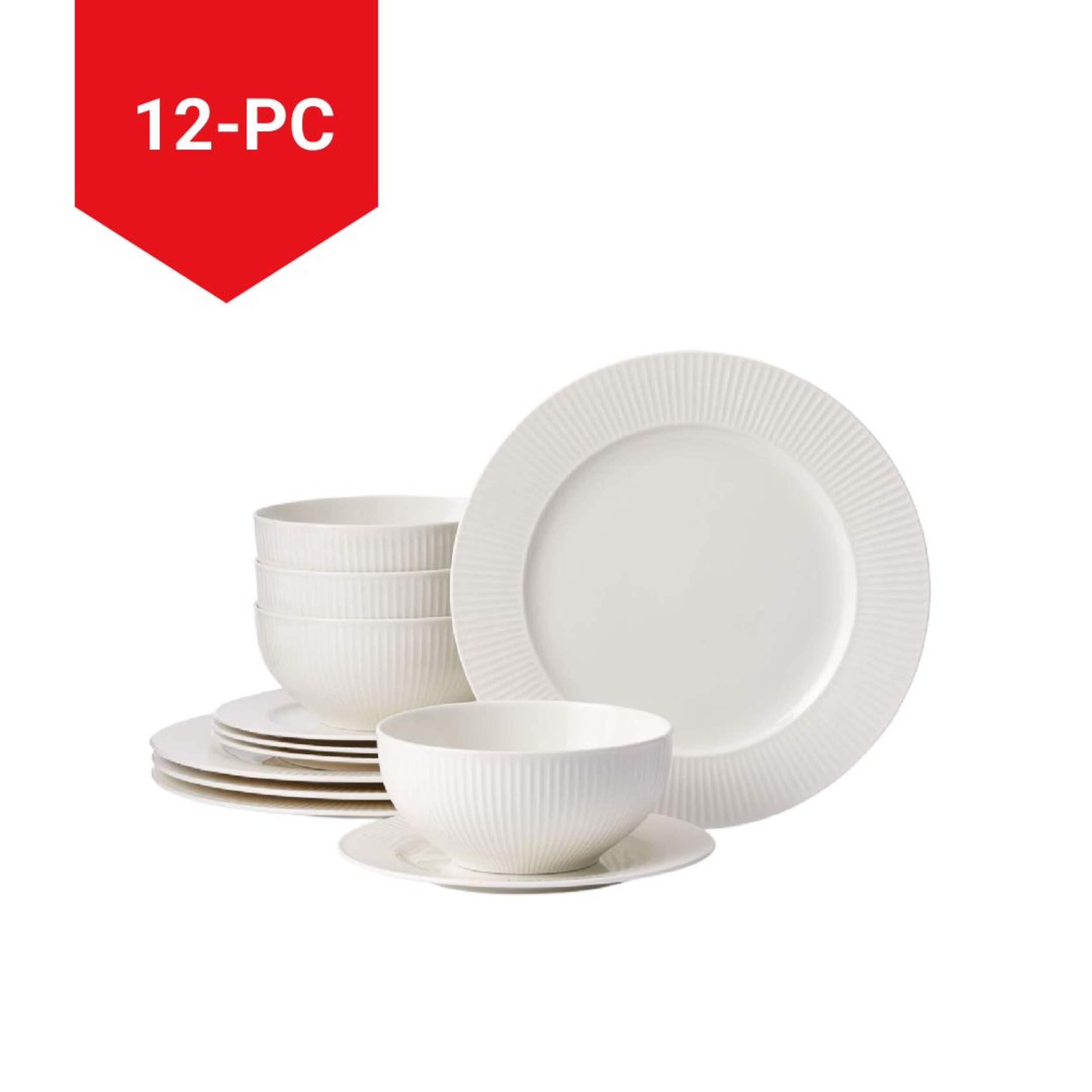 Comprend (4) assiettes à dîner de 27 cm (10-1/2 po), (4) assiettes à salade de 20 cm (8 po) et (4) bols peu profonds de 15,5 cm (6 po) pour un total de 12 pièces