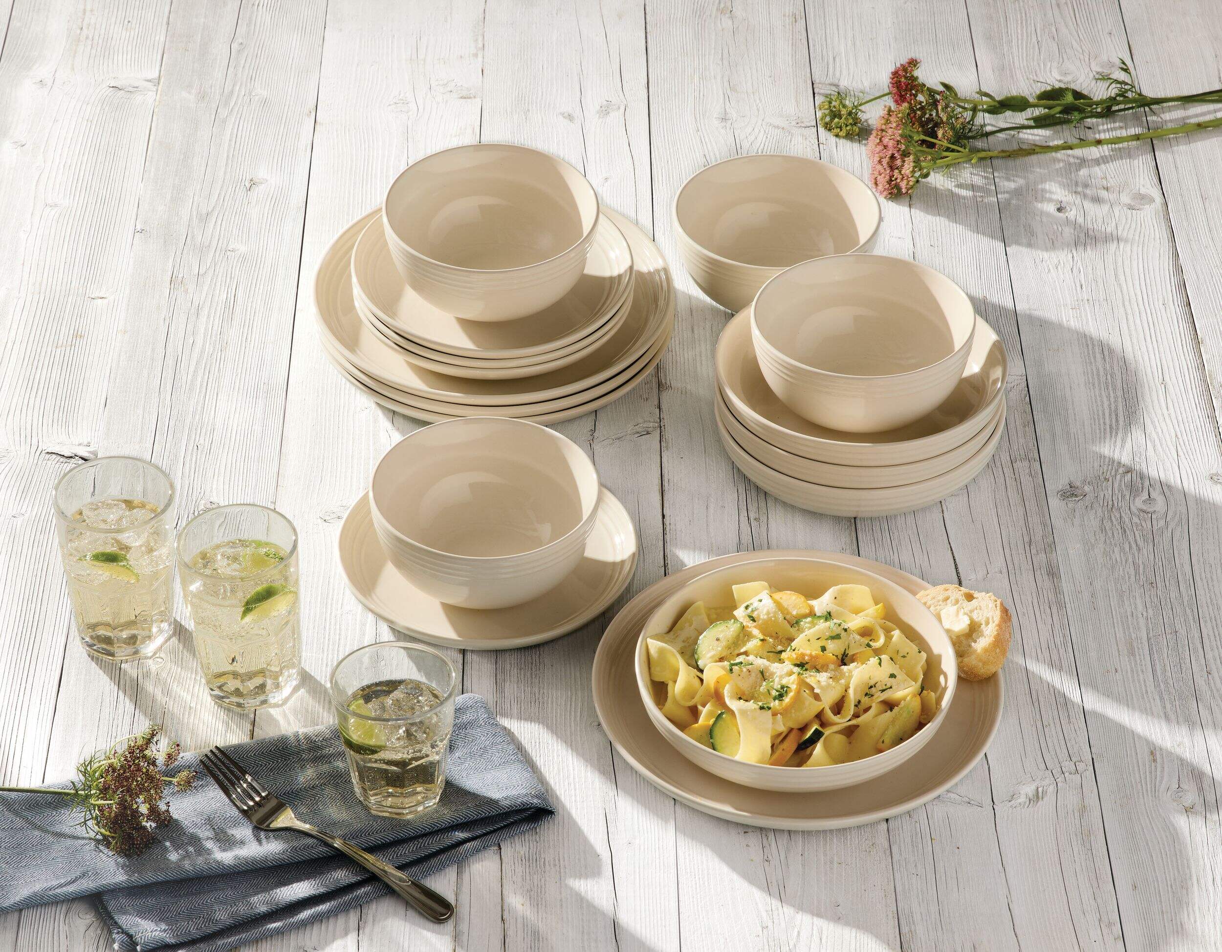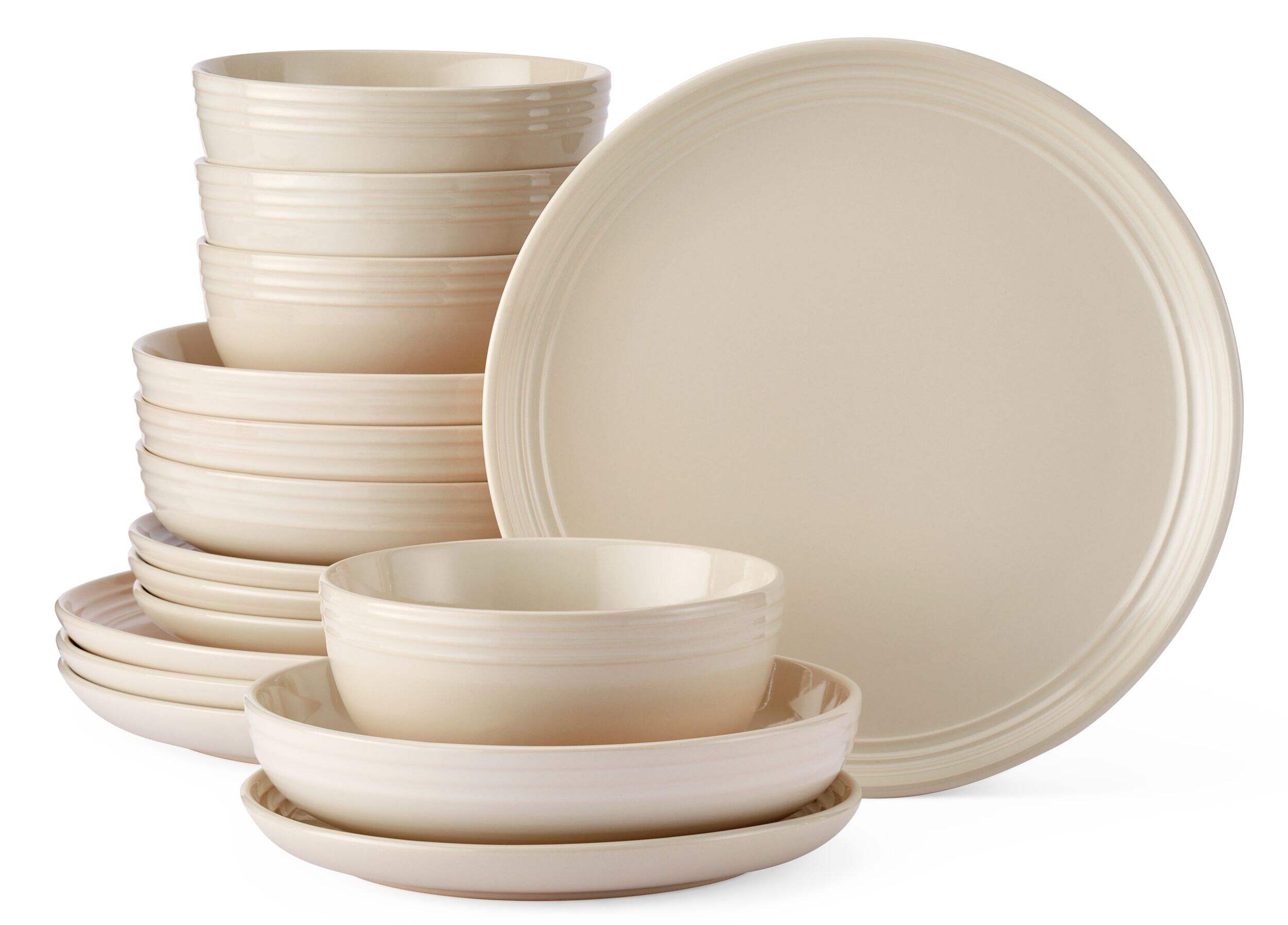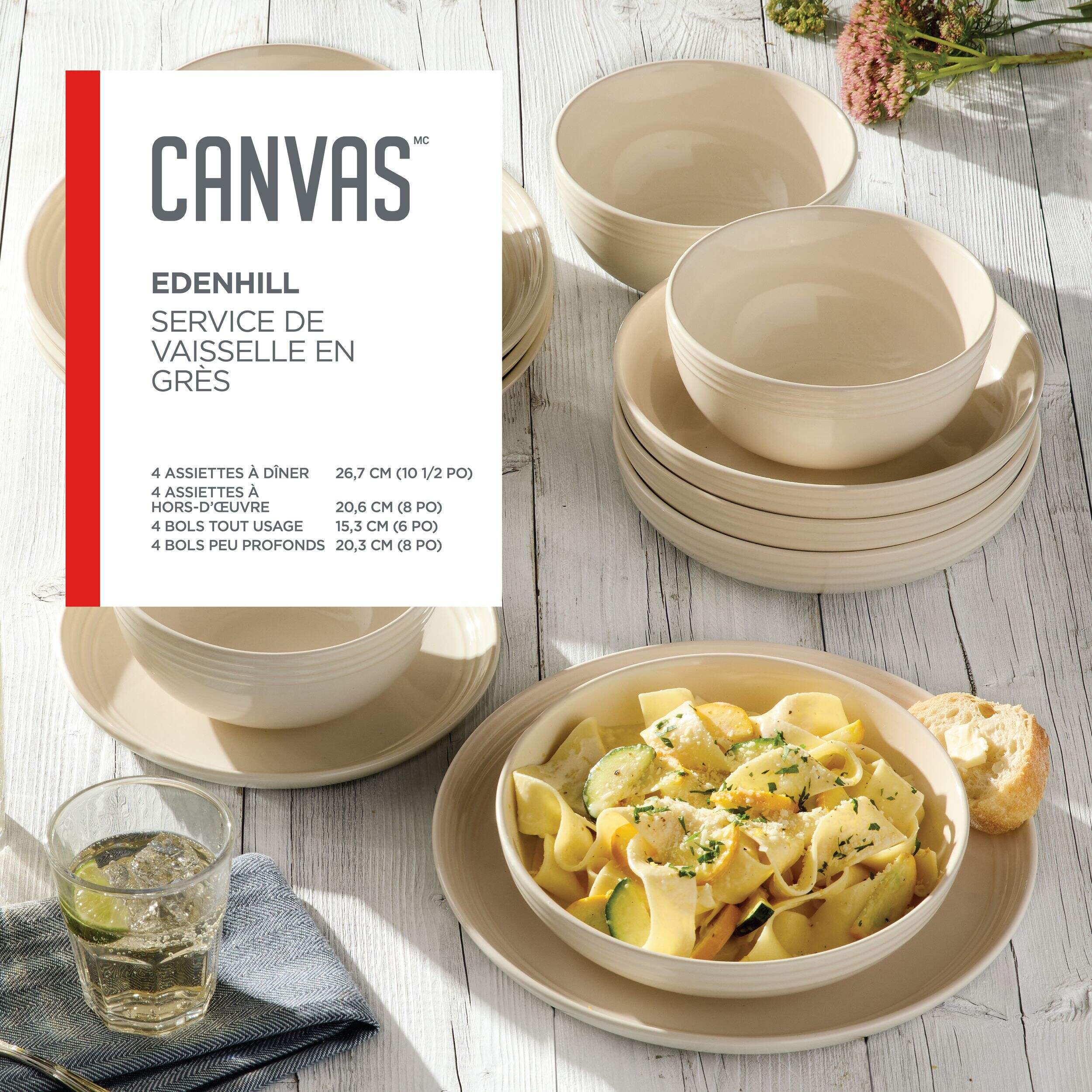 Comprend (4) assiettes à dîner de 26,7 cm (10-1/2 po), (4) assiettes à salade de 20,6 cm (8 po), (4) bols tout usage de 15,3 cm (6 po) et (4) bols peu profonds de 20,3 cm (8 po) pour un total de 16 pièces