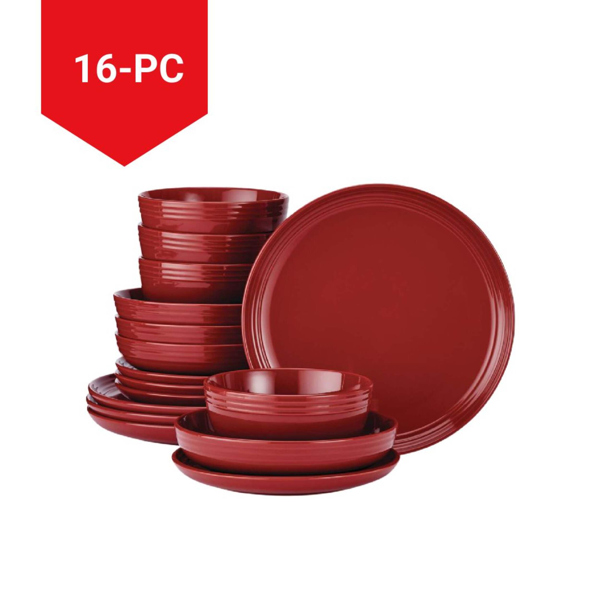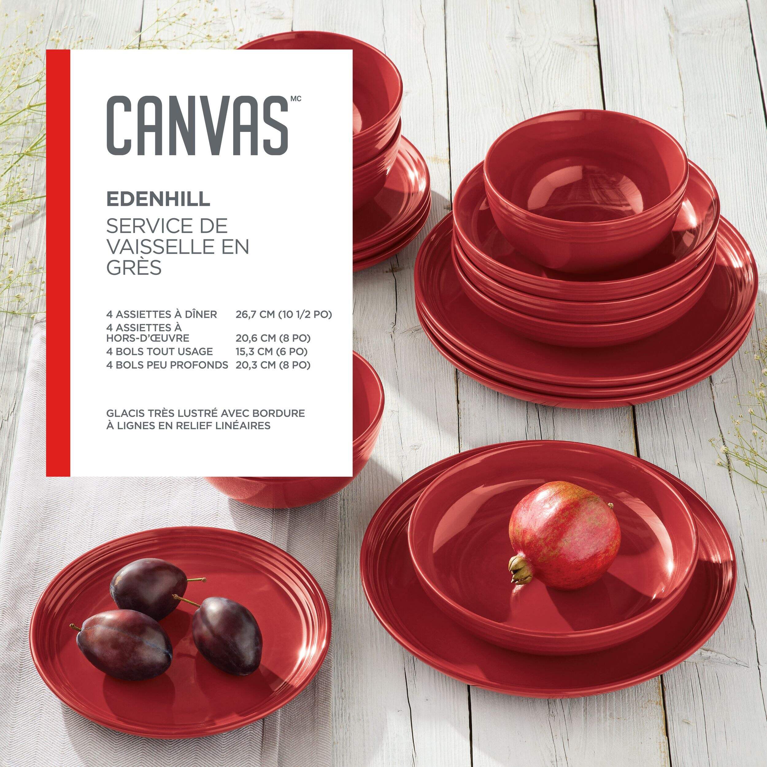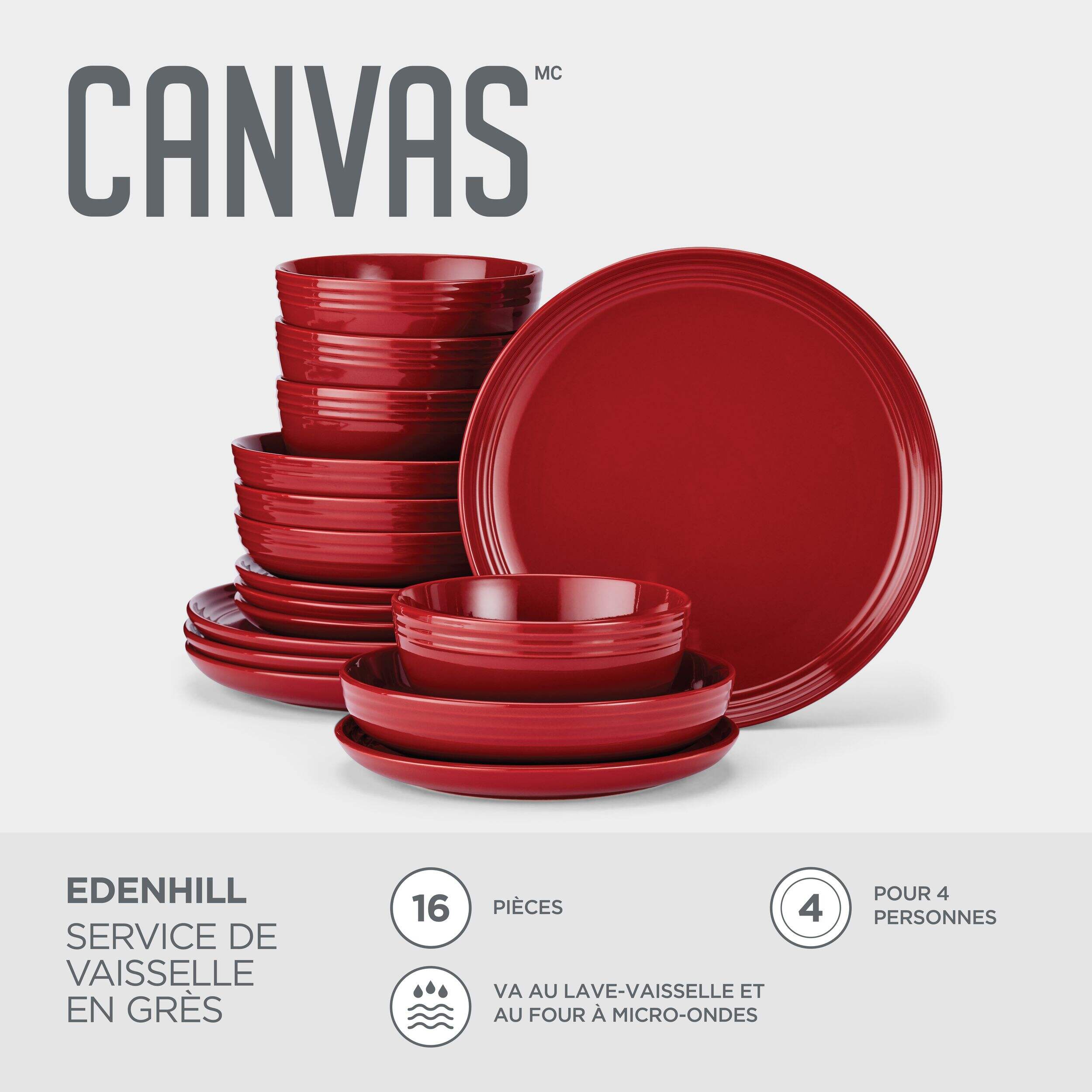Comprend (4) assiettes à dîner de 26,7 cm (10-1/2 po), (4) assiettes à salade de 20,6 cm (8 po), (4) bols tout usage de 15,3 cm (6 po) et (4) bols peu profonds de 20,3 cm (8 po) pour un total de 16 pièces
