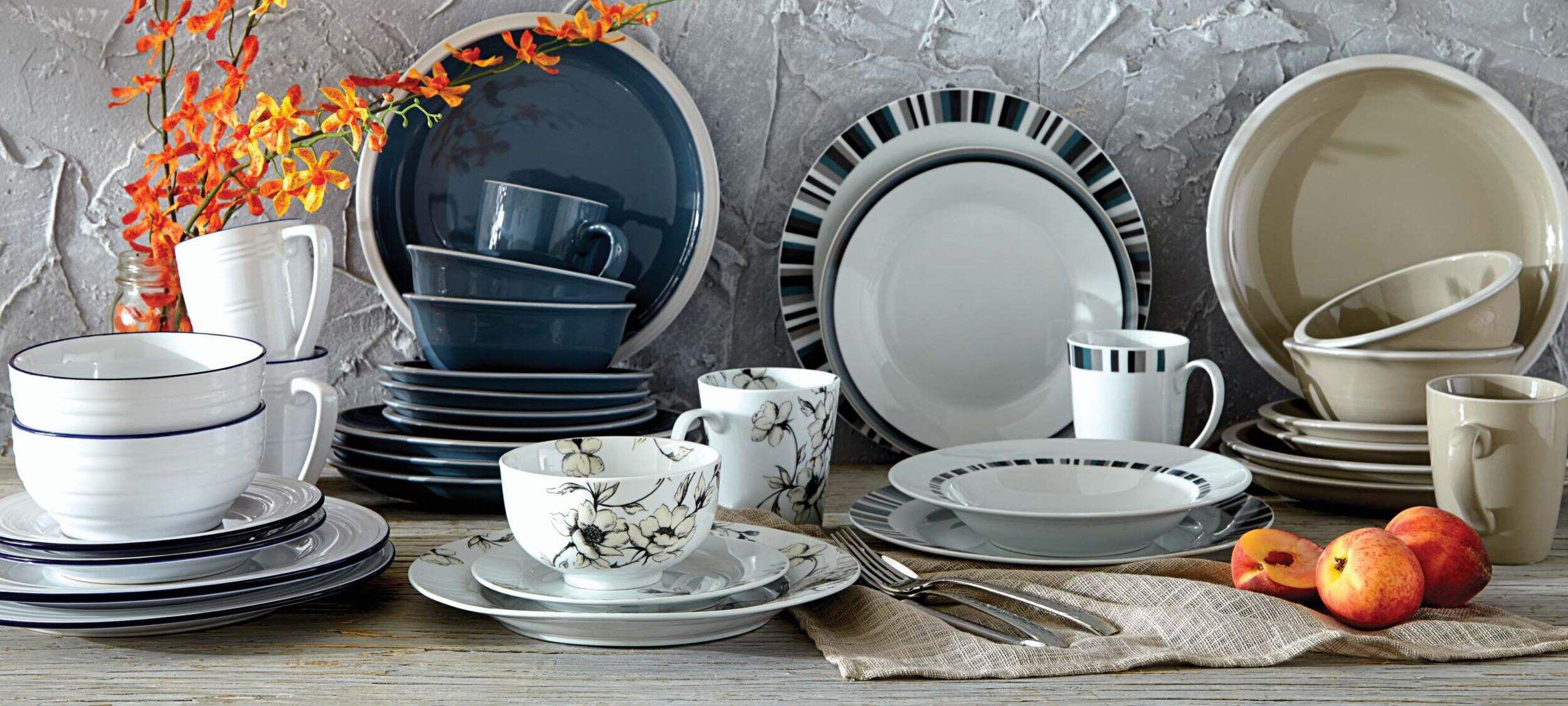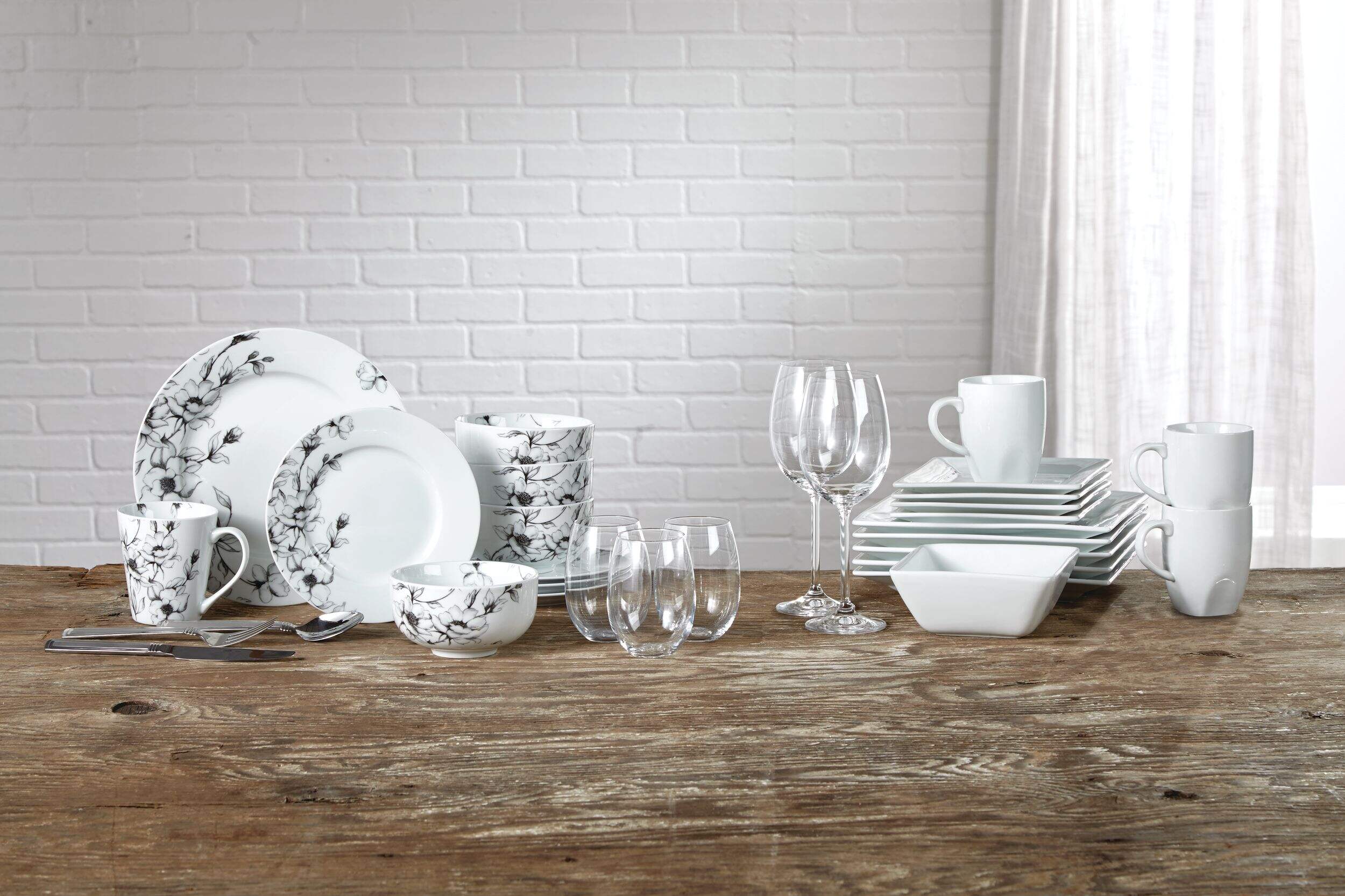 Dimensions : assiettes à dîner : 27 cm (10,6 po); assiettes à salade : 19 cm (7,4 po); bols : 13 cm (5 po); tasses : 350 mL (11,8 oz)