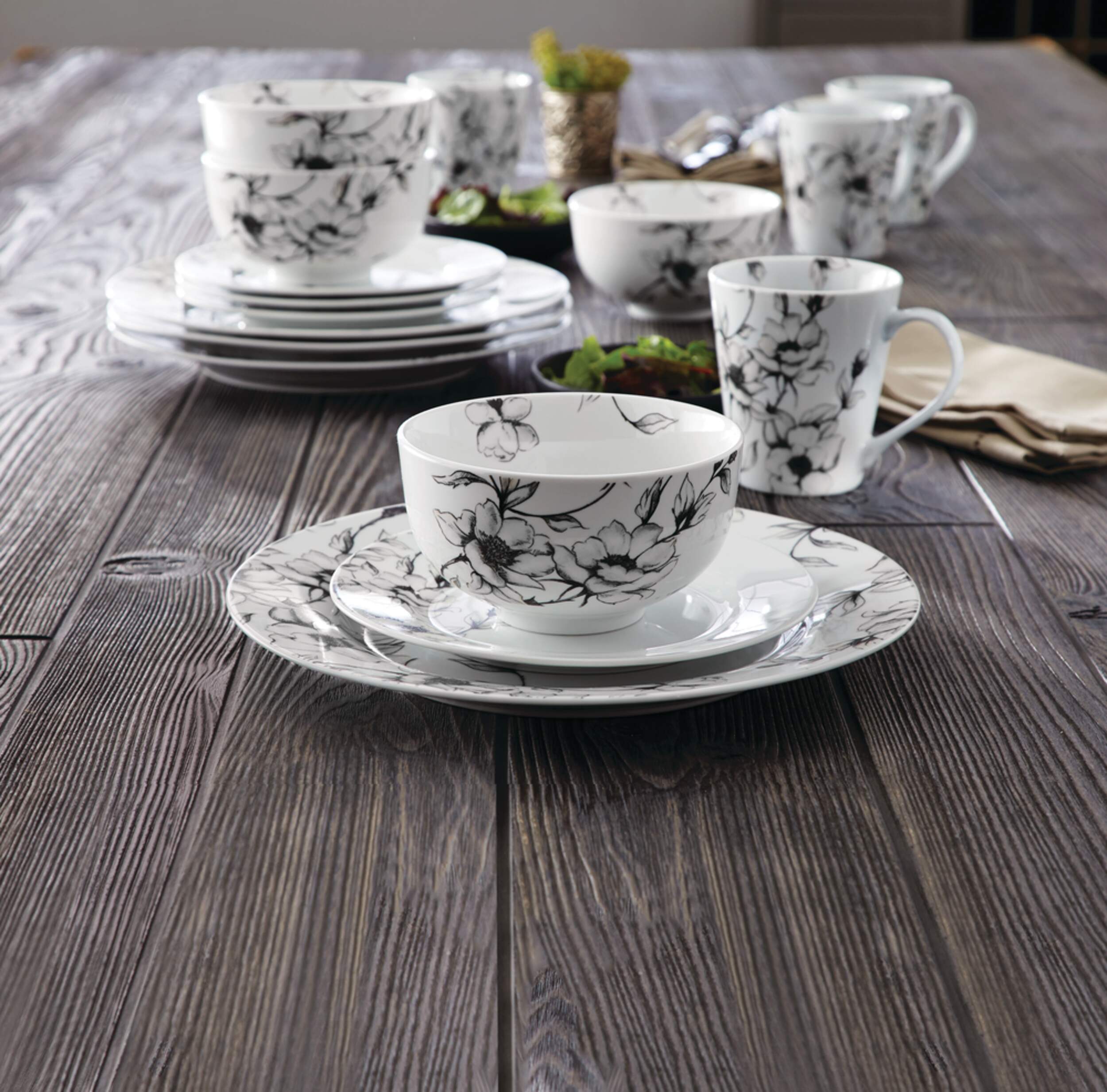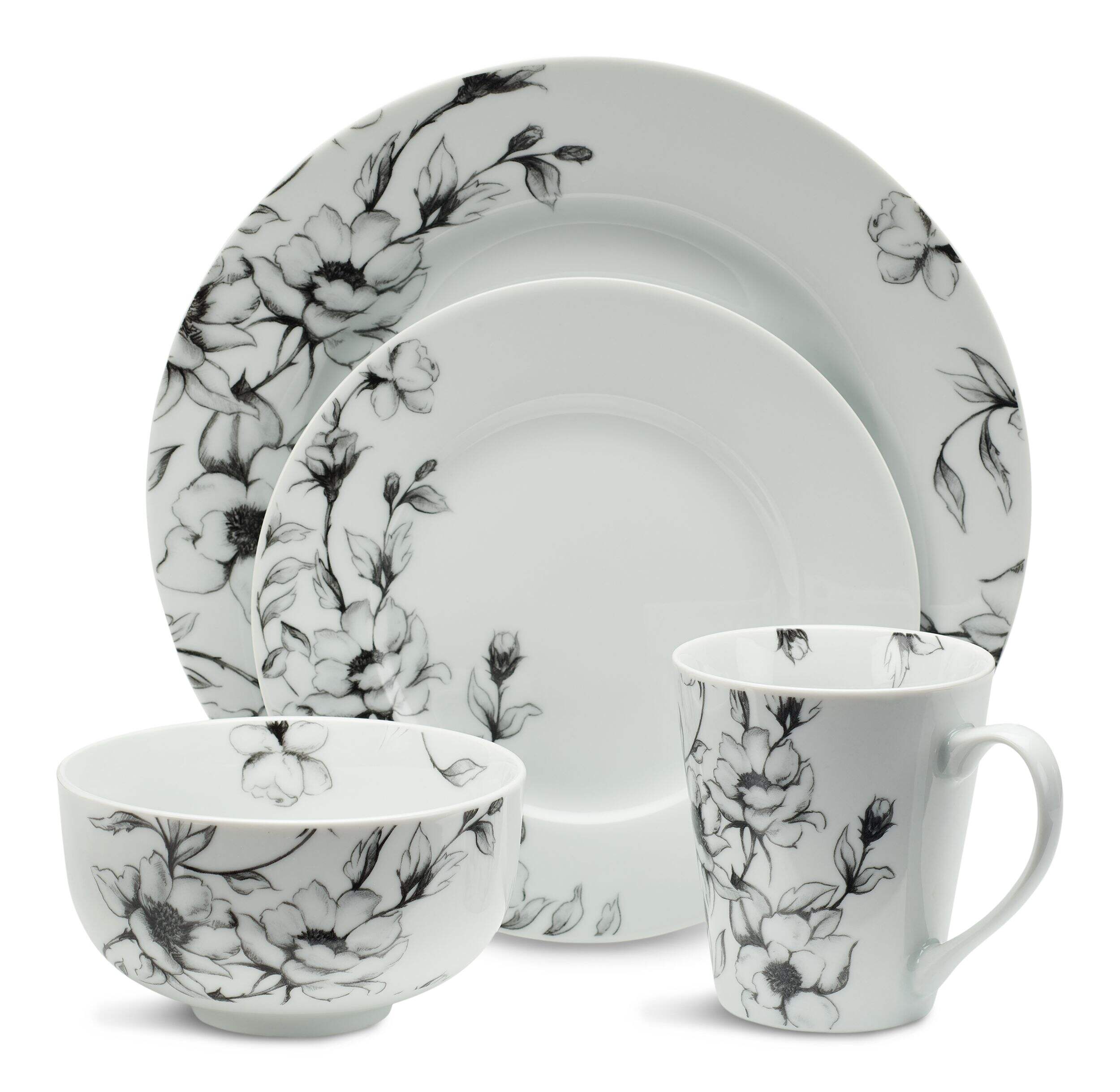 Comprend : 4 assiettes à dîner, 4 assiettes à hors-d'oeuvre, 4 bols et 4 tasses