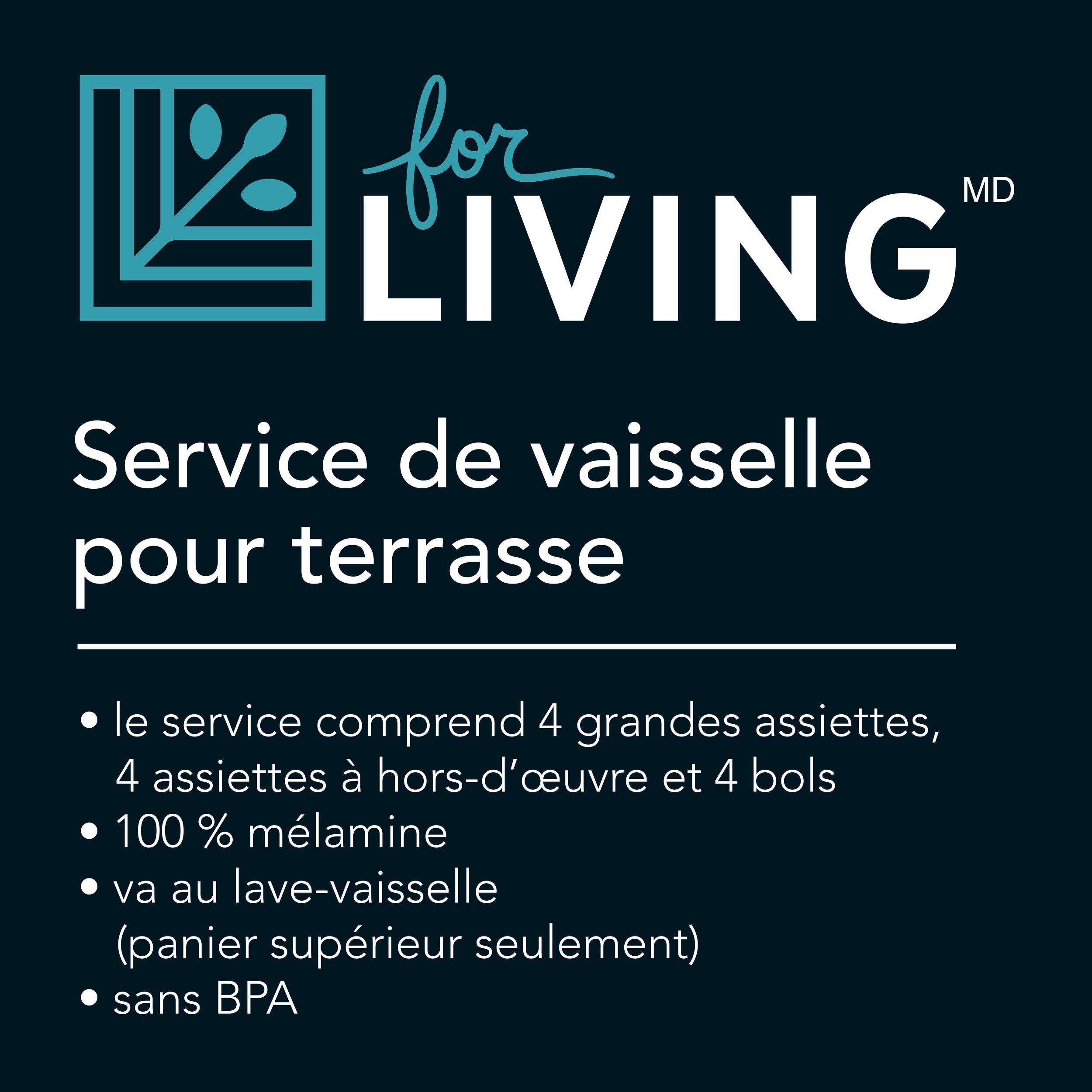 Doté de 4 assiettes à dîner, 4 petites assiettes et 4 bols en mélamine durable, le service de vaisselle de terrasse For Living est indispensable pour les familles qui veulent aiment leur souper et dessert dans l'arrière-cour ou autour d'un feu de camp. Ces 12 pièces sans BPA, vont au lave-vaisselle pour un nettoyage facile, ce qui vous permet de profiter de votre souper et de votre dessert sans vous soucier d'un nettoyage fastidieux. Ce service de vaisselle est également idéal pour le camping.