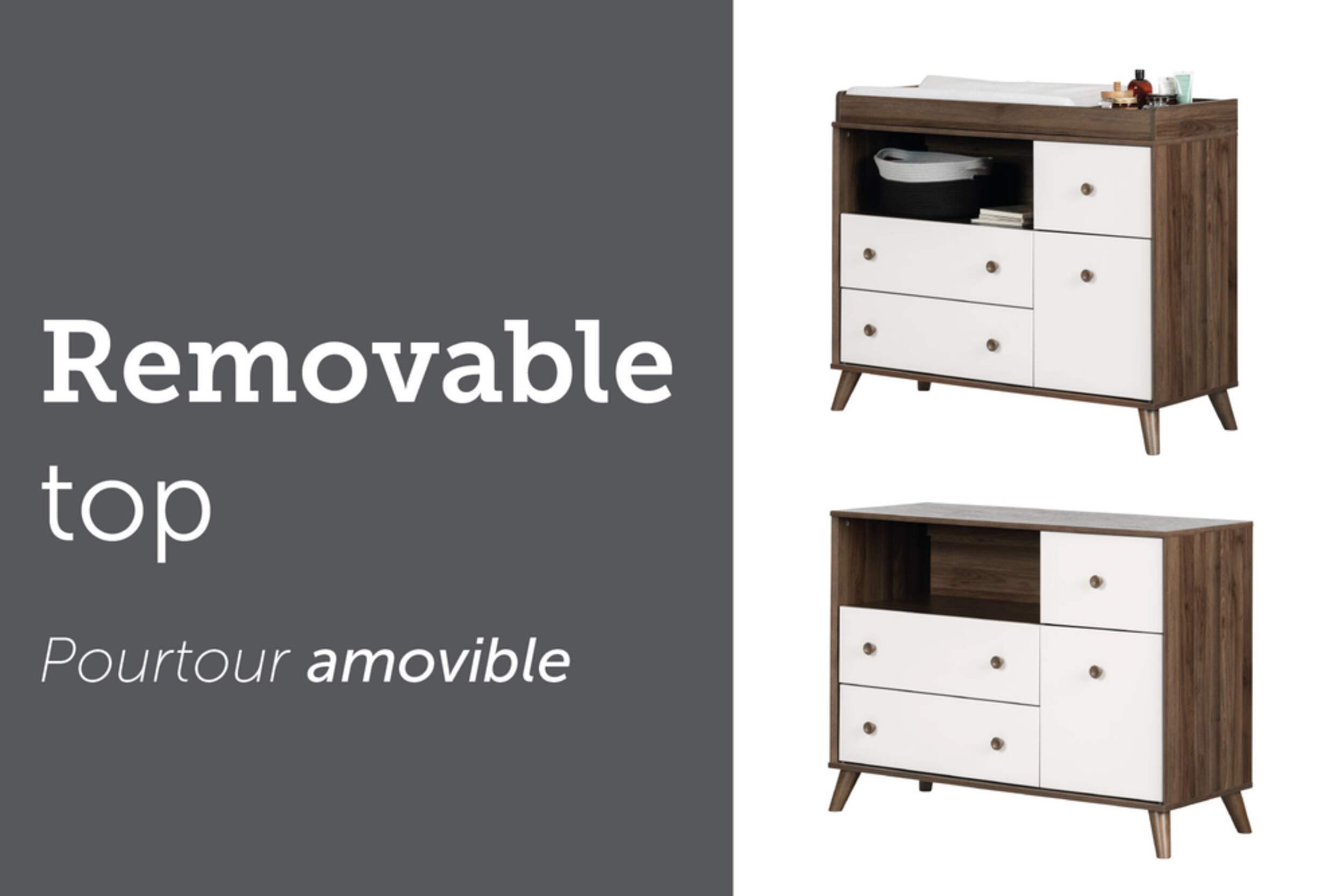 La table à langer Yodi avec tiroirs vous permet de ranger les articles essentiels de votre bébé à portée de main. 4 tiroirs s'ouvrant en douceur offrent un vaste espace de rangement pour les couches, les lingettes, les couvertures et plus encore, tandis que la table offre de l'espace pour les matelas à langer et les fournitures. La table à langer minimaliste est dotée de lignes épurées et d'un fini noyer accentué par des tiroirs blancs qui s'agencent avec n'importe quel décor de chambre de bébé. Construction en bois durable et glissières de tiroir en métal garantissant des années d'utilisation fiable. Les parents apprécieront la sécurité, la commodité et le style scandinave de cette table à langer fonctionnelle.