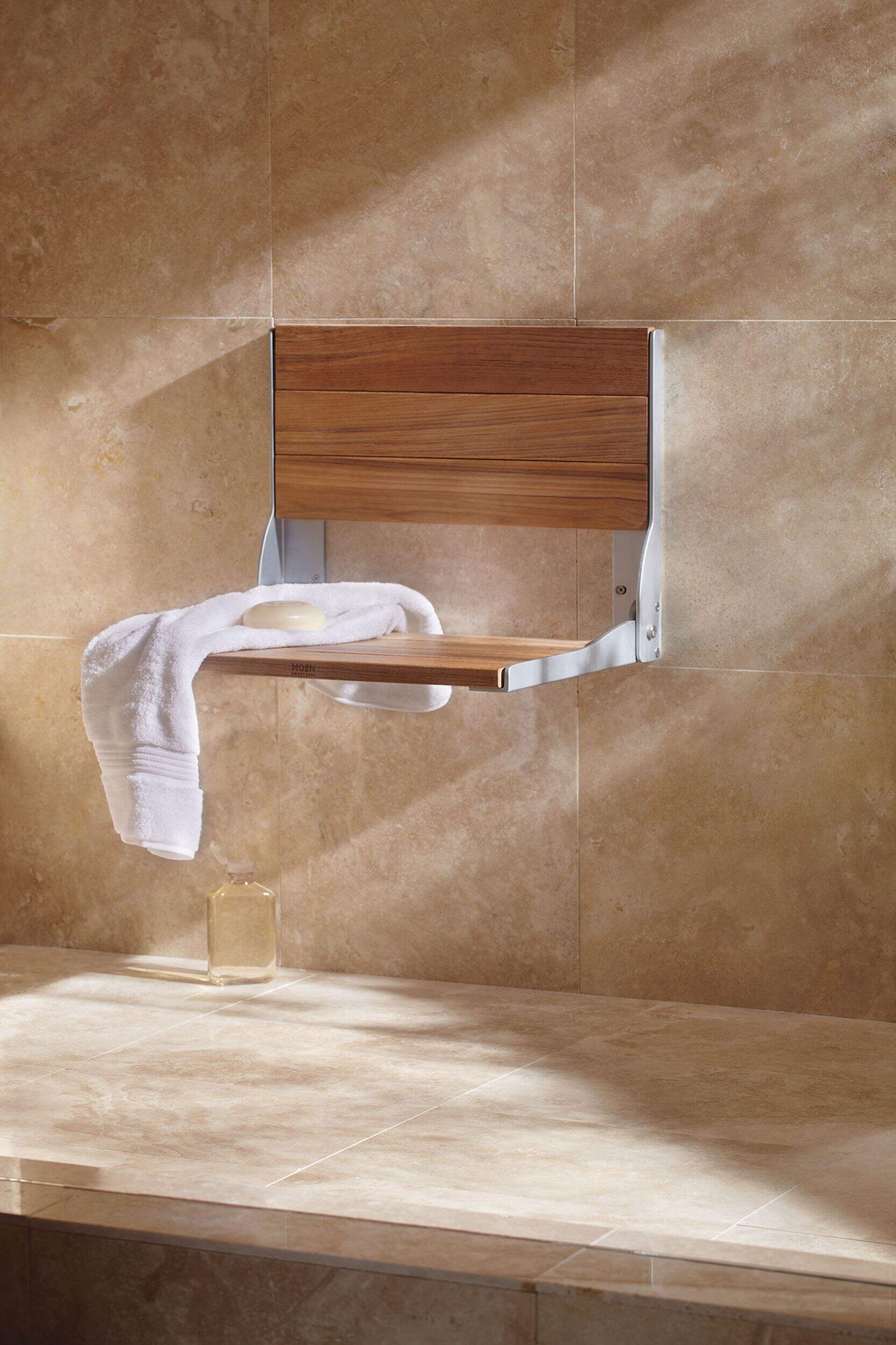 Siège de douche à montage mural en aluminium pliable Moen doté d'un cadre en aluminium robuste et de bois de teck hydrofuge
